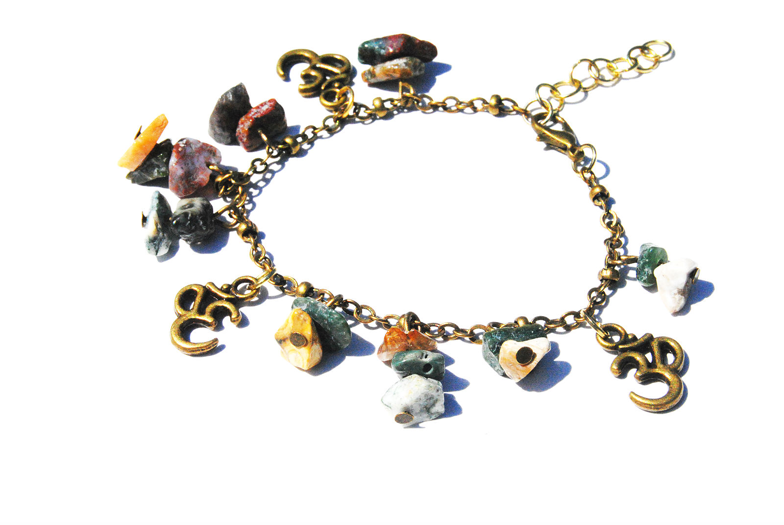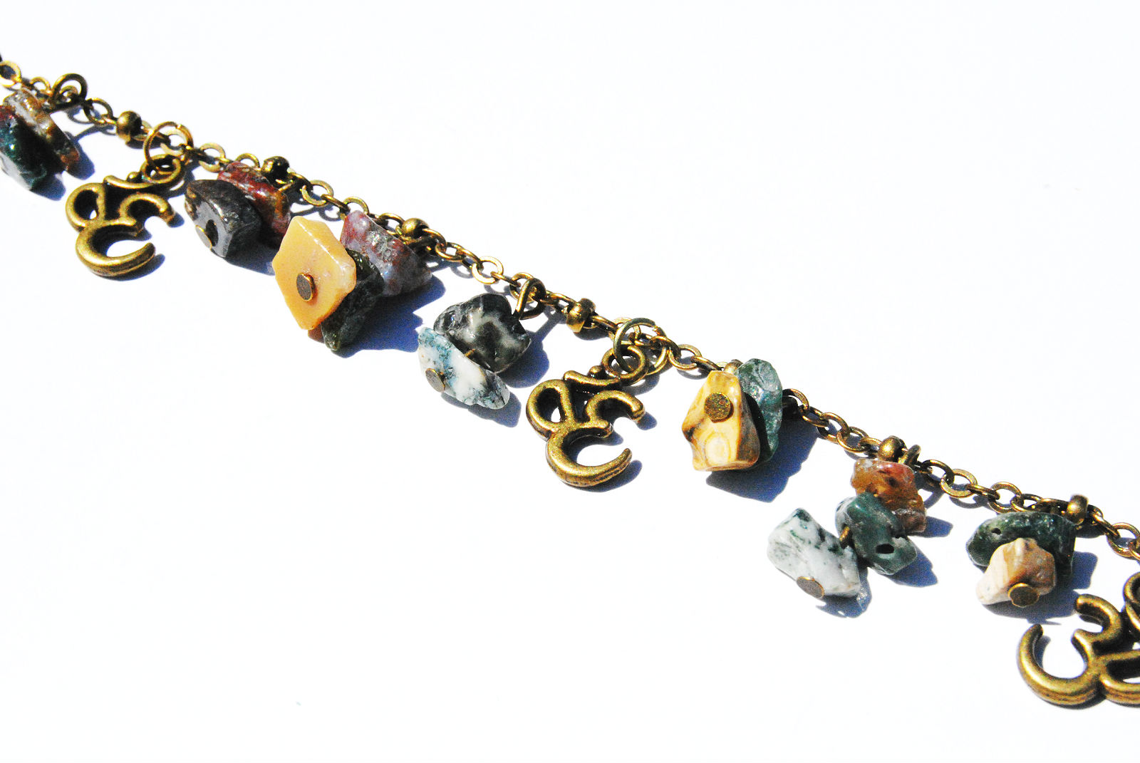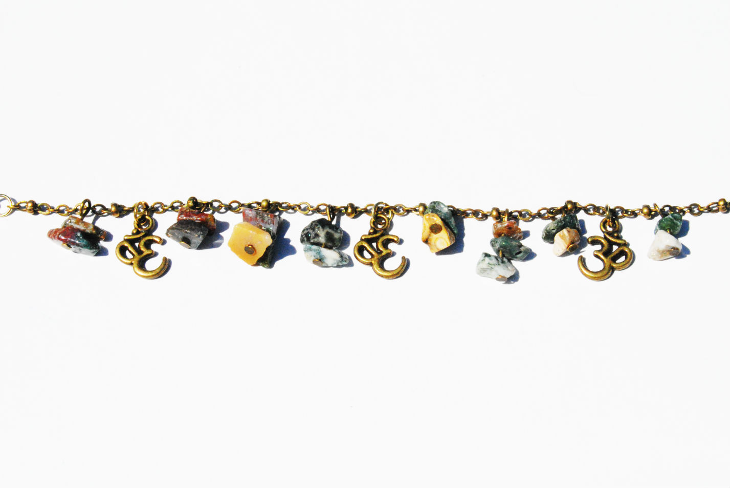 This bracelet features multi-colored ocean jasper chip clusters and three brass om charms on a 7-8 inch long brass chain.
