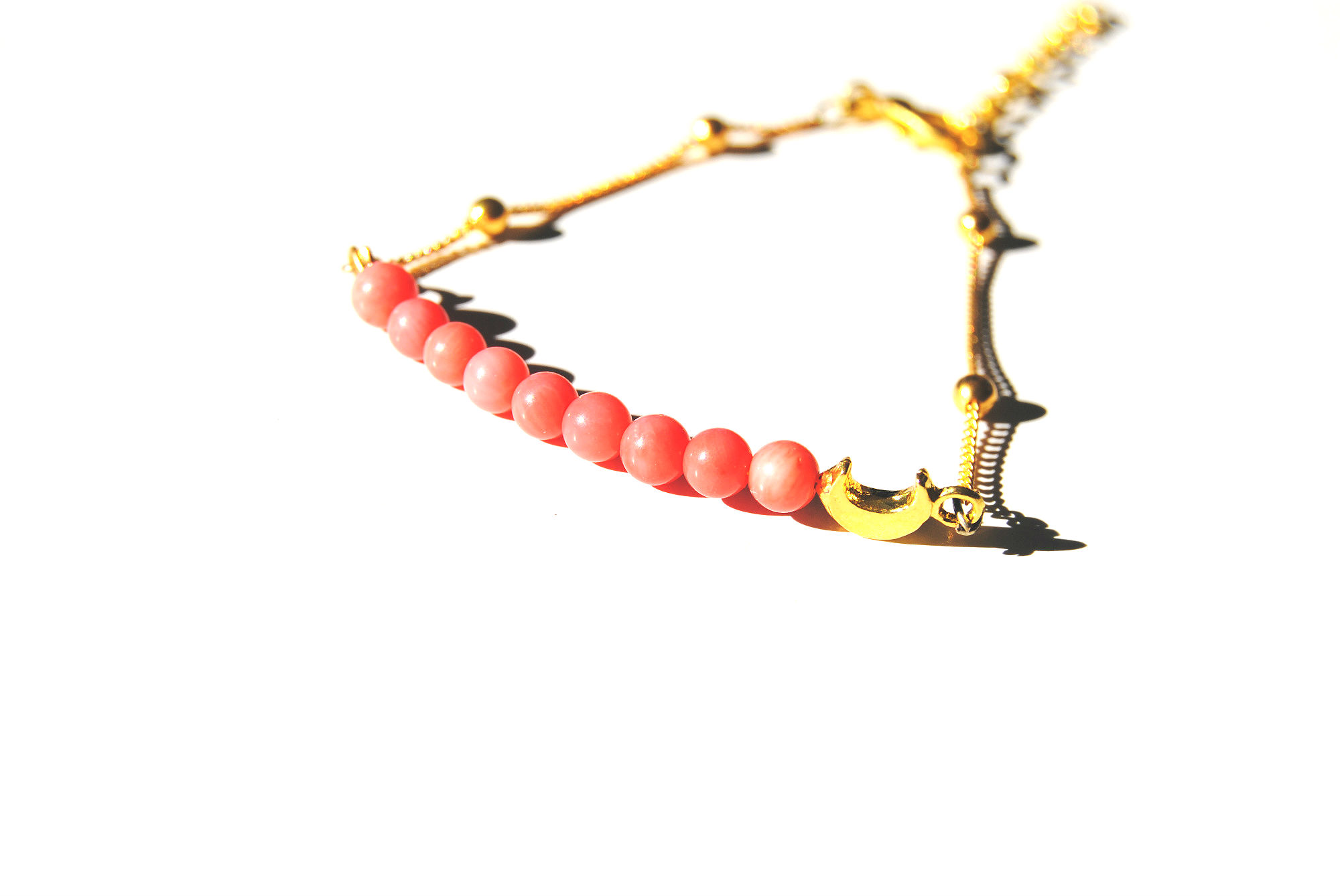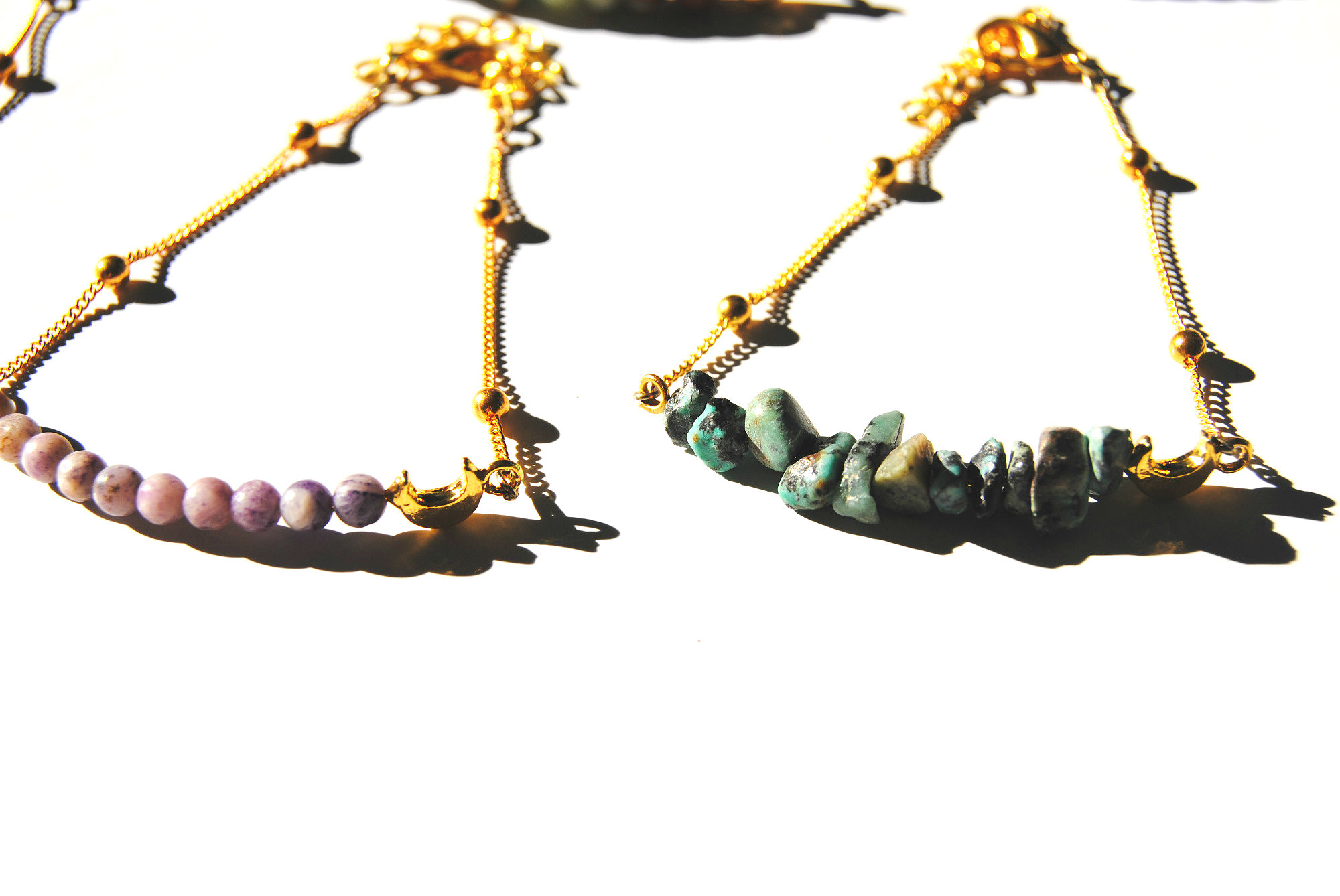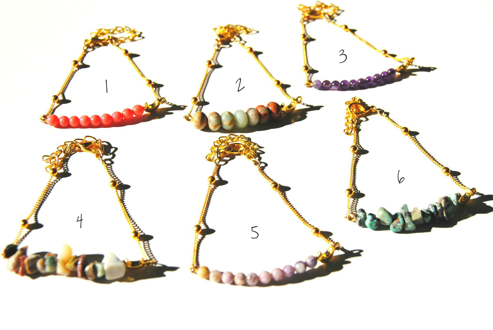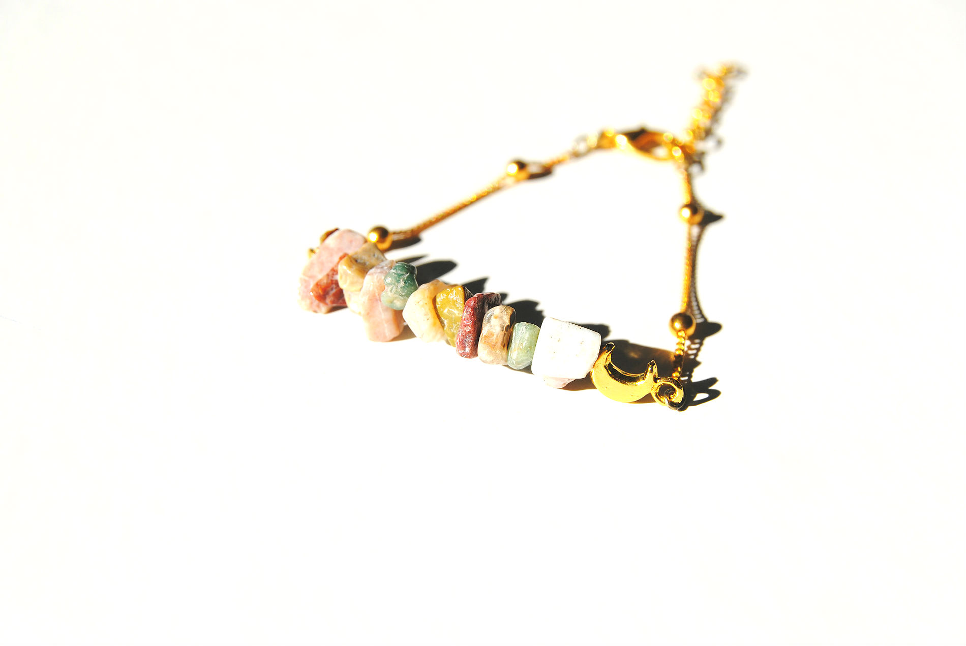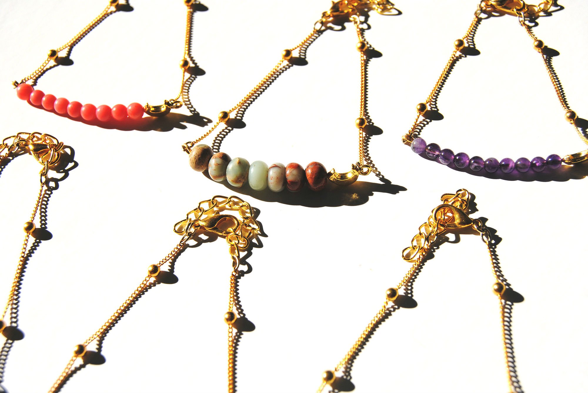 These delicate bracelets feature a carefully selected assortment of natural beads or chips, a mini moon charm, and a gold plated chain and lobster clasp closure. Measures 7-9 inches long. Stones include coral, snake skin jasper, dark amethyst, ocean jasper, light amethyst, and African turquoise.