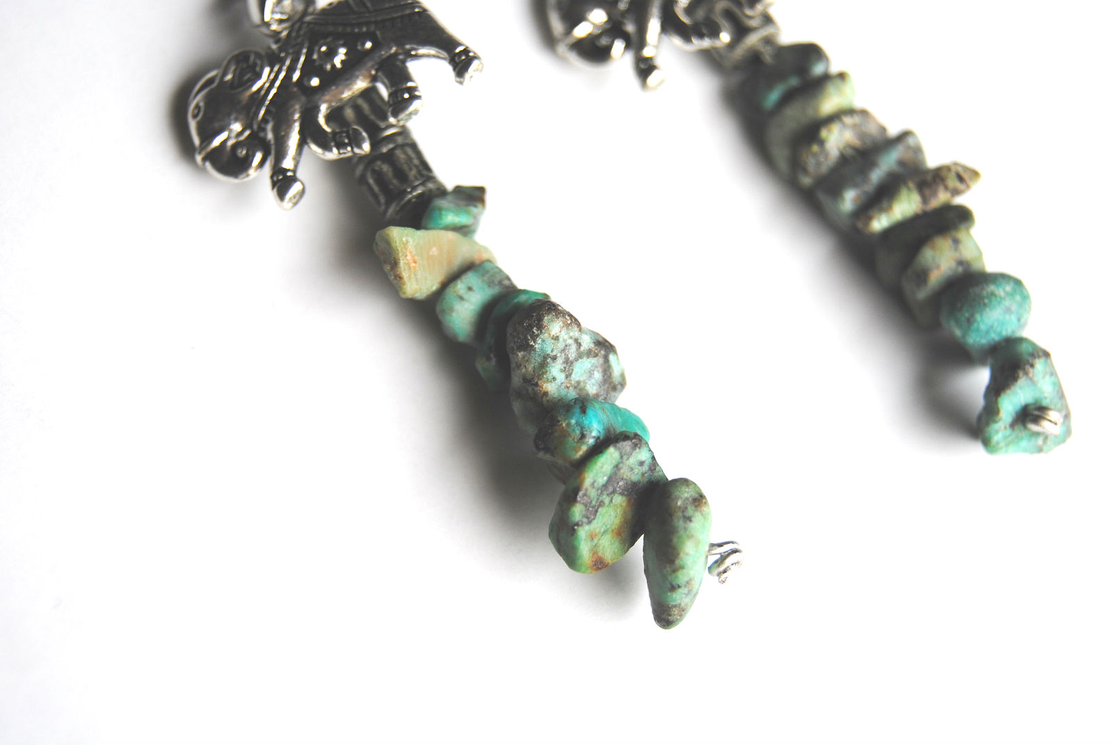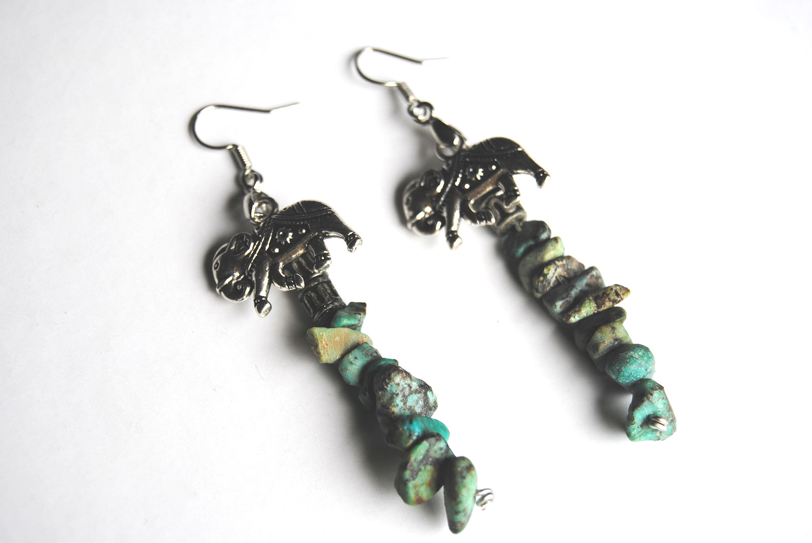 Silver toned elephant charms stand atop a stack of turquoise African jasper chips.
