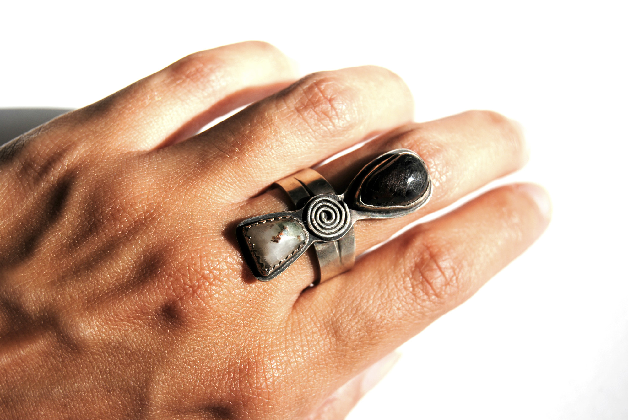 This ring features a black teardrop stone, a white half-rounded stone with green and red inclusions, and a sterling silver swirl. Features a stamped moon band. Size 6.25.