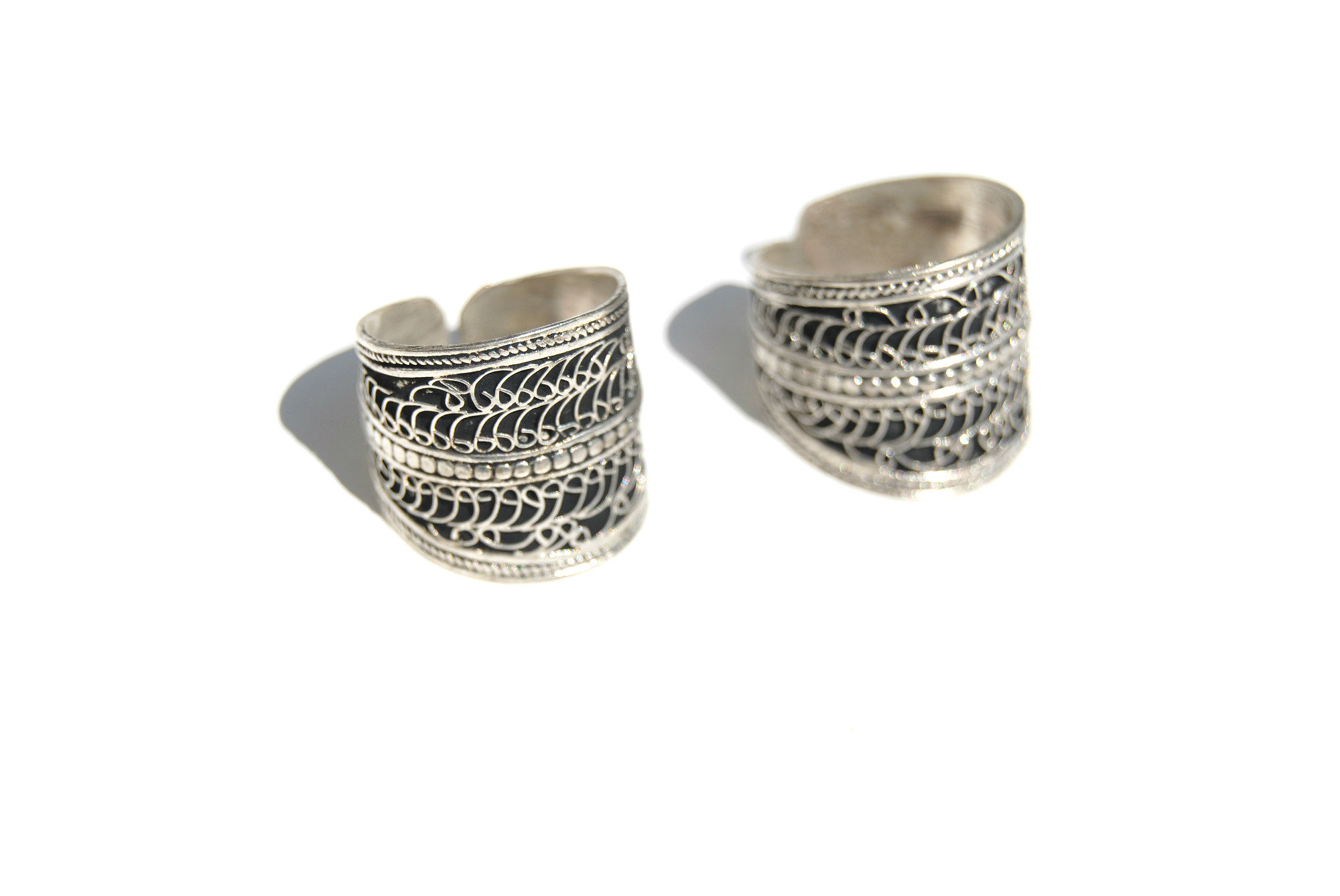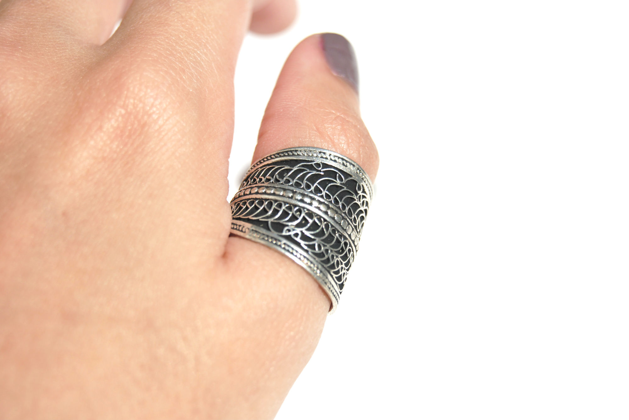 Double layered filigree with a dotted pattern in the center. Silver plated copper. Size 7 & up. Adjustable.