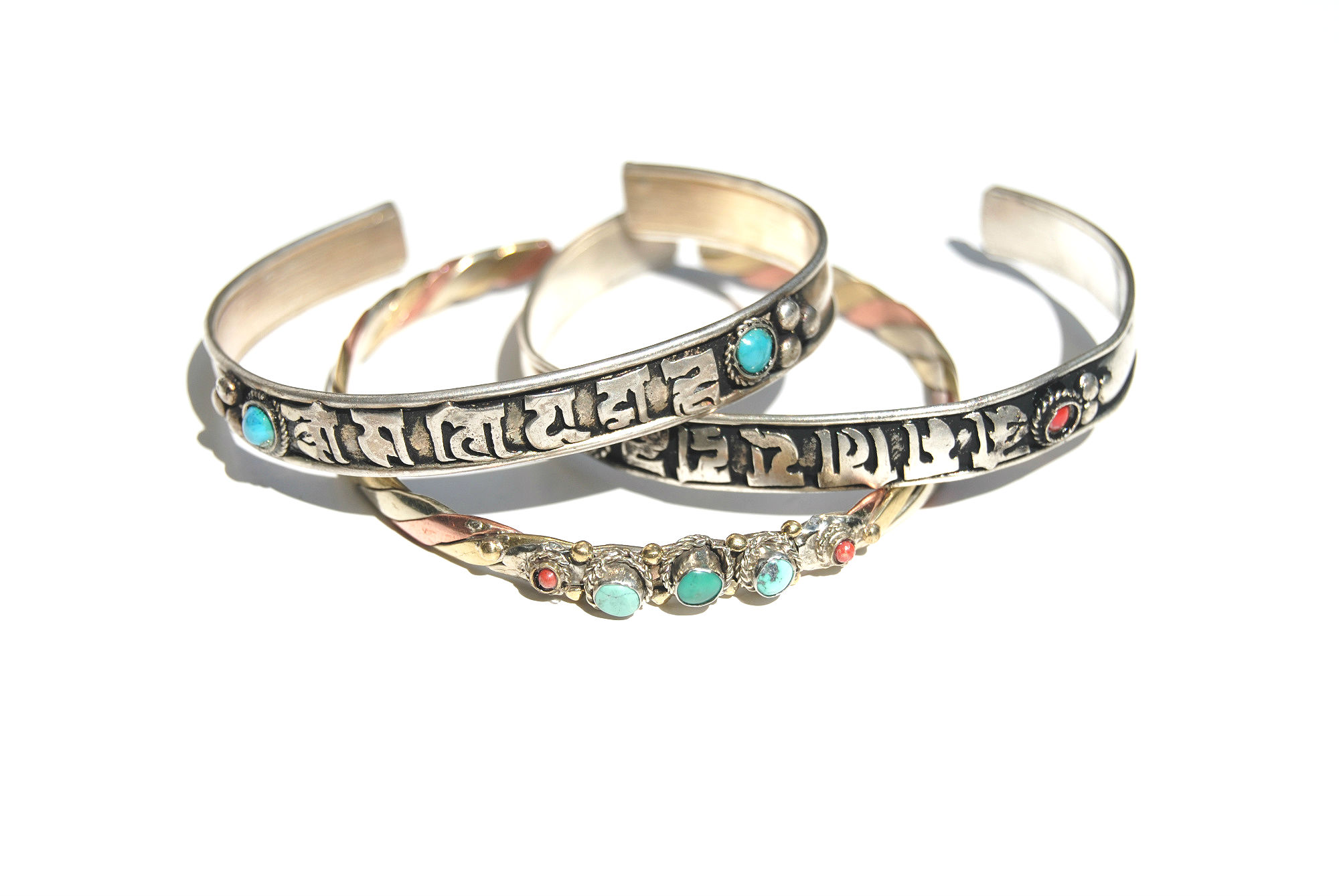 This bangle cuff features twisted copper, silver plated copper, and gold plated copper. It is adorned with three natural turquoise stones and two tiny dots of coral. Measures about 6.75 inches in length.