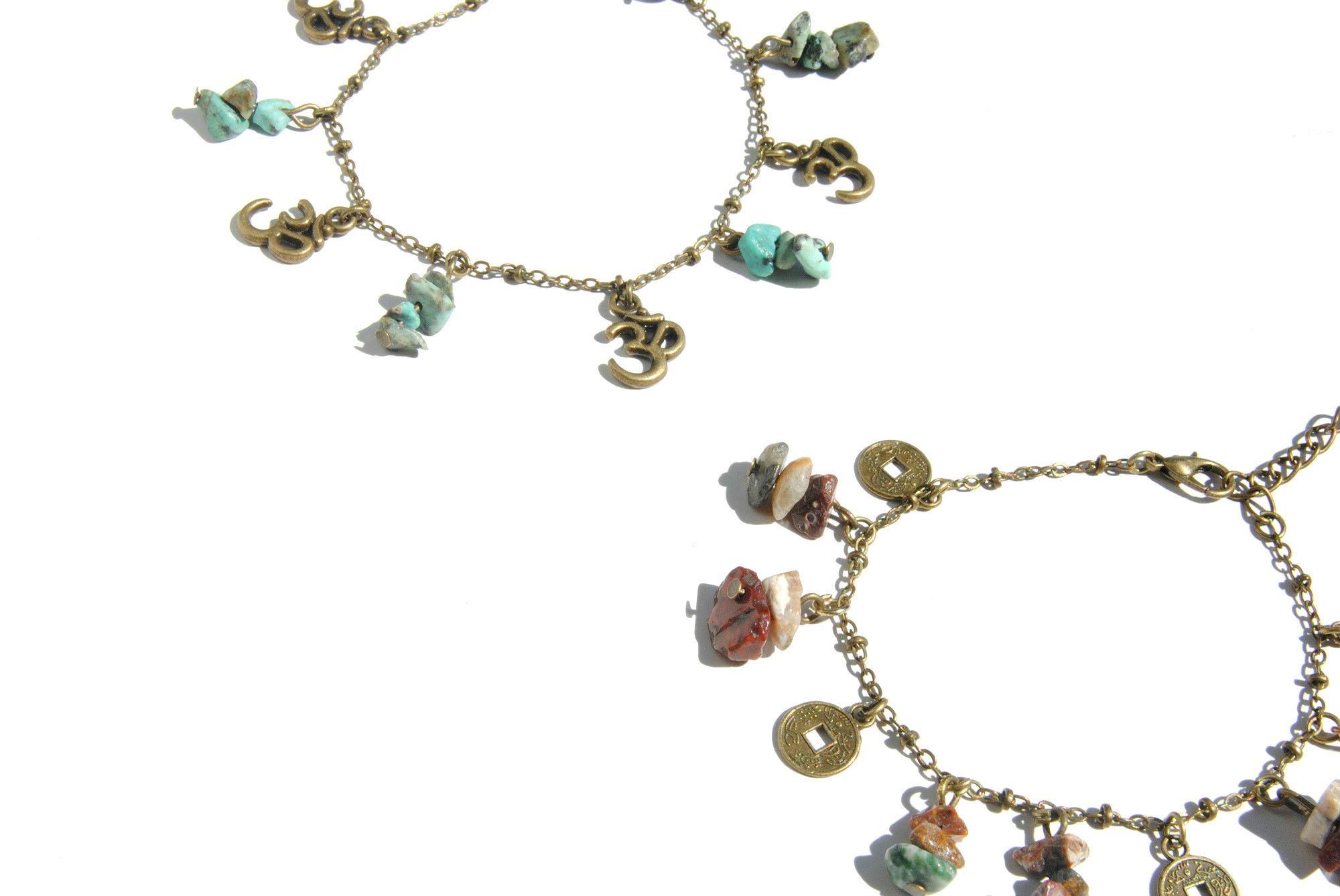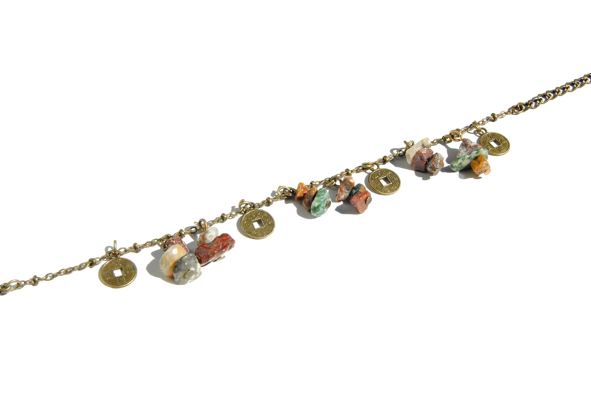 This bracelet features four Asian replica coins with meticulously chosen ocean jasper chips in between.