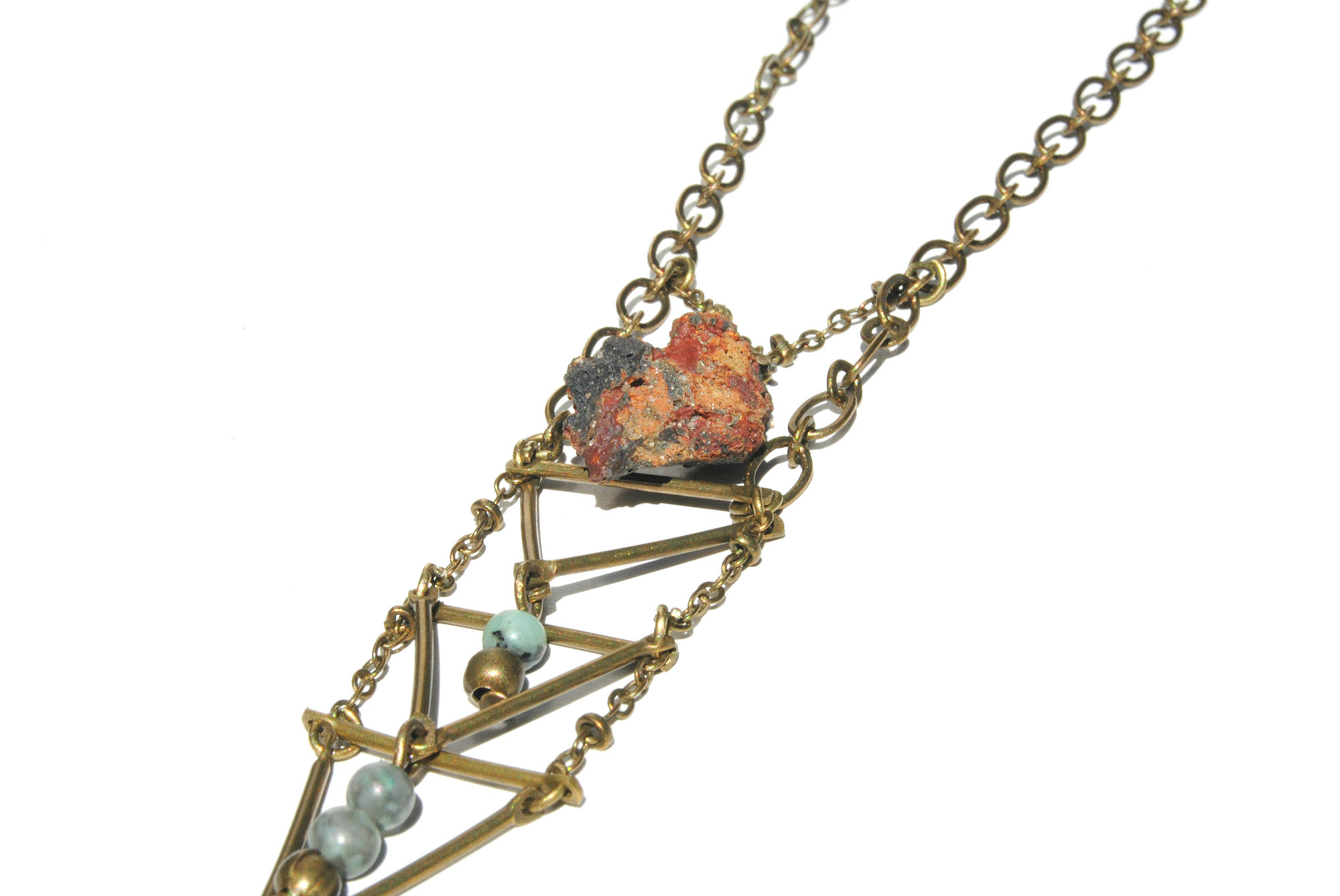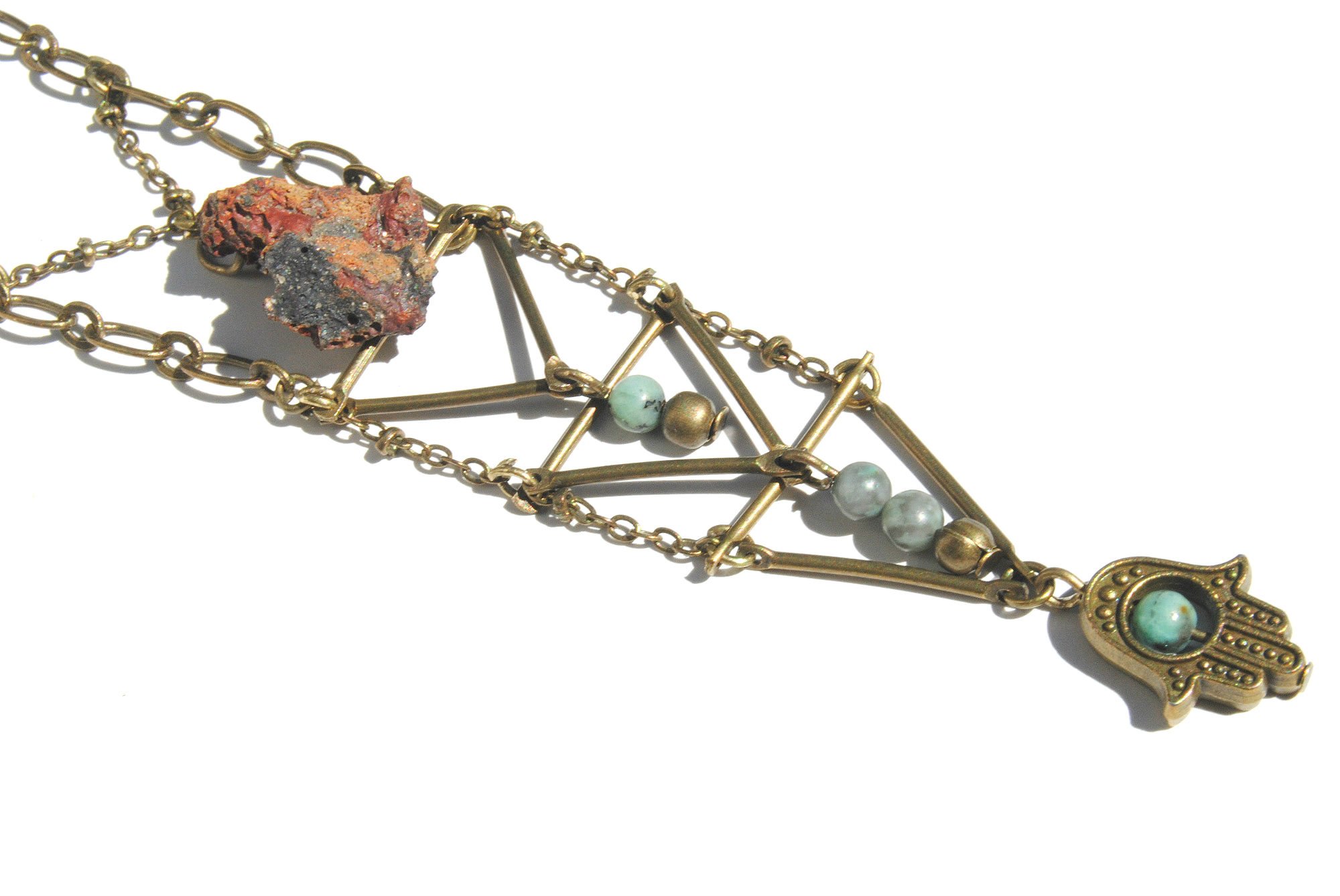 This geometric necklace features a natural red river rock hand picked by me from a local nature reserve. It also features three triangular shapes, turquoise jasper mini beads, and a hamsa charm. All hung on a thick linked 21 inch bronze toned copper chain. Lobster clasp closure. Pendant measures about 4 inches long.