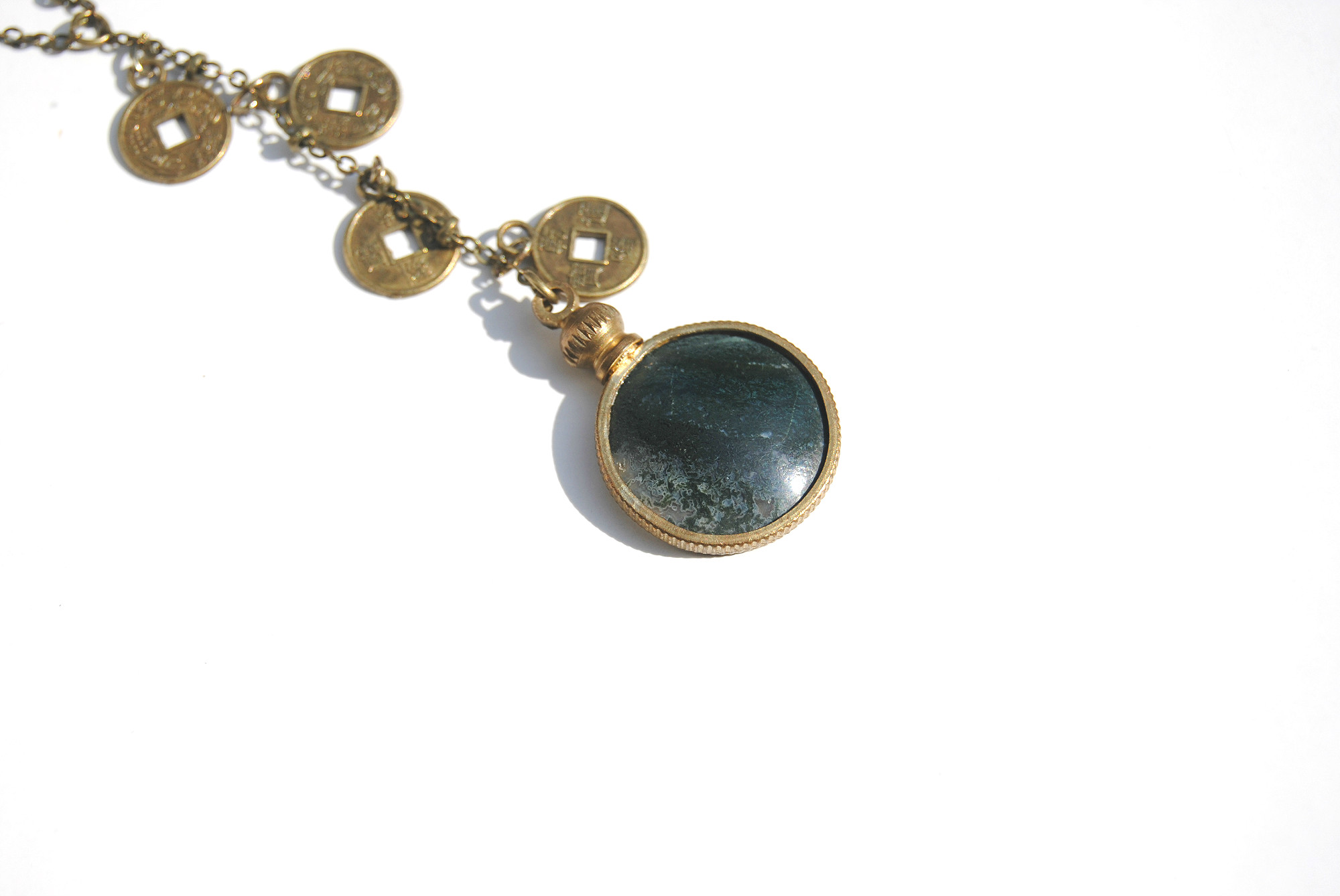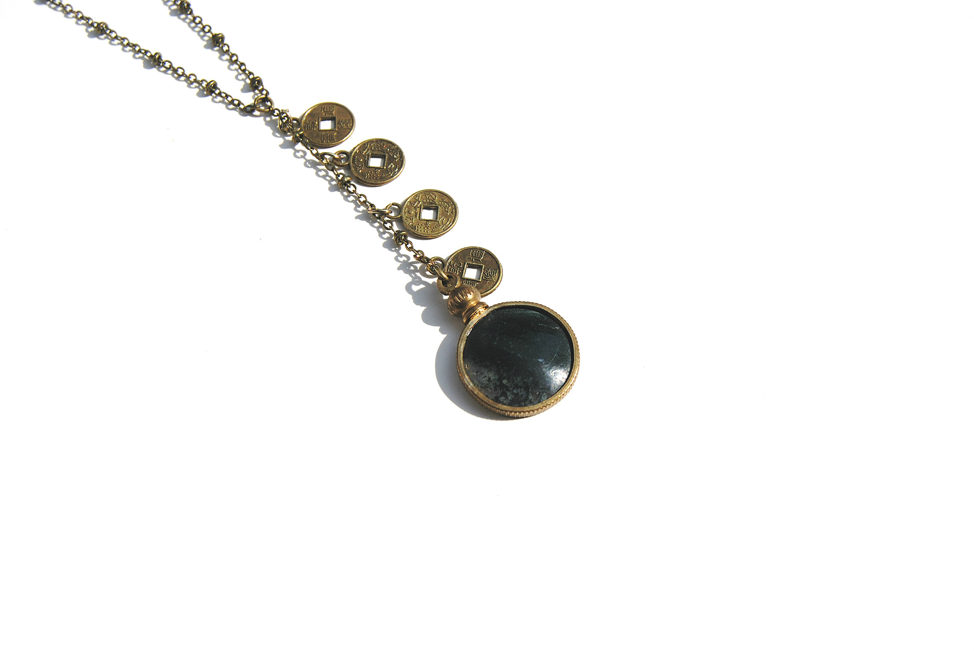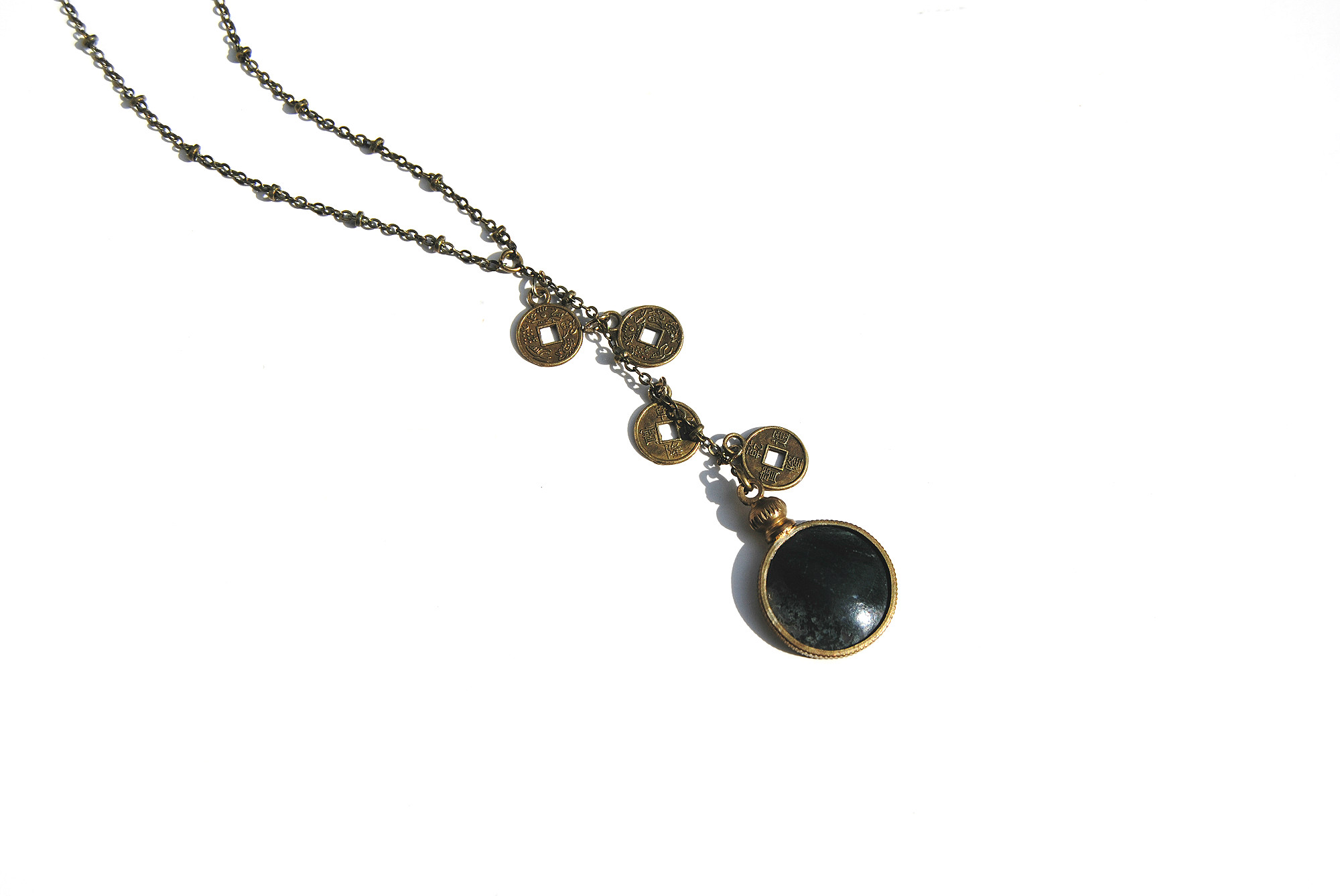 From the Unknown Collection. Four replica Asian coins dangle above a deep green stone encased in an antiqued bezel. Hangs on a 20 inch antiqued brass coated copper chain with a lobster clasp closure. Stone pendant measures an inch in length.