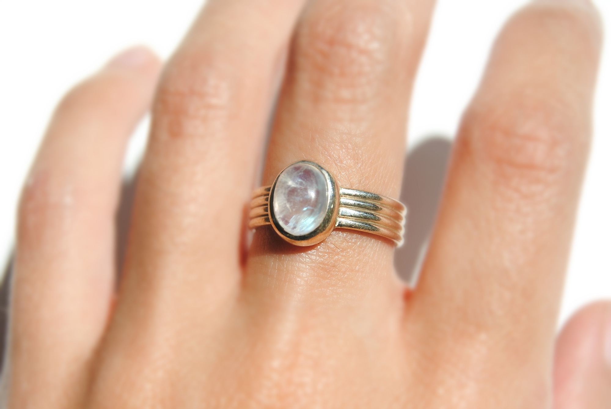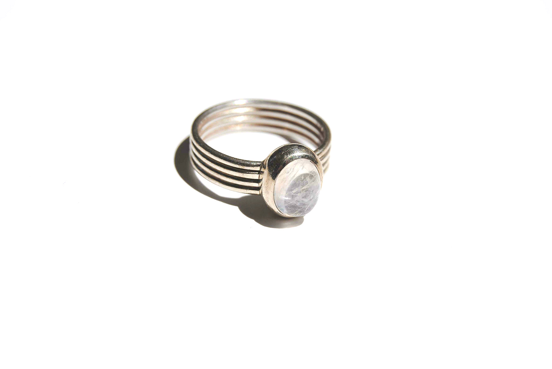 A gorgeous oval quartz crystal is the focal point of this 4-banded, .925 sterling silver ring. Size 5.5.