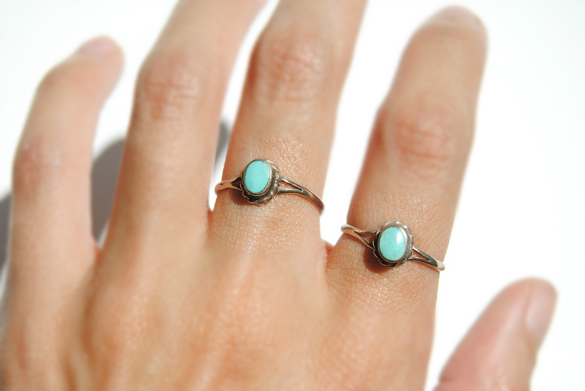These vintage cuties feature turquoise set in .925 sterling silver. Only two in stock.