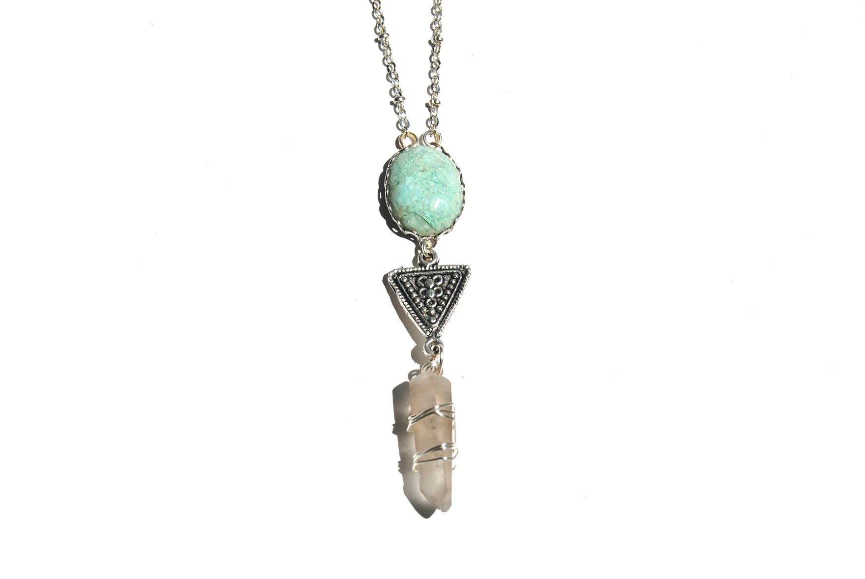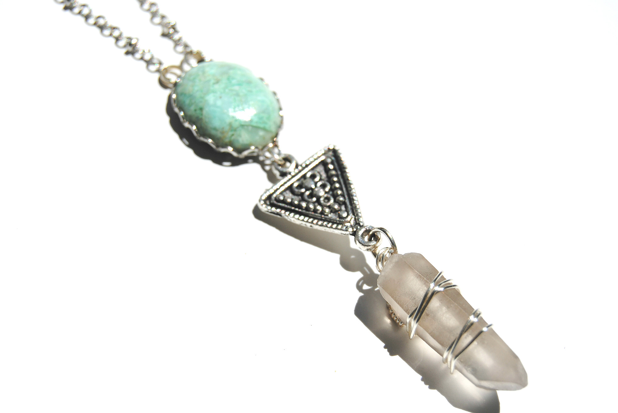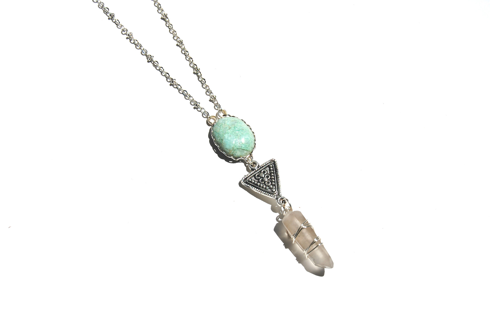 This necklace features a unique teal stone cabochon, tribal triangle charm, and a wire-wrapped smokey quartz crystal. All hung on a 22-23.5 inch silver plated chain. Features lobster clasp closures.