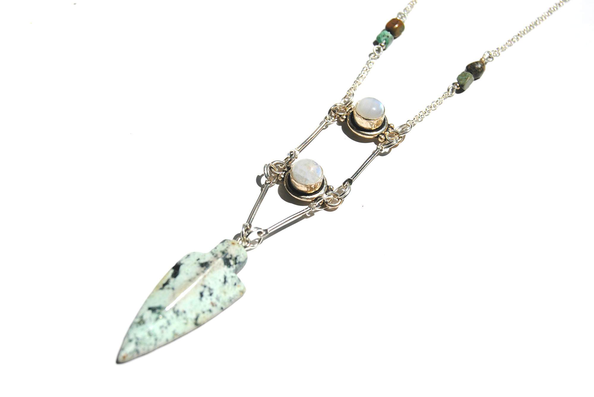 A turquoise, ocean jasper arrowhead hangs beneath two sterling silver wrapped moonstone rounds. Features a 24 inch long chain adorned with a total of eight ocean jasper beads.