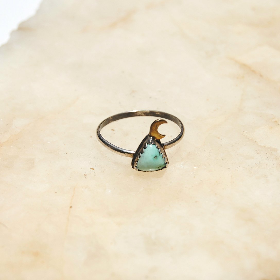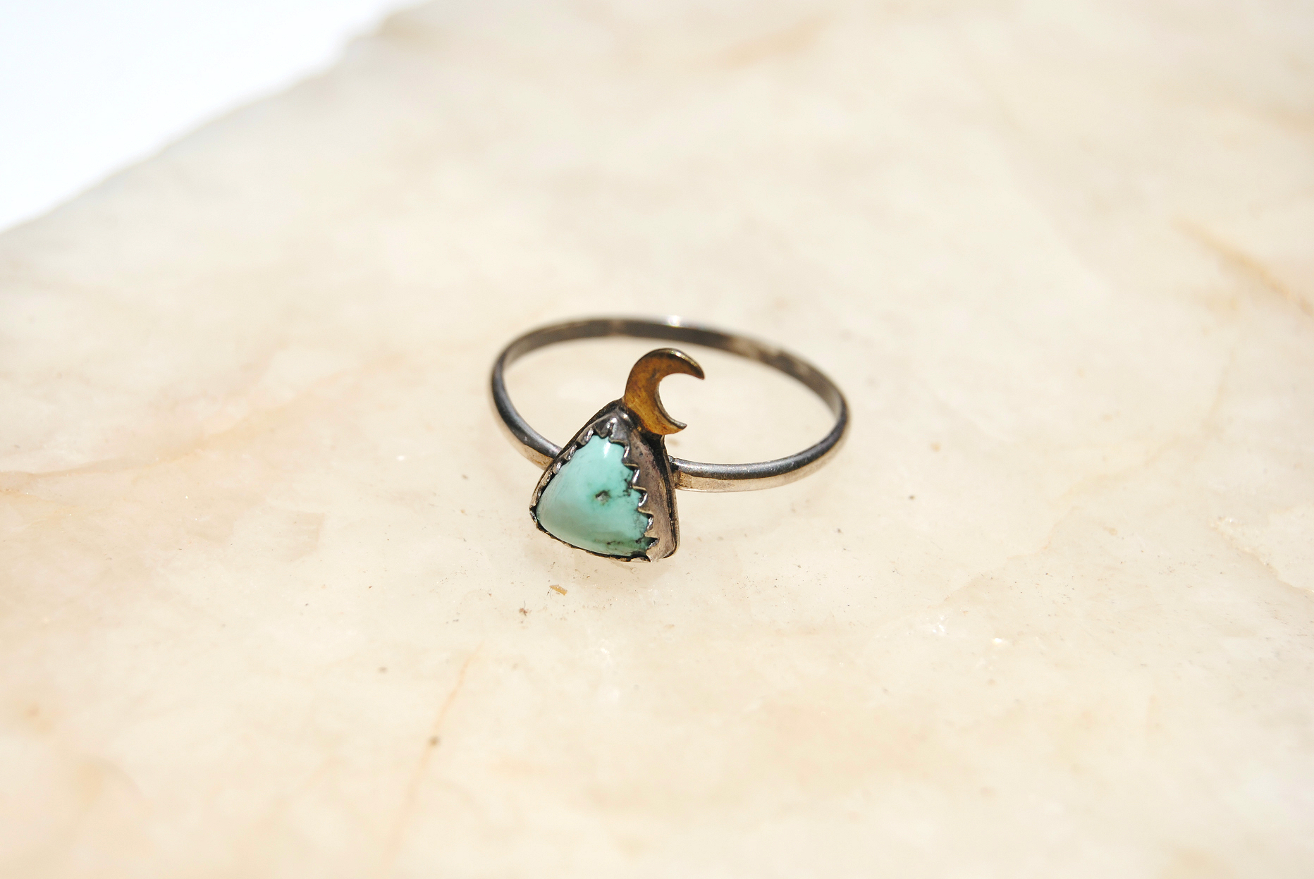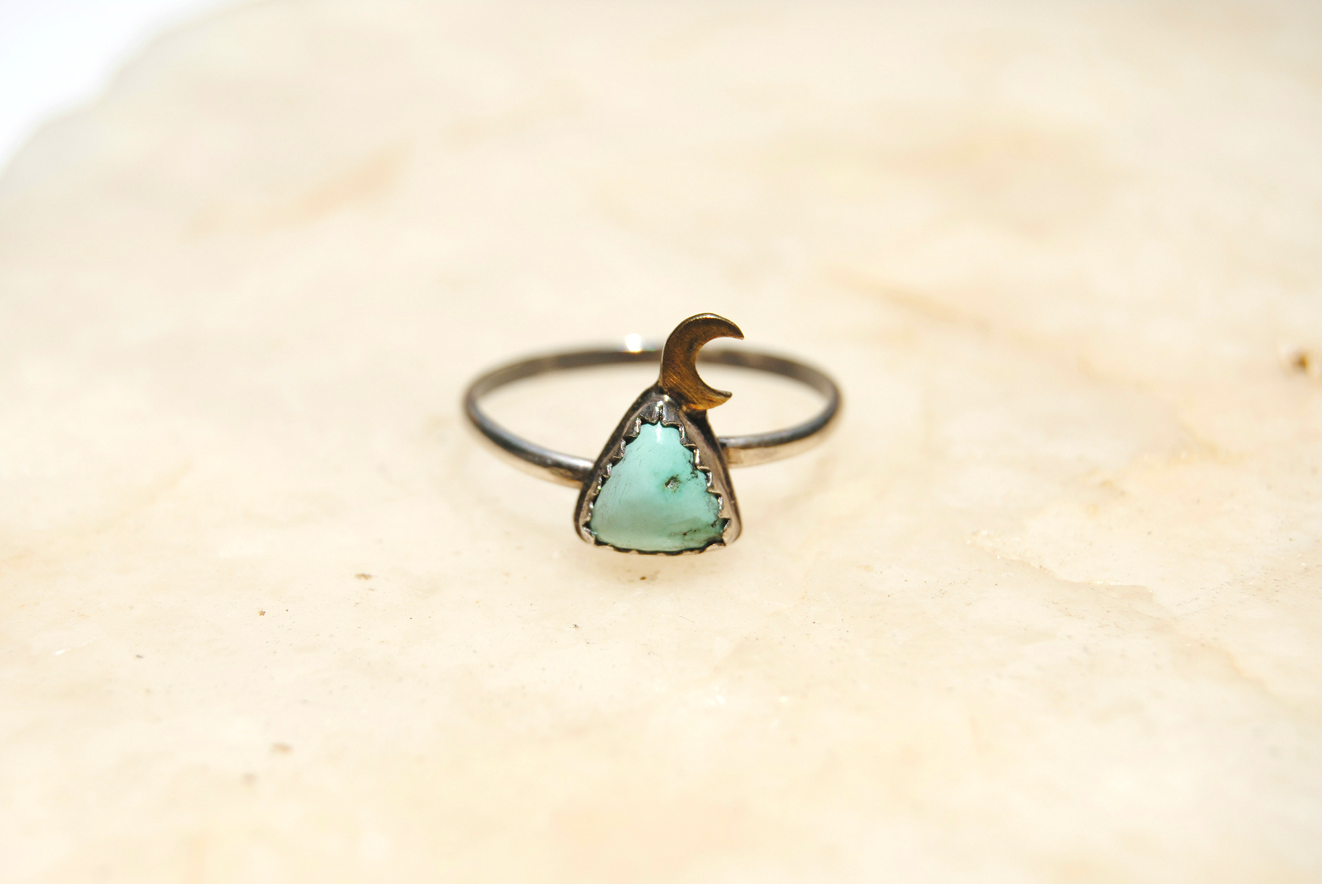 A hand-cut, brass mini moon sits atop a triangular chunk of genuine Southwest turquoise. Size 8.