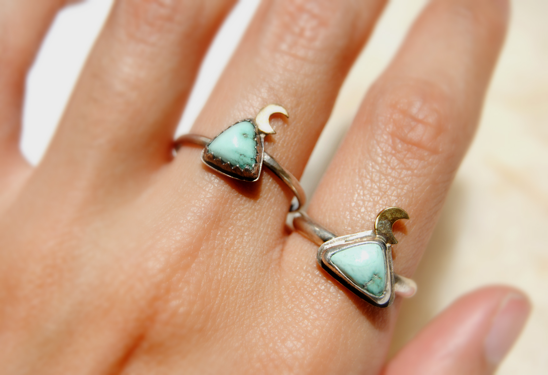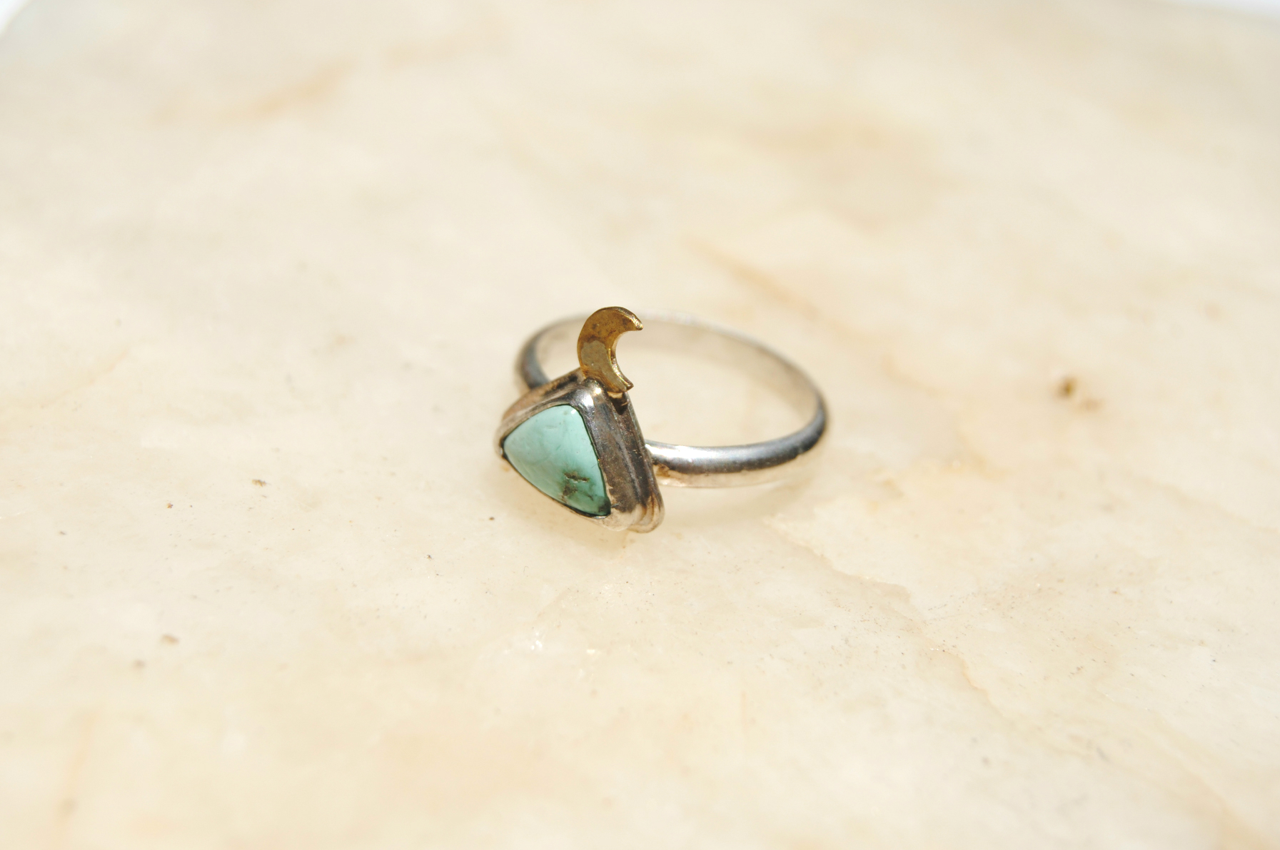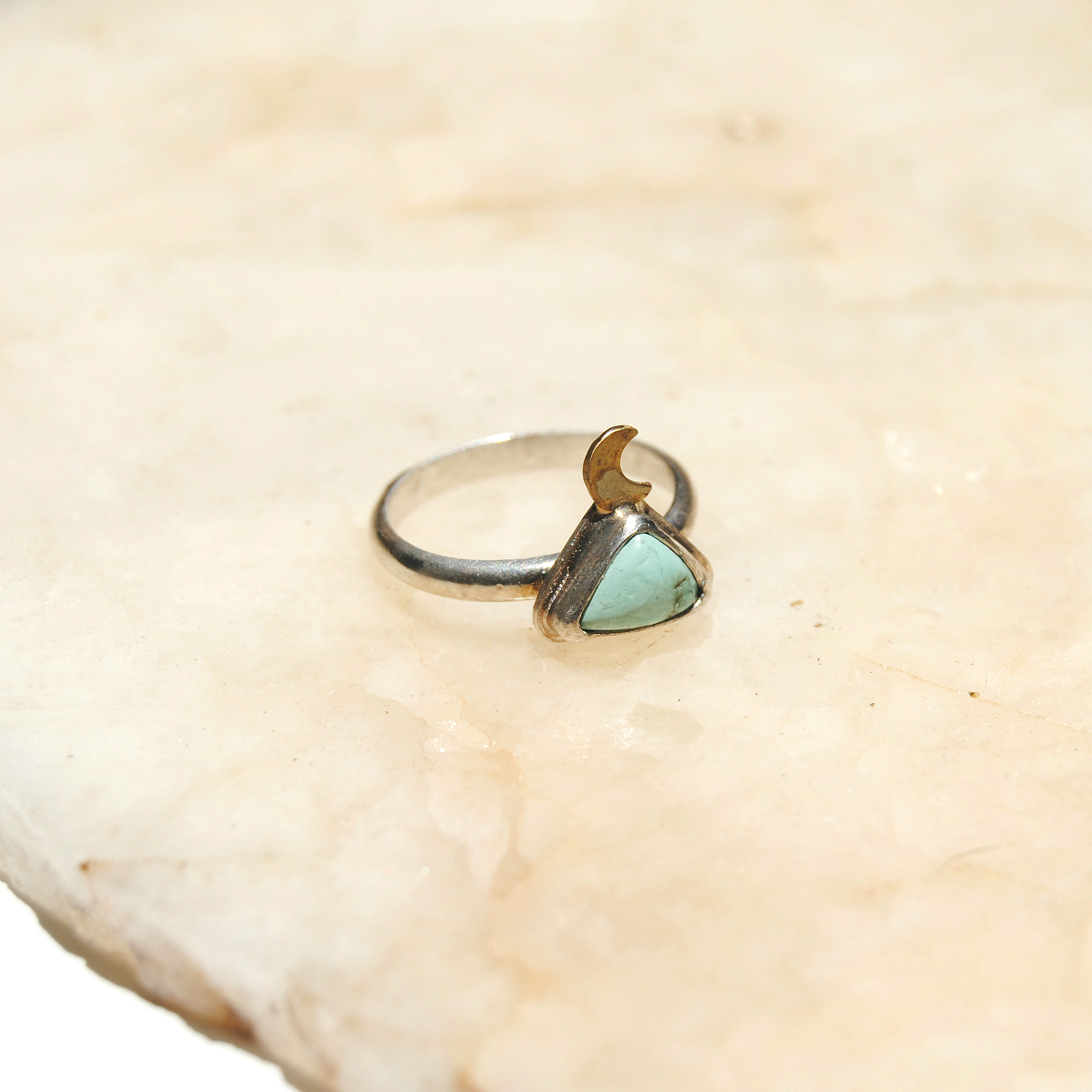 A hand-cut, brass mini moon sits atop a triangular chunk of genuine Southwest turquoise. Size 6.5.