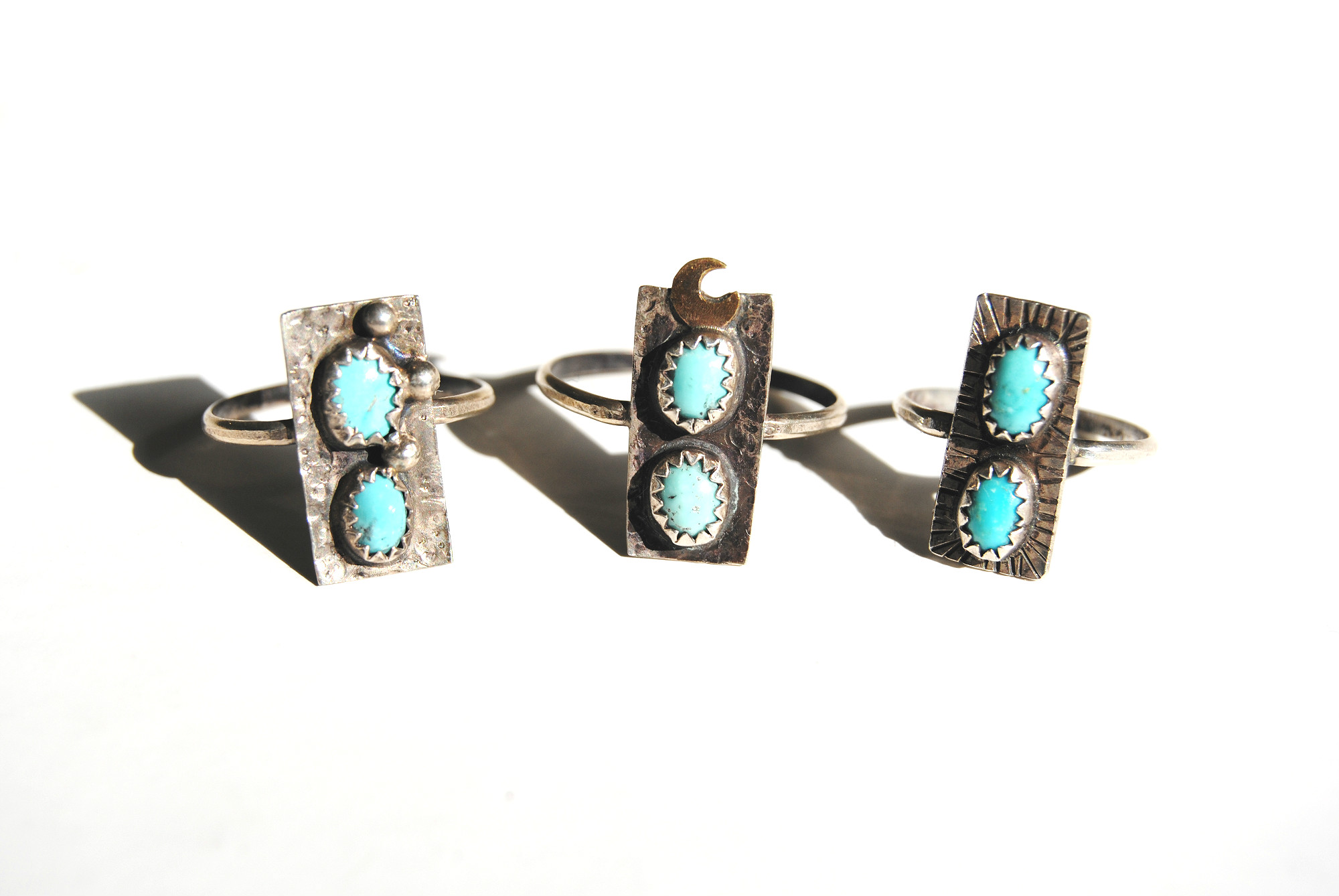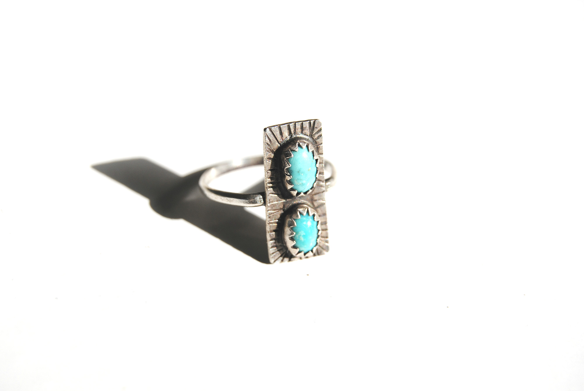 Two natural Kingman turquoise babies are set in .925 sterling silver. This piece is cut, stamped, soldered, and designed entirely by hand in the Moonstone studio. Size 5.25.