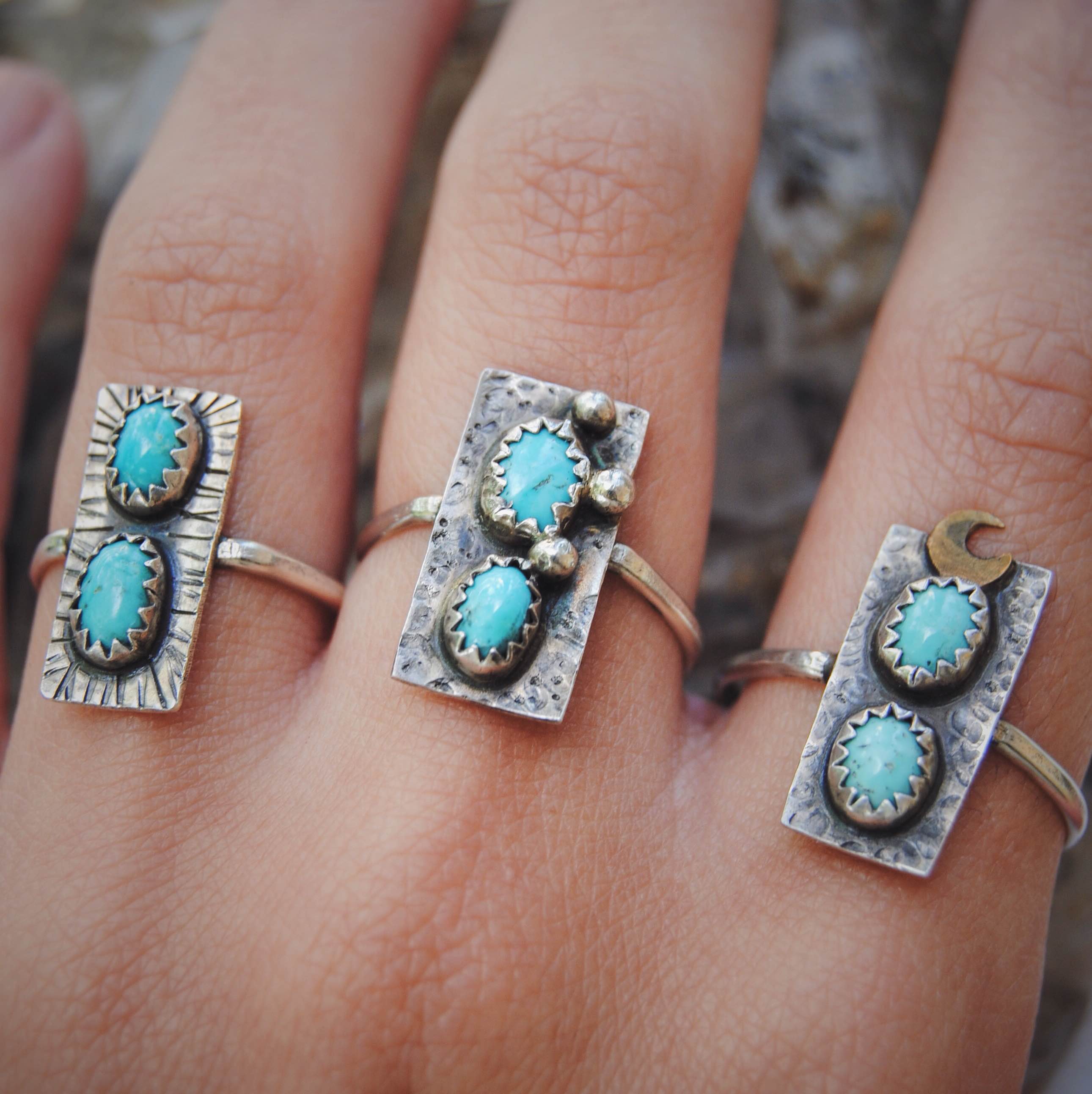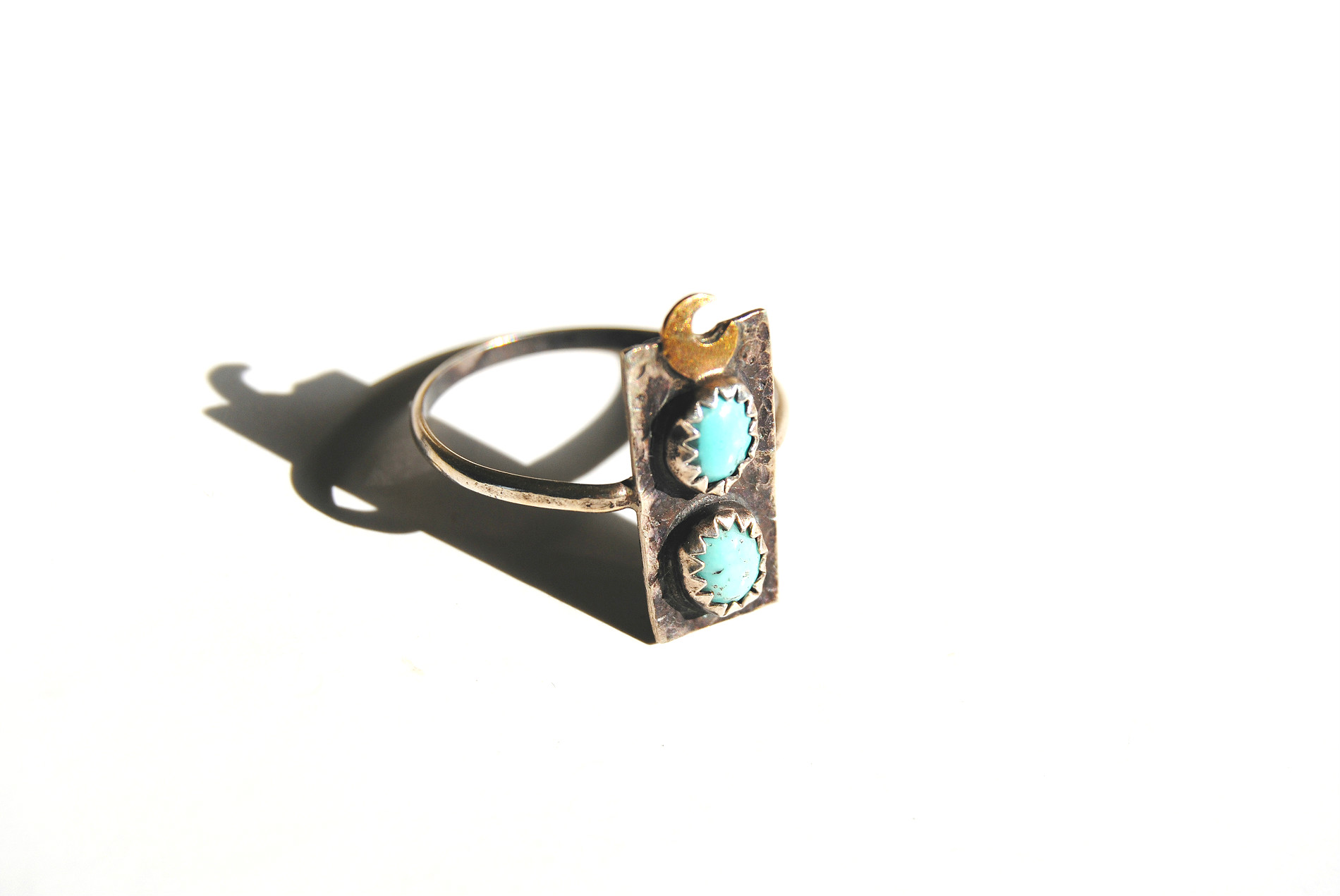 Two natural Kingman turquoise ovals are set in .925 sterling silver. Features a hand-cut brass mini moon. Size 9.