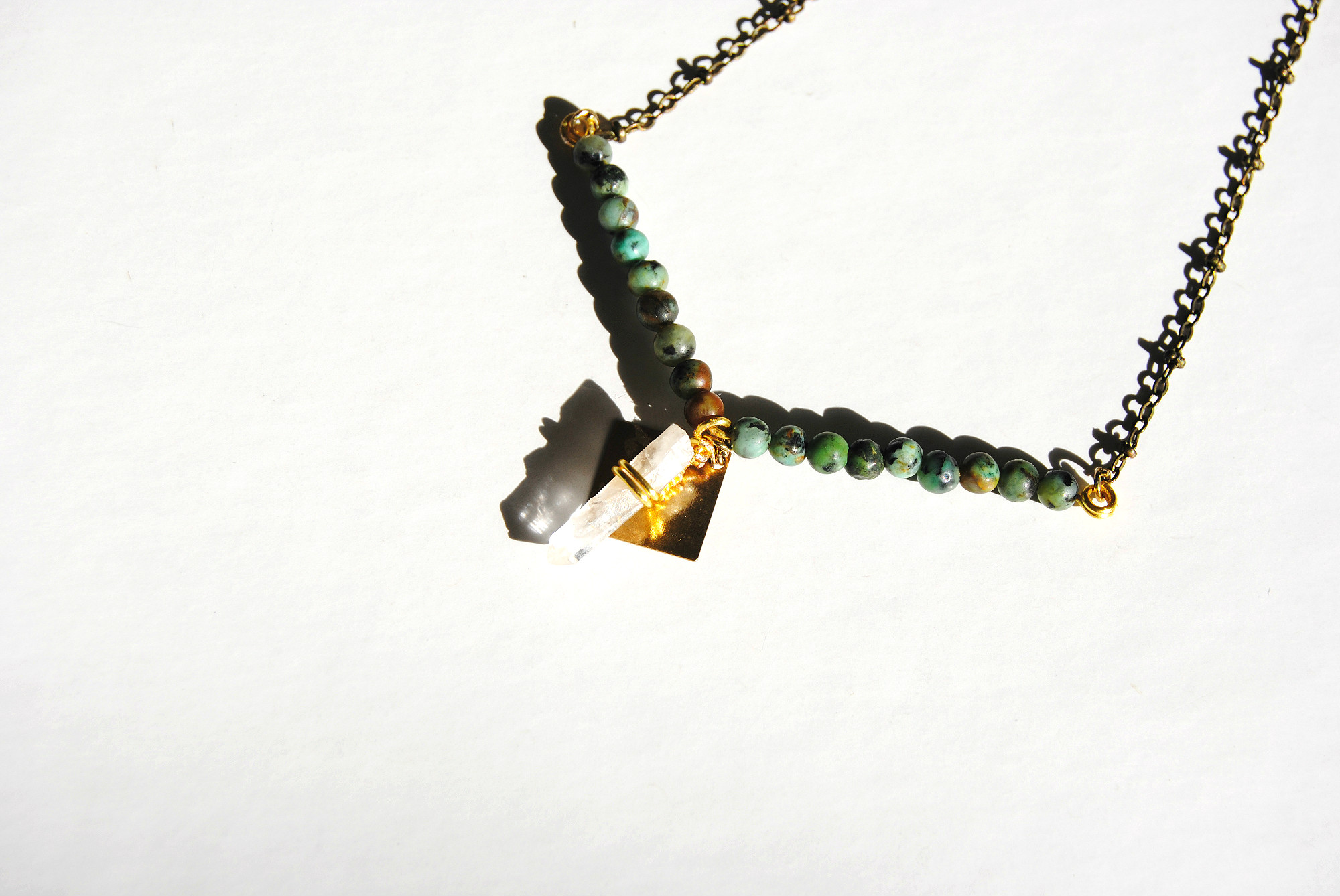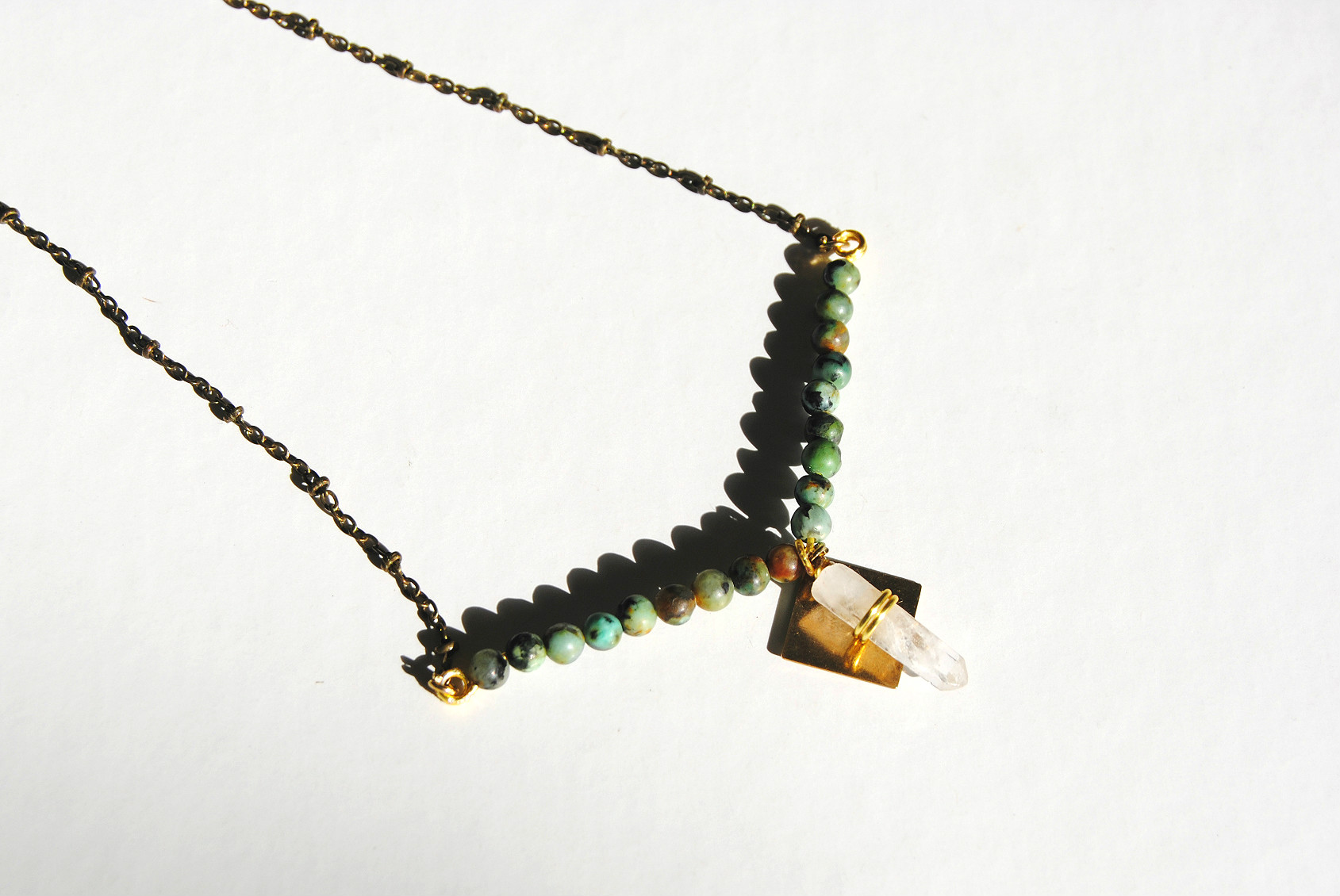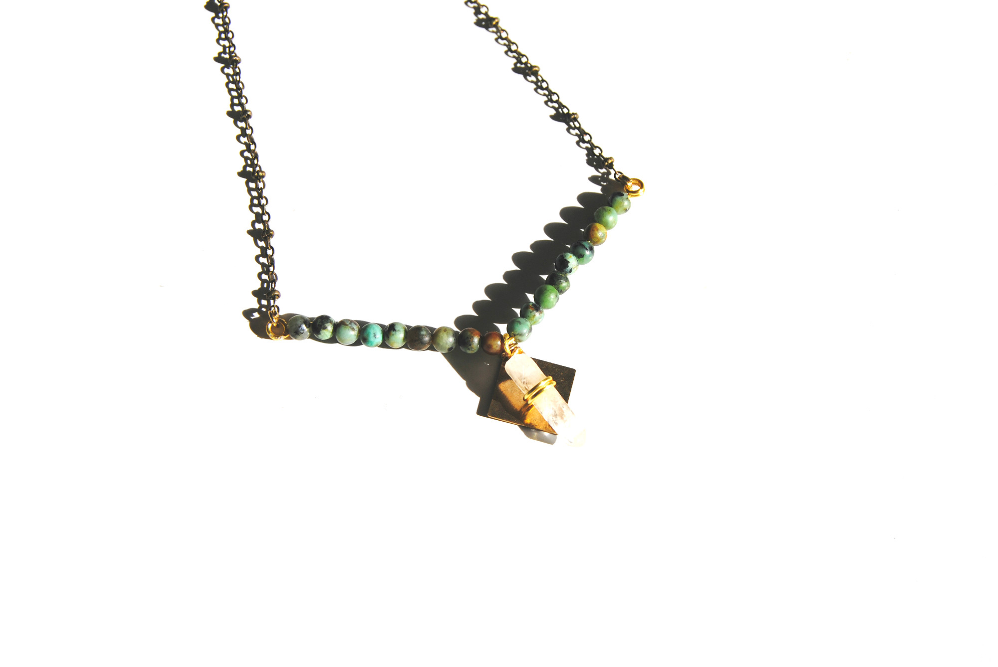 A wire-wrapped baby quartz point hangs beneath a set of turquoise ocean jasper beads. Features a brass square charm, an antiqued brass chain, and lobster clasp closure.