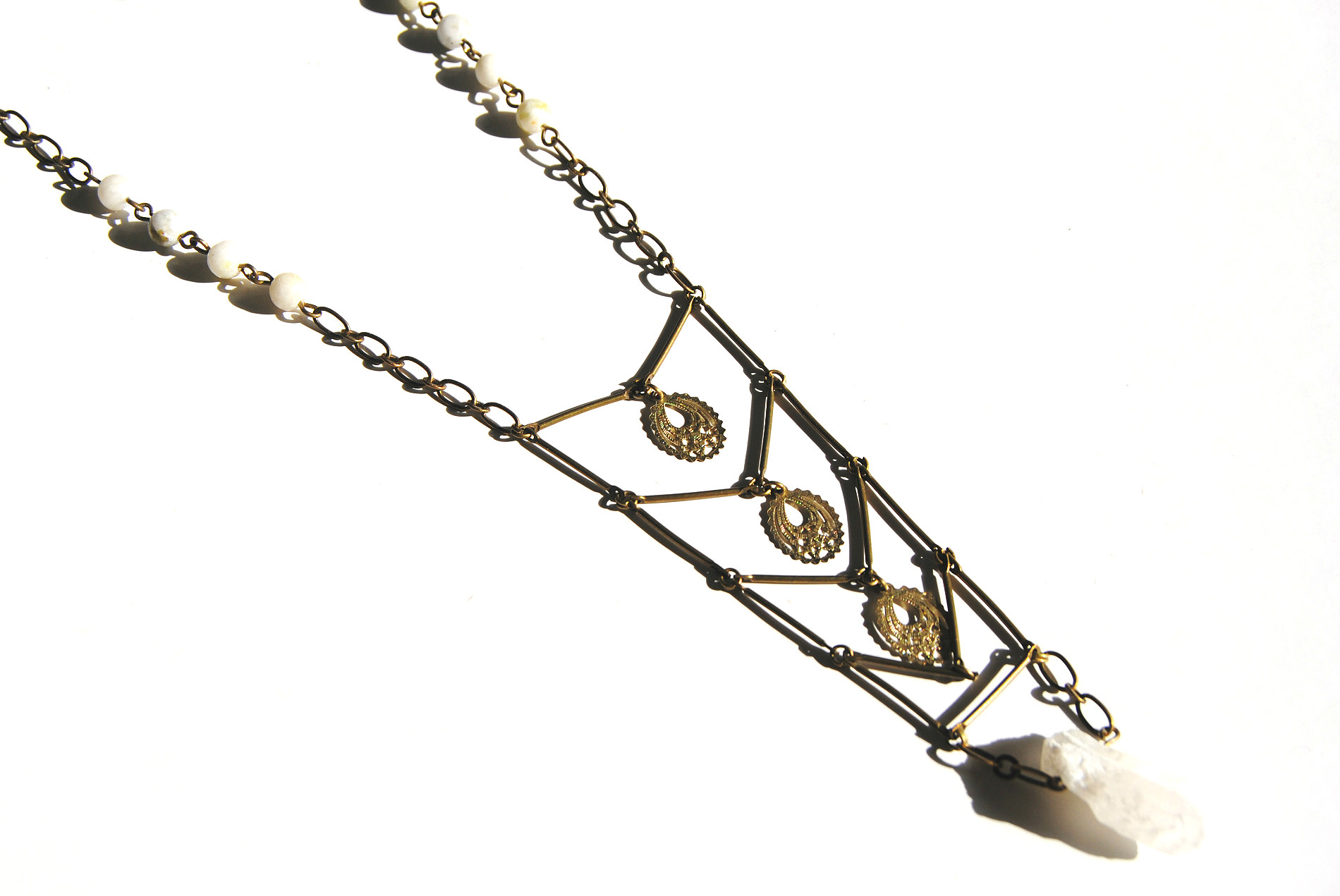 A natural chunk of milky quartz hangs on an antiqued brass chain. Features white jade beads, brass charms, and a lobster clasp closure.
