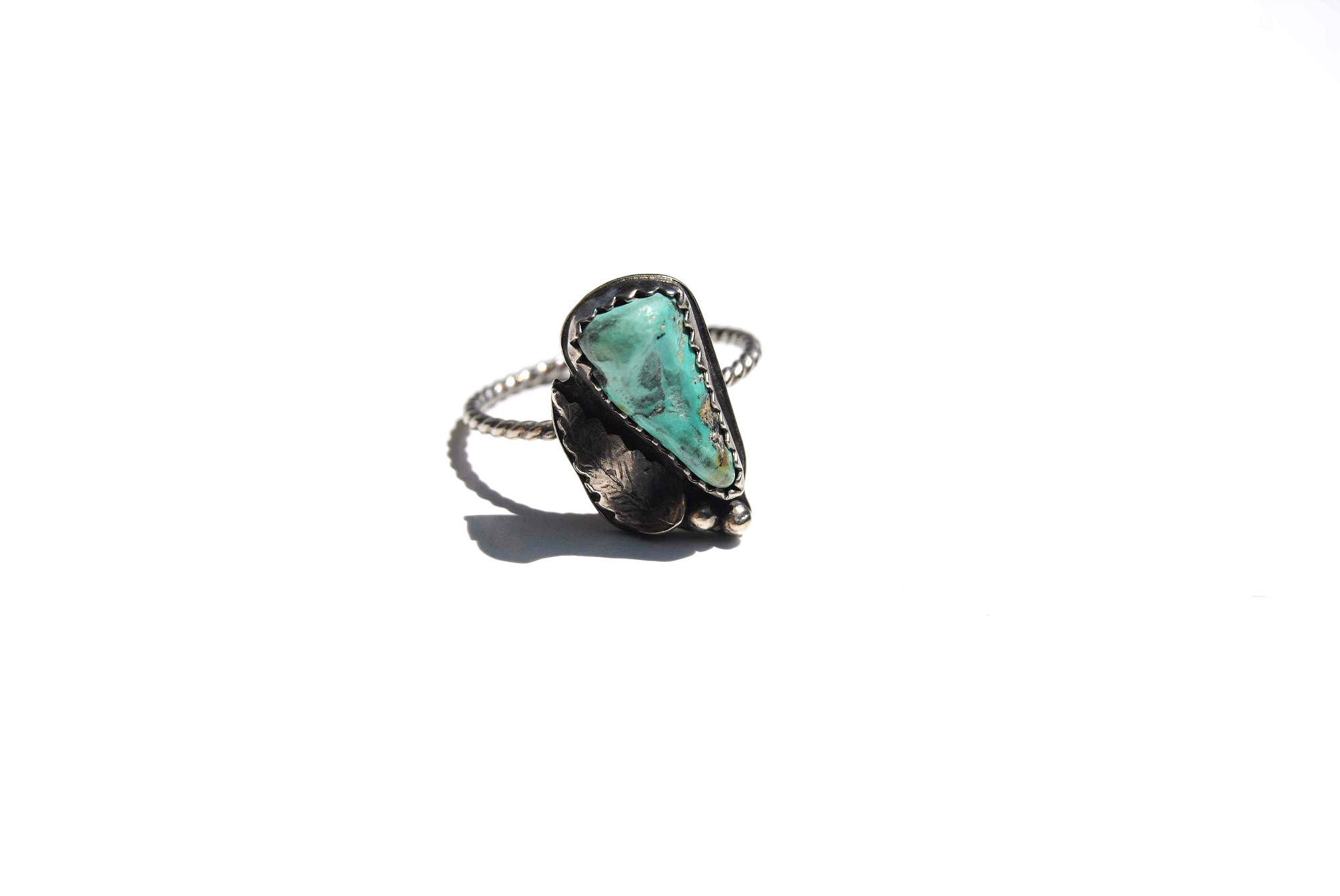 A hand-cut, triangular piece of Southwest turquoise is set in .925 Sterling silver. Size 6.