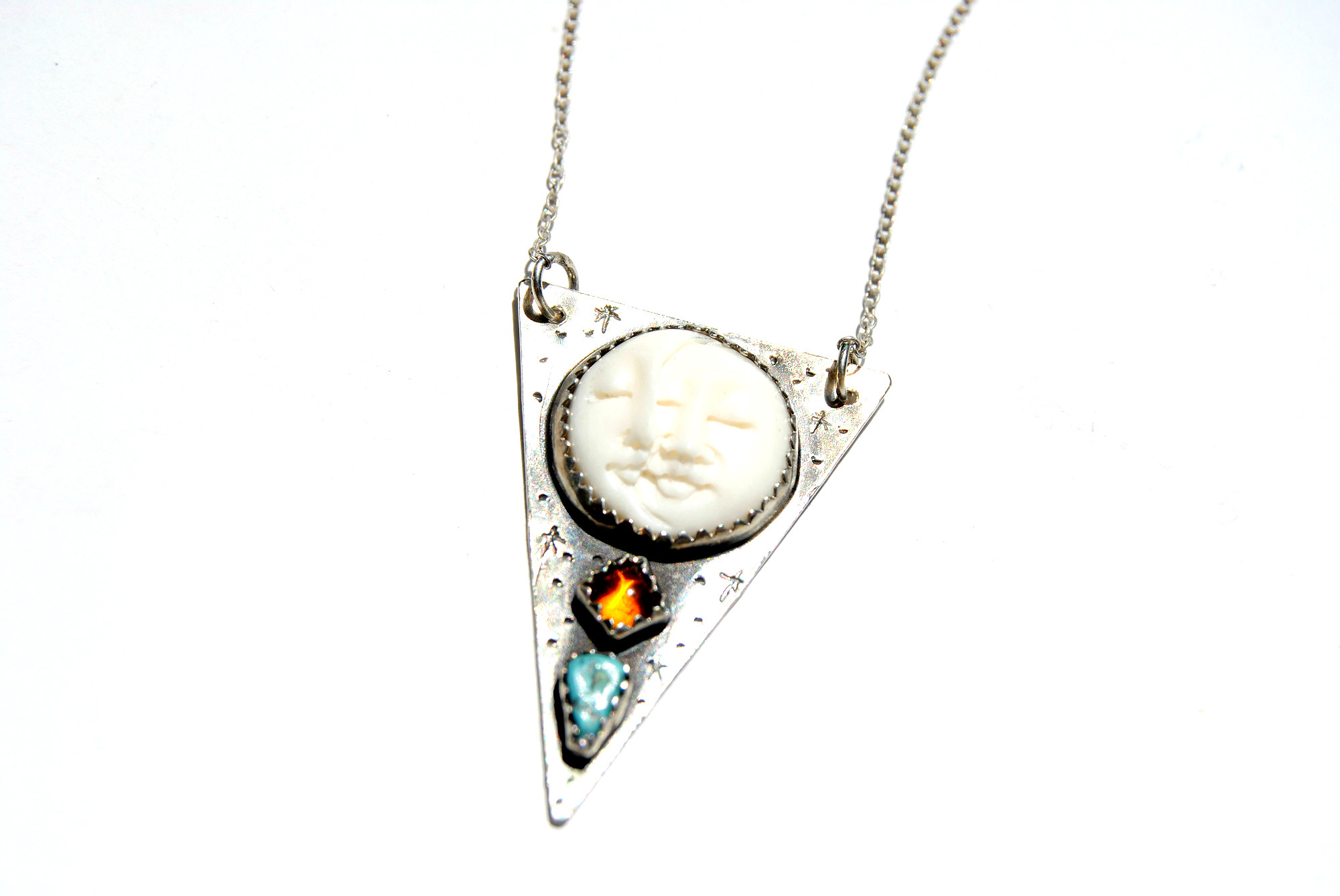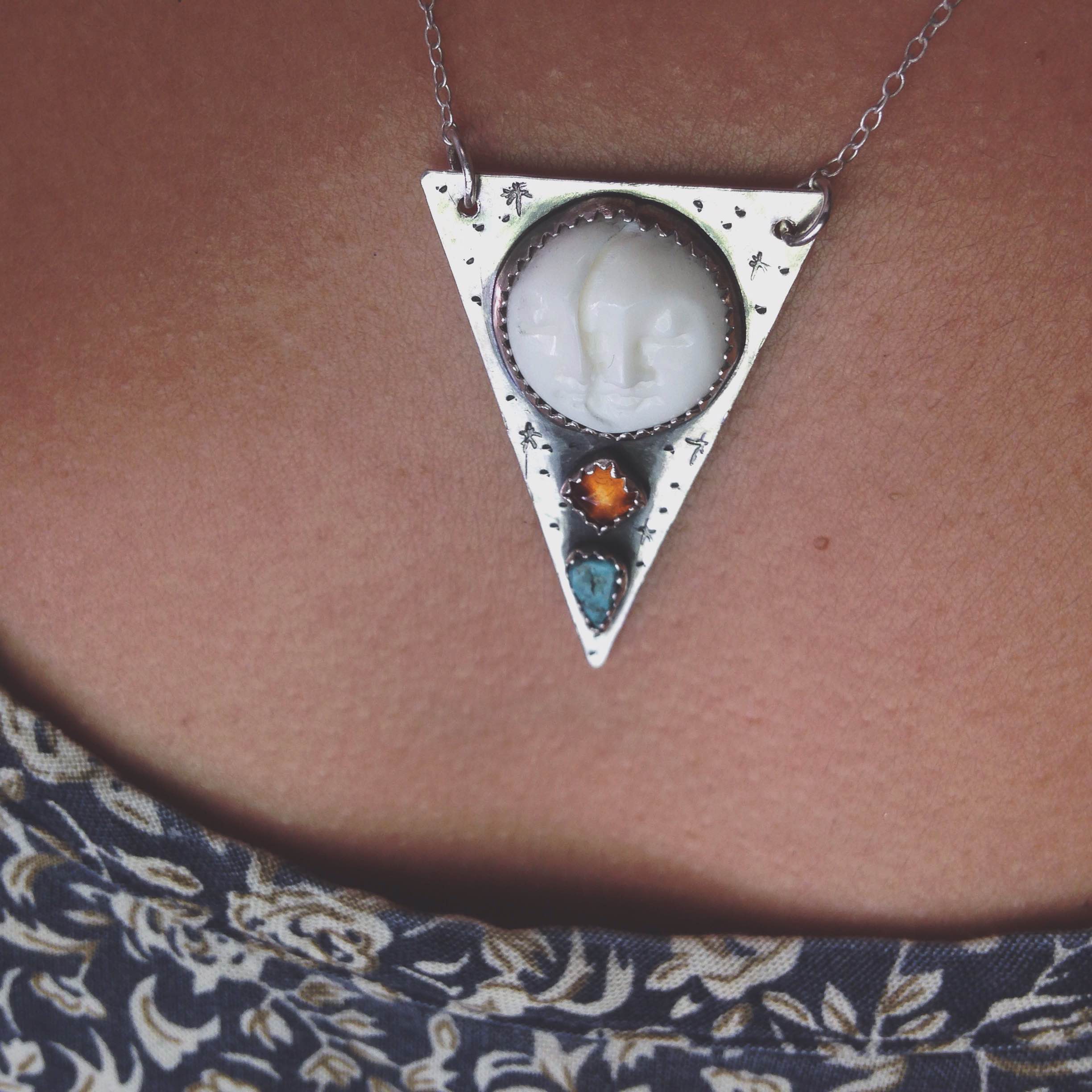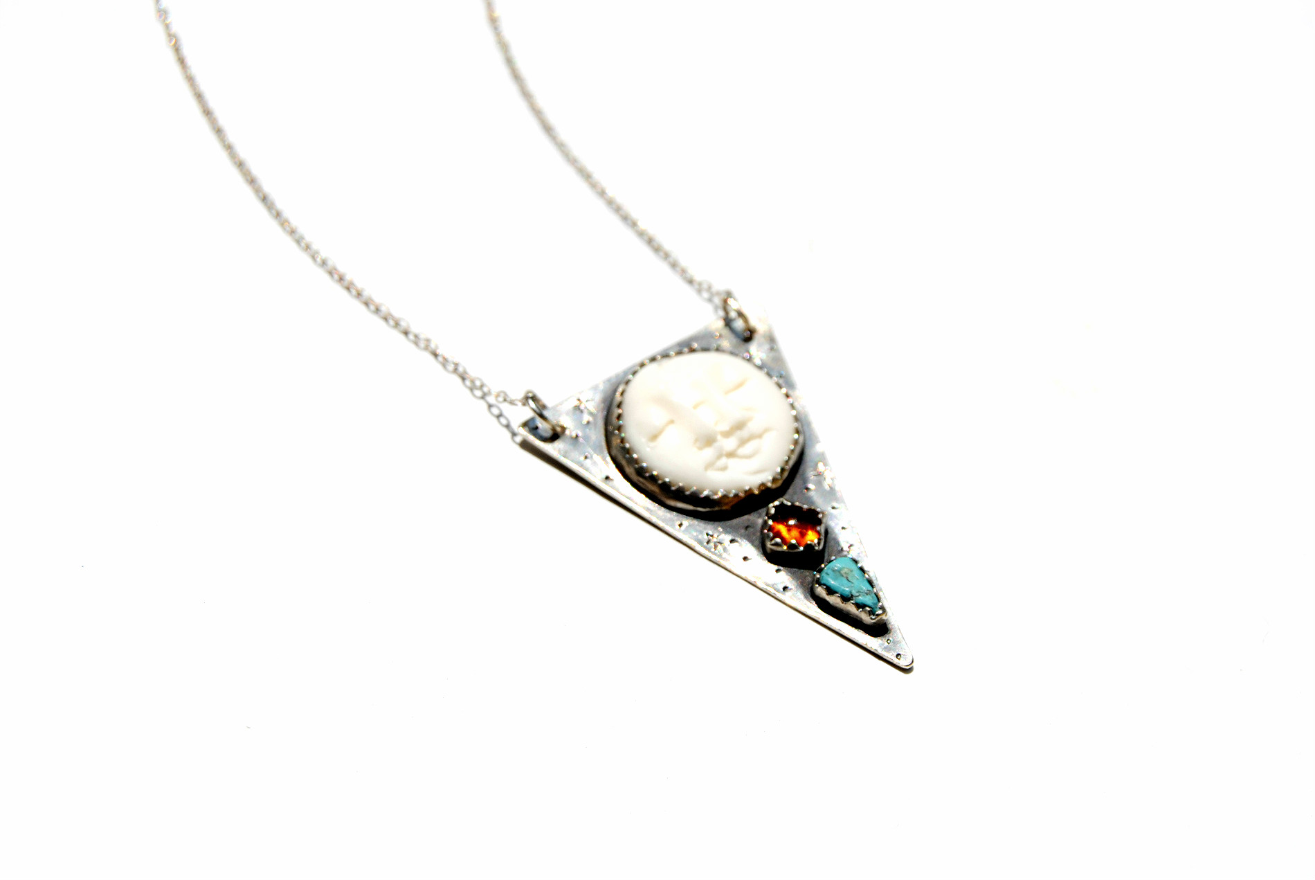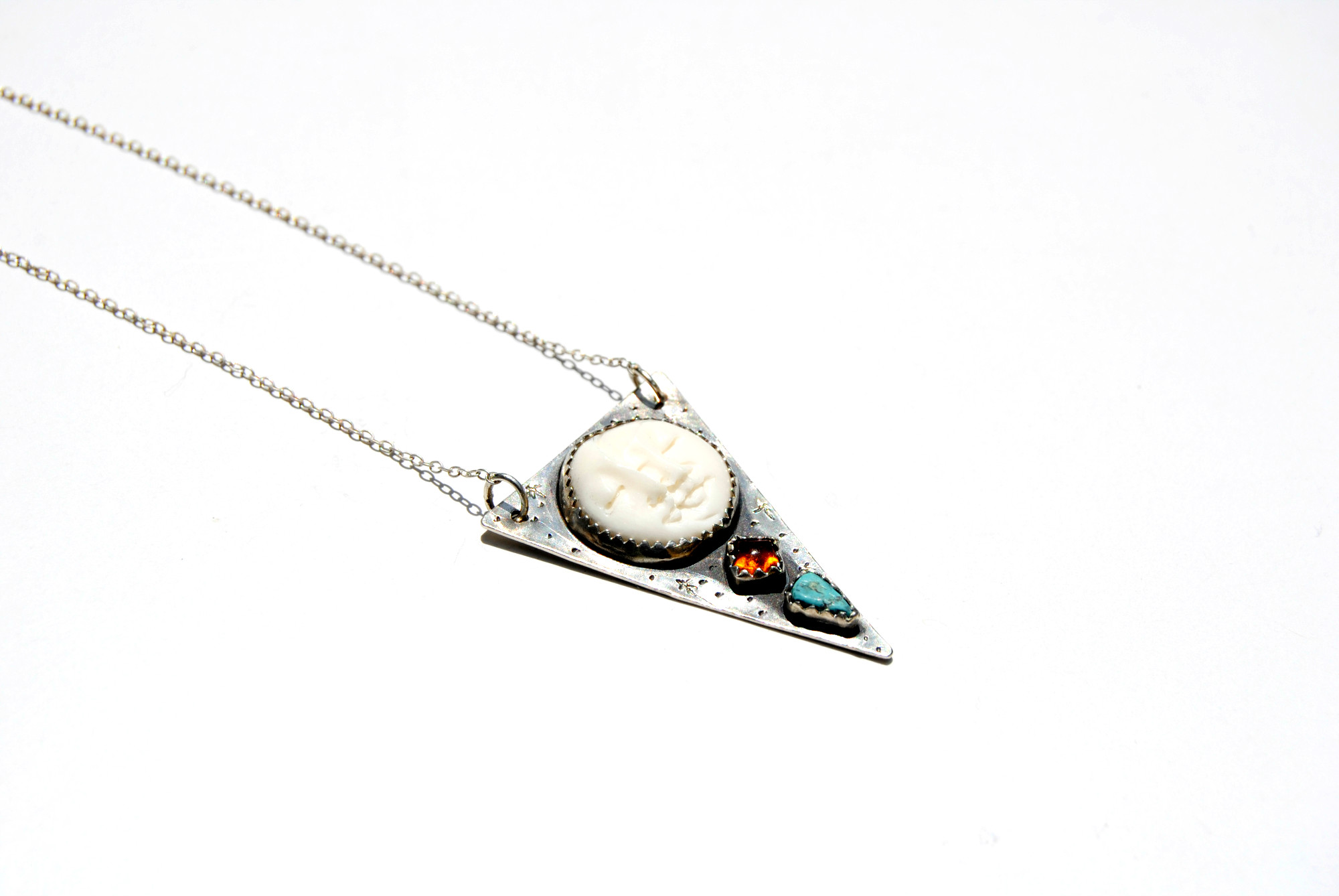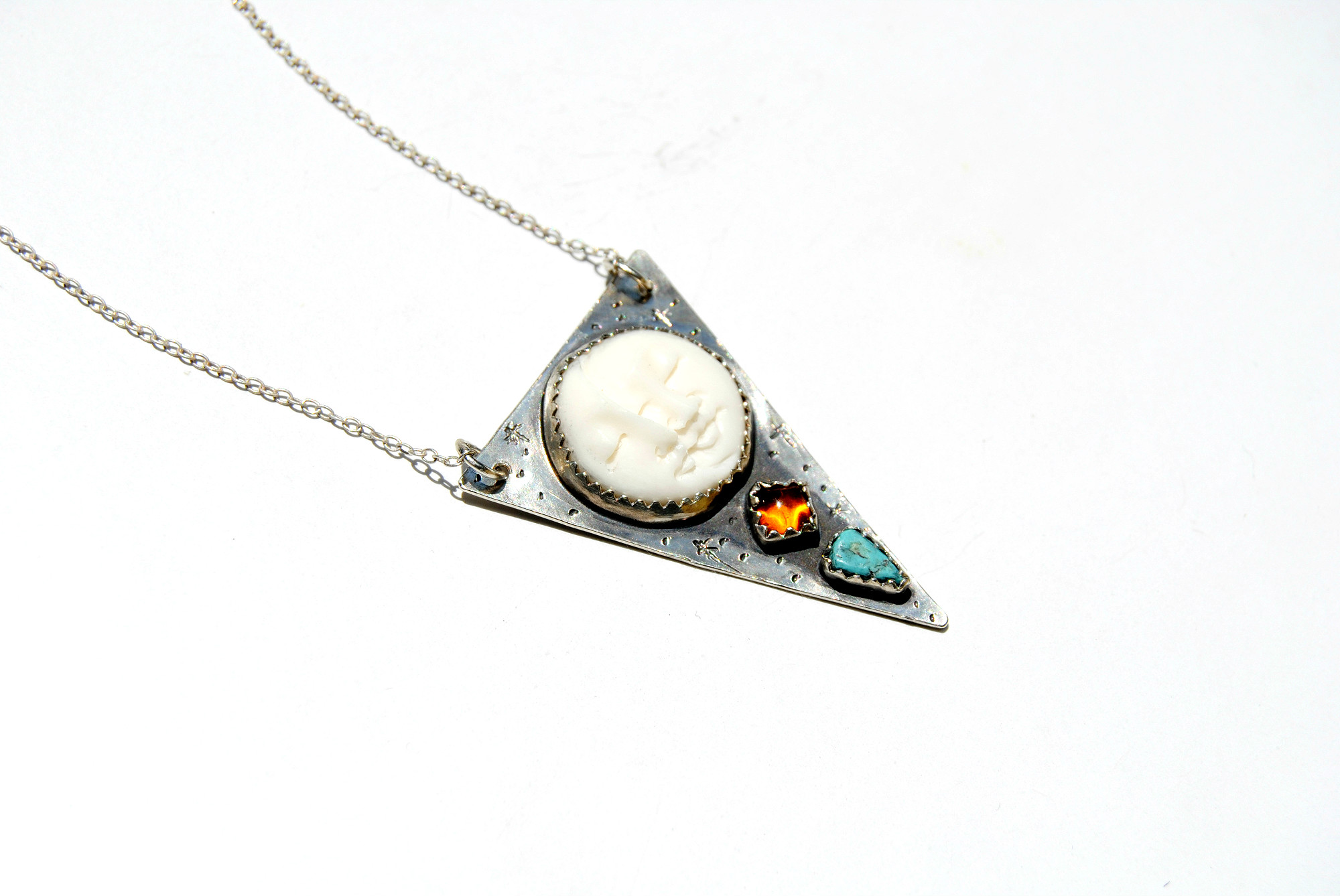 This necklace features a man-in-the-moon carved buffalo bone cab, a diamond-shaped amber, and a hand-cut teardrop turquoise. All set and hung in/on .925 sterling silver. Chain measures 16 inches long. Pendant measures 1.5 inches long.