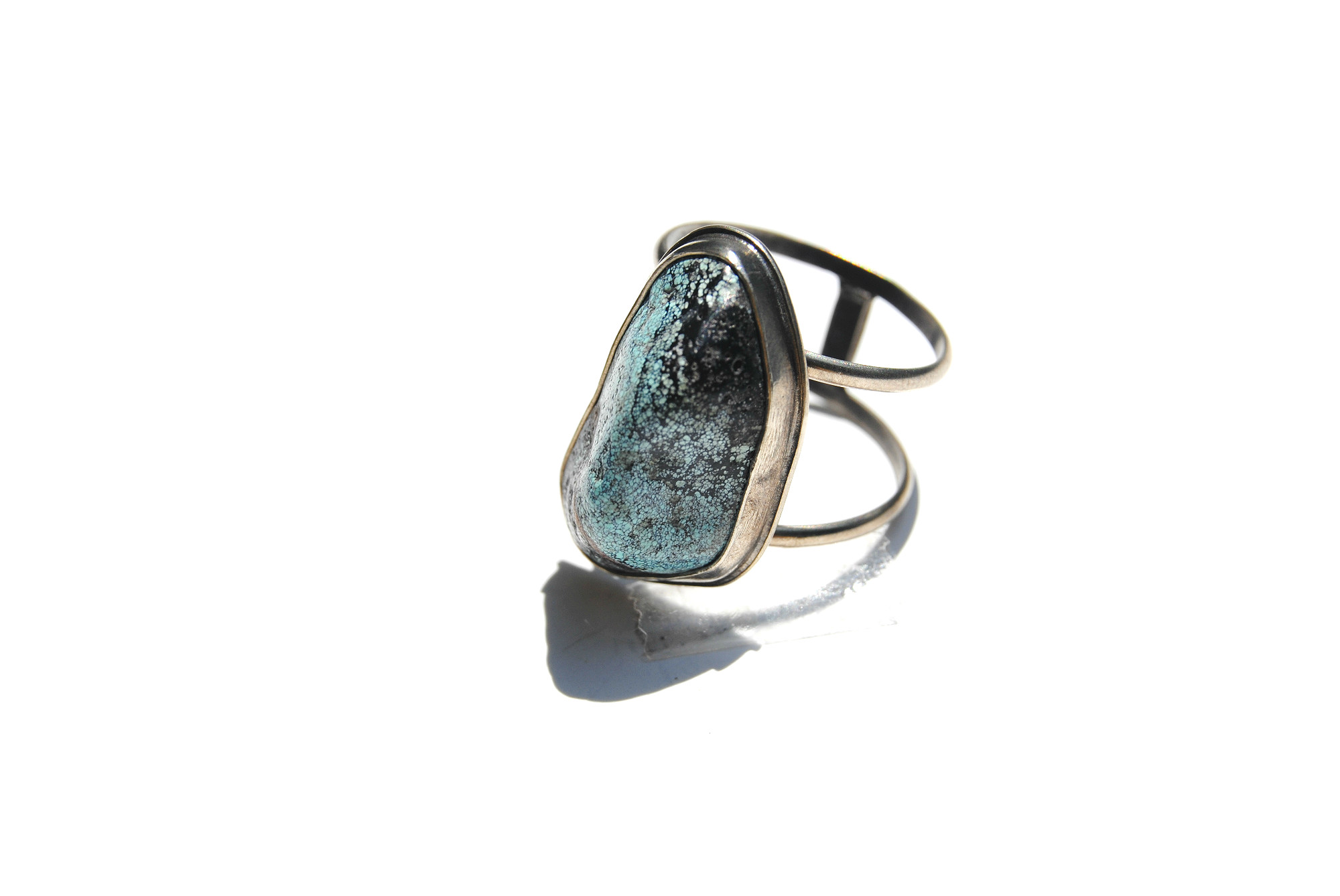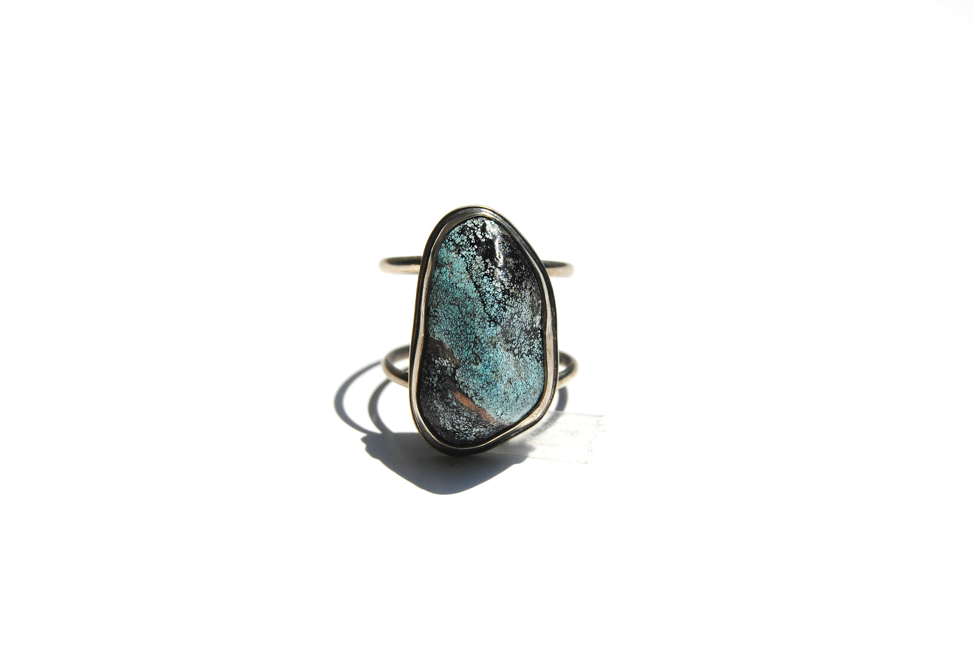 A simple and sleek setting to make this unique stone speak for itself. A beautiful, rare blue chunk of Southwest spiderweb turquoise has been hand cut, polished, and set in .925 sterling silver. Features a double ring band connected at the back. Size 7.5.