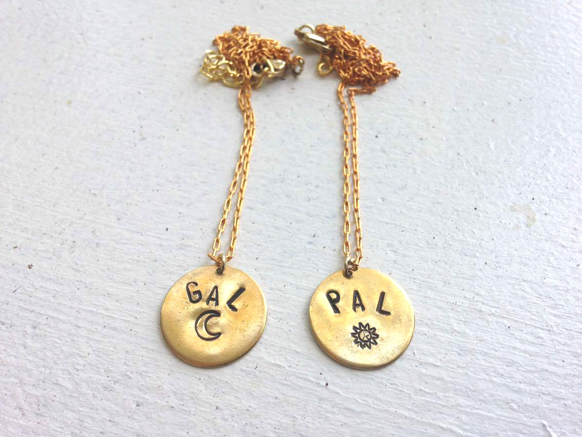 Your choice of saying stamped on a raw brass disc and hung on a 15 inch long raw brass chain. Lobster clasp closure.