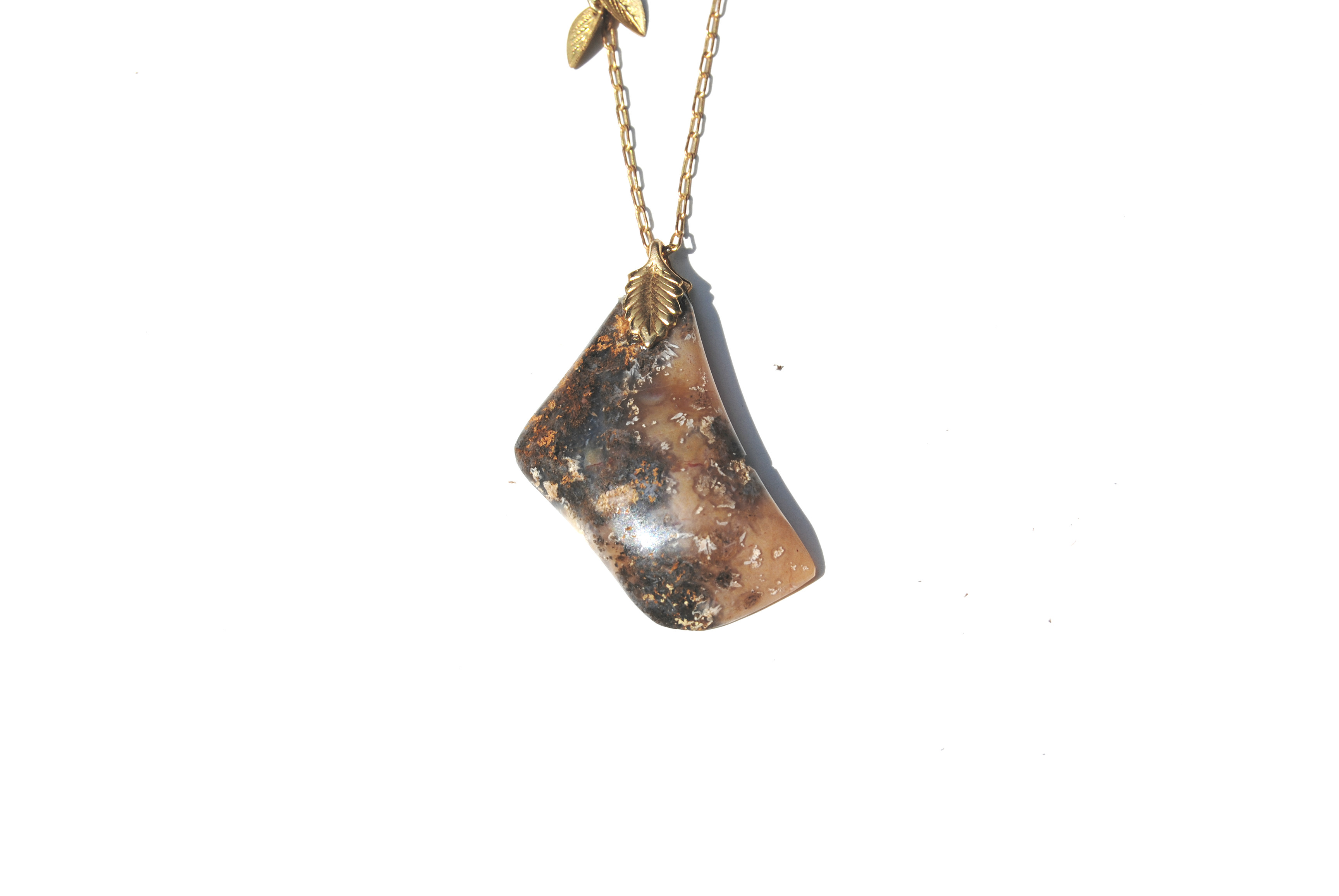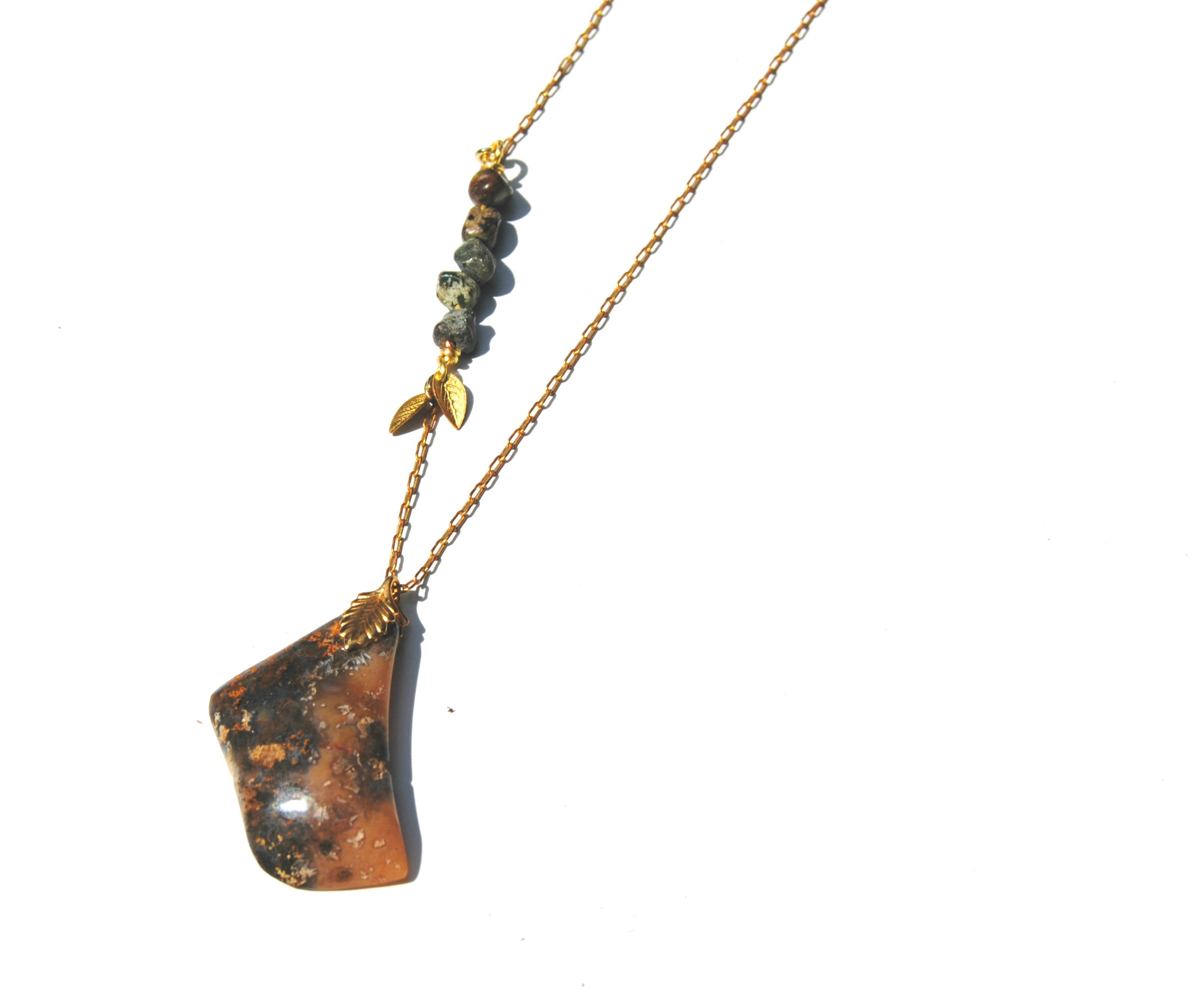 An intricate and milky chunk of agate hangs on a raw brass chain. Features ocean jasper beads and two tiny leaf charms. Chain measures 21 inches in length. Stone measures about 1.5 inches in length.