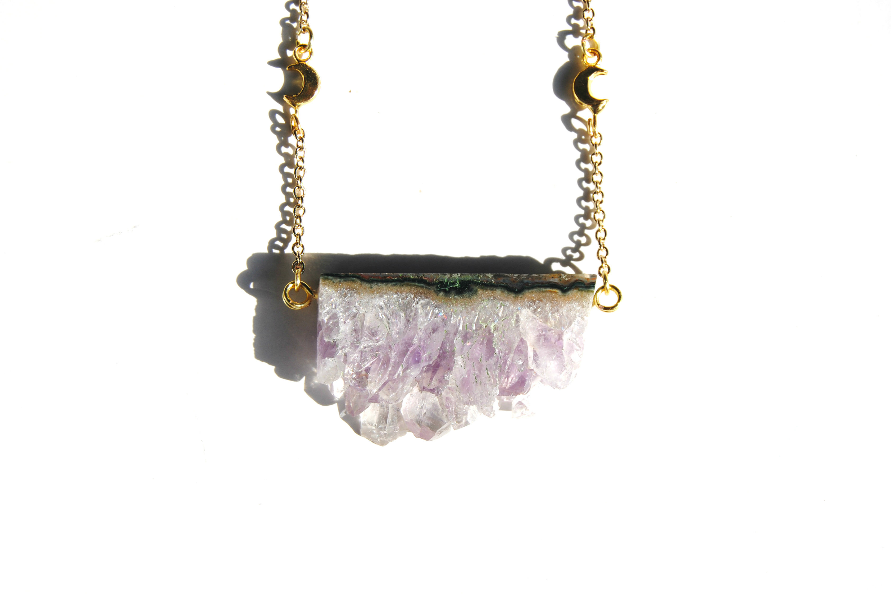 A slice of raw amethyst is hung on a 16 inch gold plated chain with golden mini moon accents. Lobster clasp closure. Slice measures 1.75 x 1 x 0.25 inches.