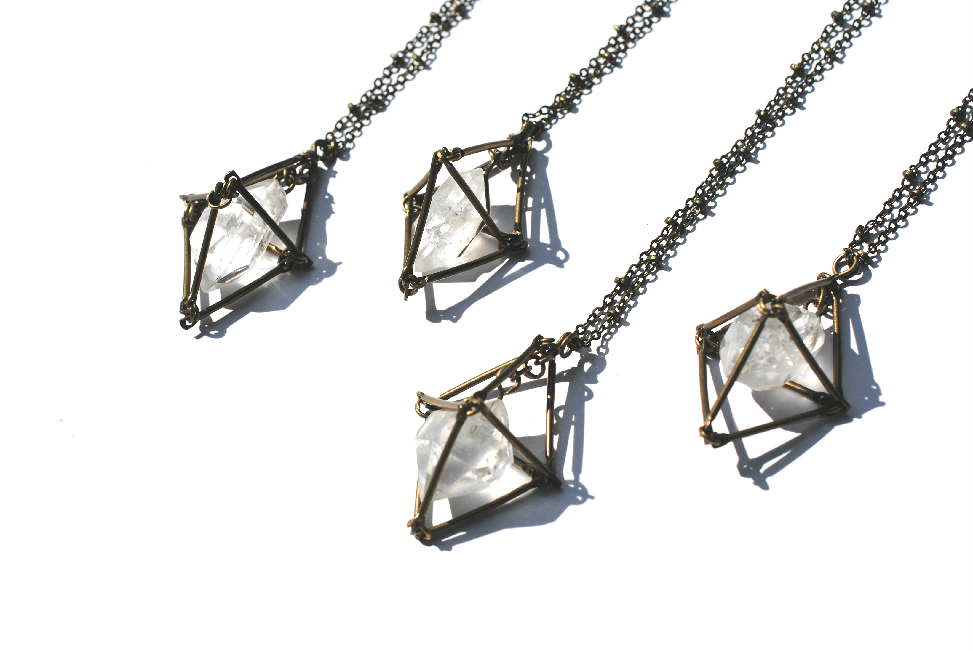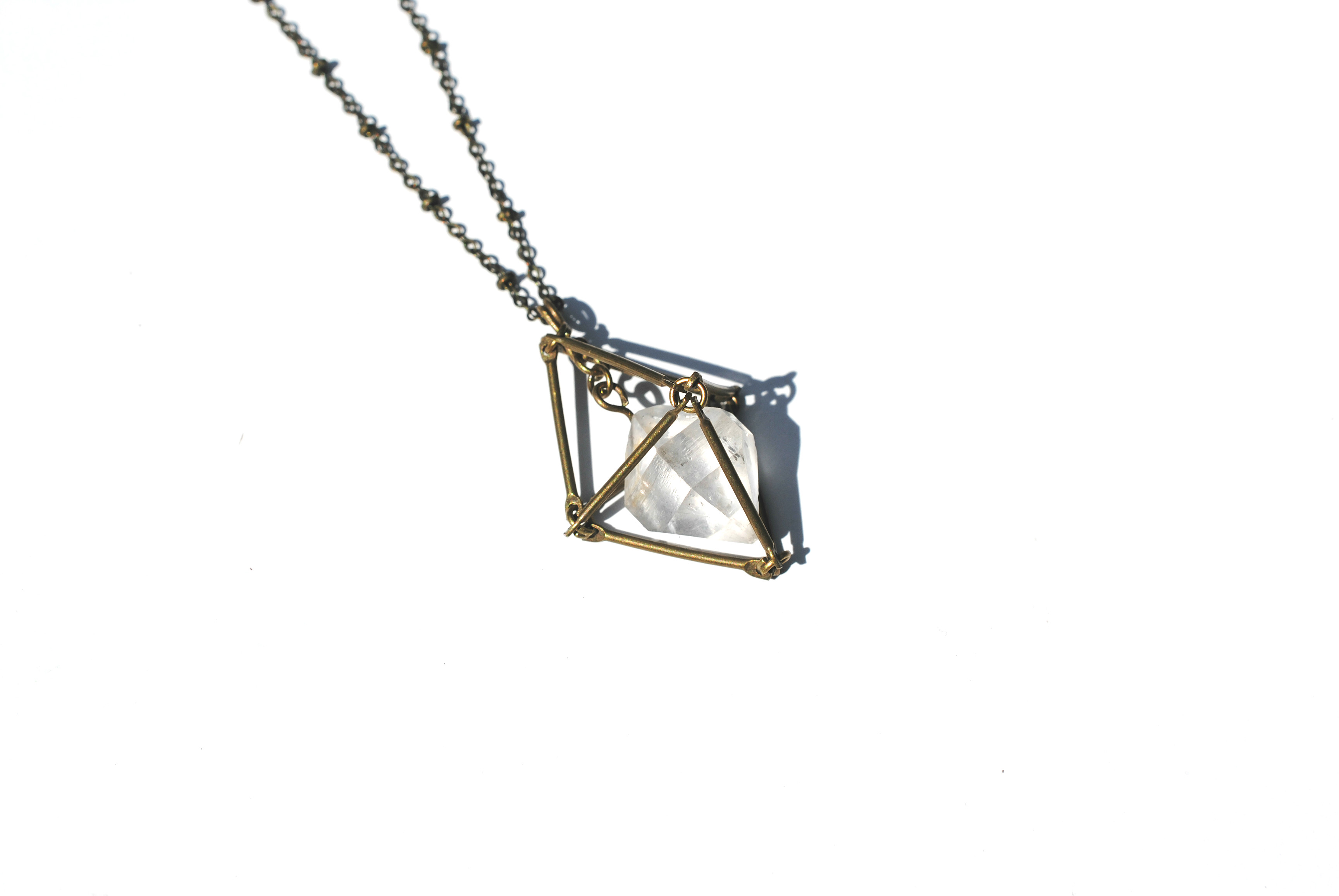 A raw clear quartz crystal hangs inside of an antiqued brass or silver plated cage. Features your choice of chain length and a lobster clasp closure. Cage pendant measures about 1.5 inches long.