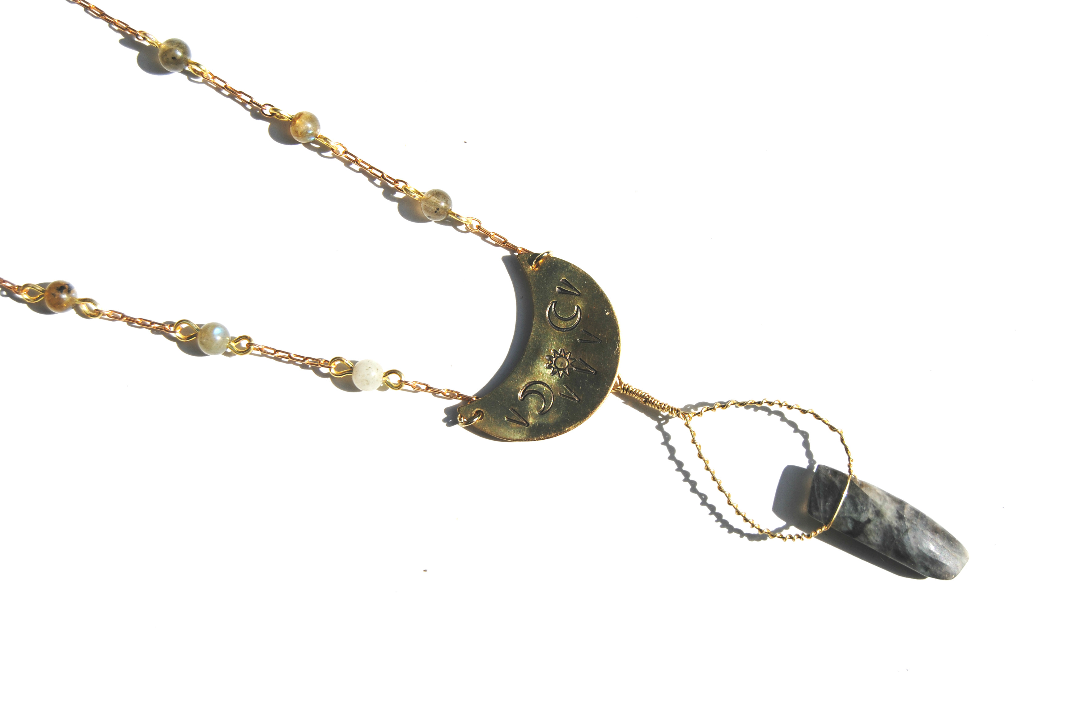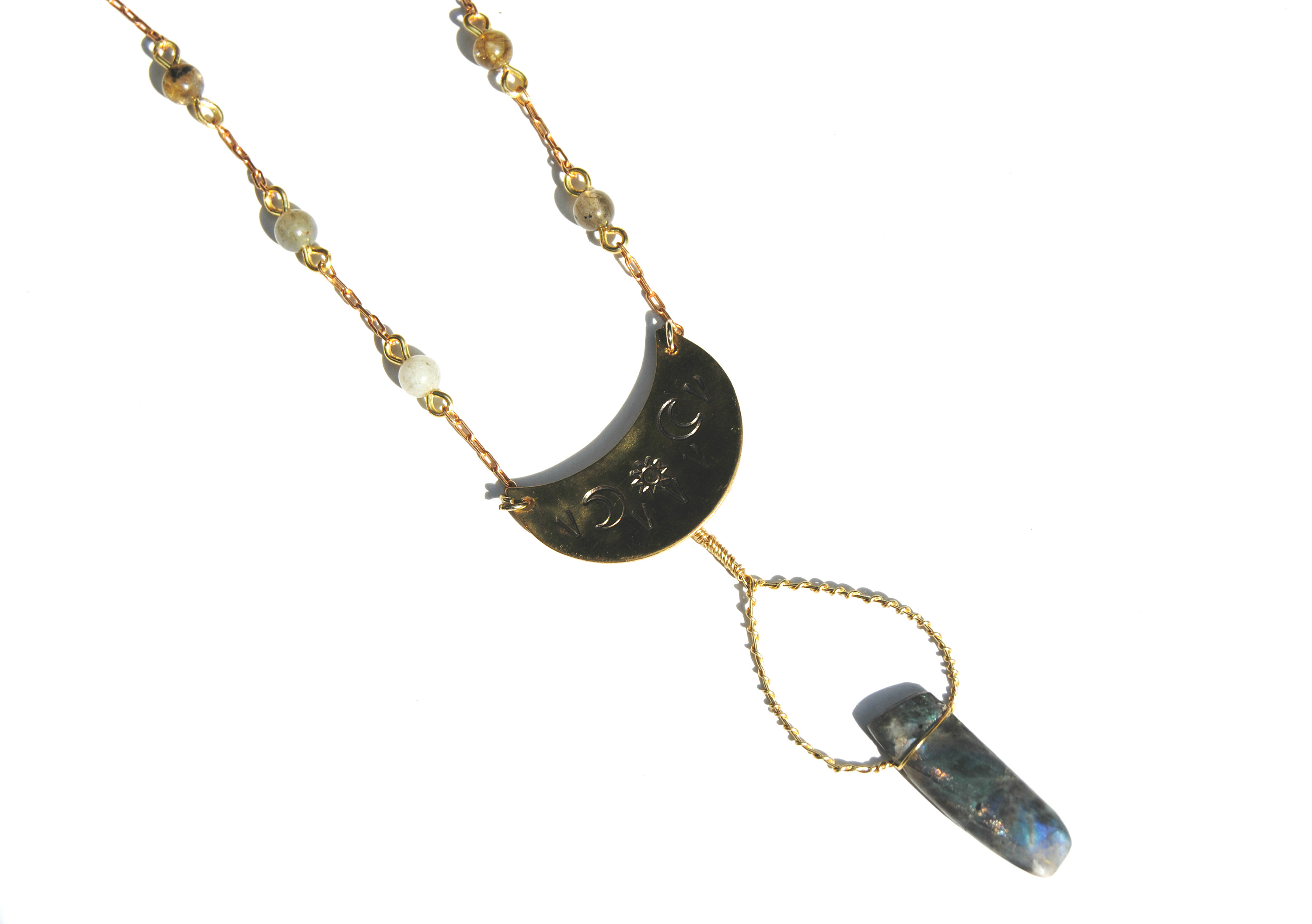A glistening chunk of labradorite hangs beneath a hand-stamped raw brass crescent. Features labradorite mini beads, raw brass chain, and a lobster clasp closure. Hangs at 24 inches long. Stone measures about 1 inch long.