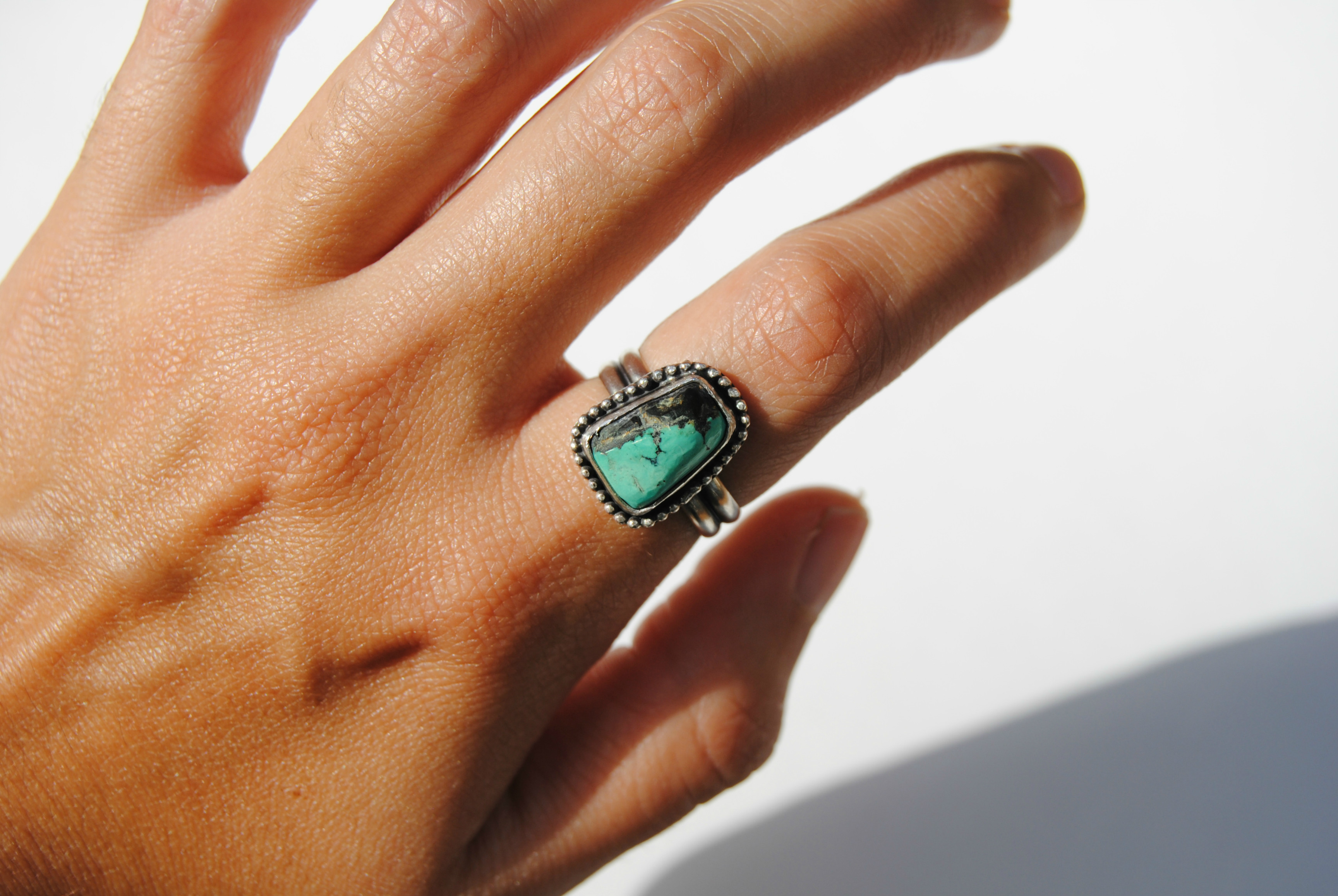 This square chunk of turquoise has been hand cut by me. It features a stunning matrix and is encased in a fine silver bezel. All other ring components are .925 sterling silver to last a lifetime. Size 6.5.