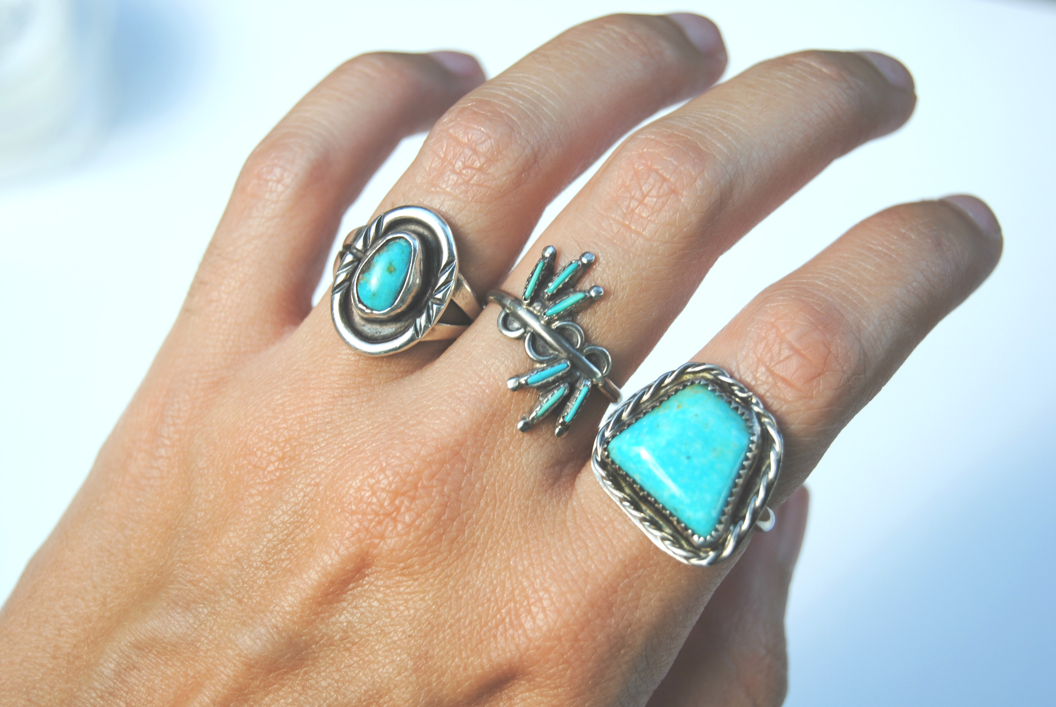 This vintage piece features six pieces of natural turquoise and is made of .925 sterling silver. Size 6.