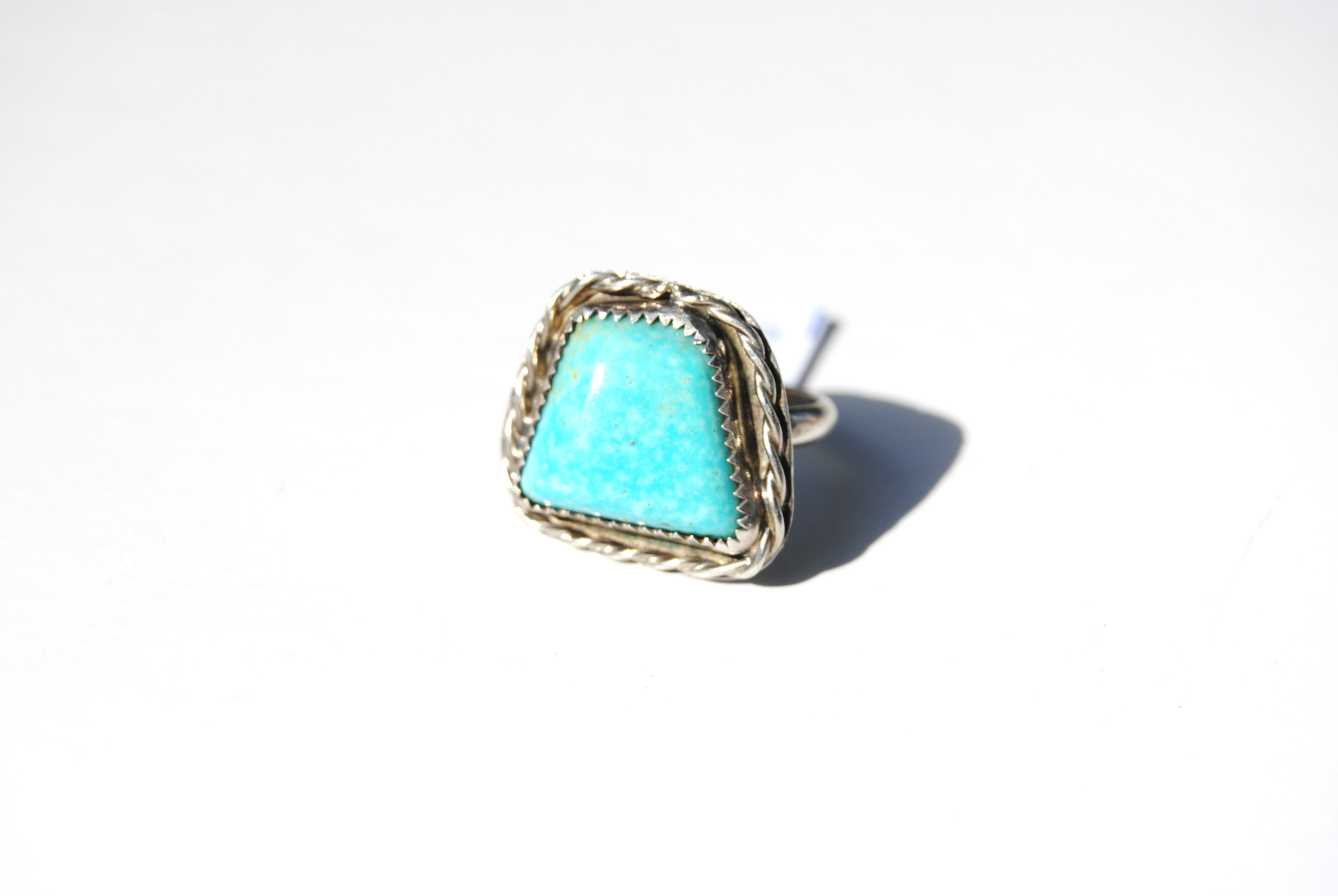 This ring features a large trapezoid-shaped chunk of turquoise and is made of .925 sterling silver. Size 5.5.