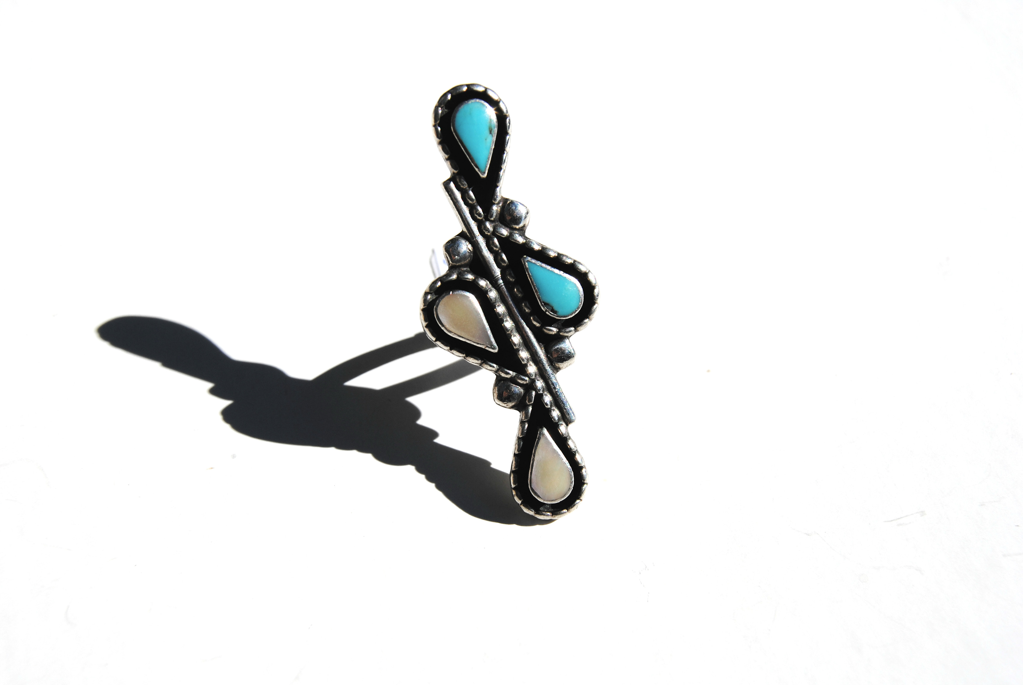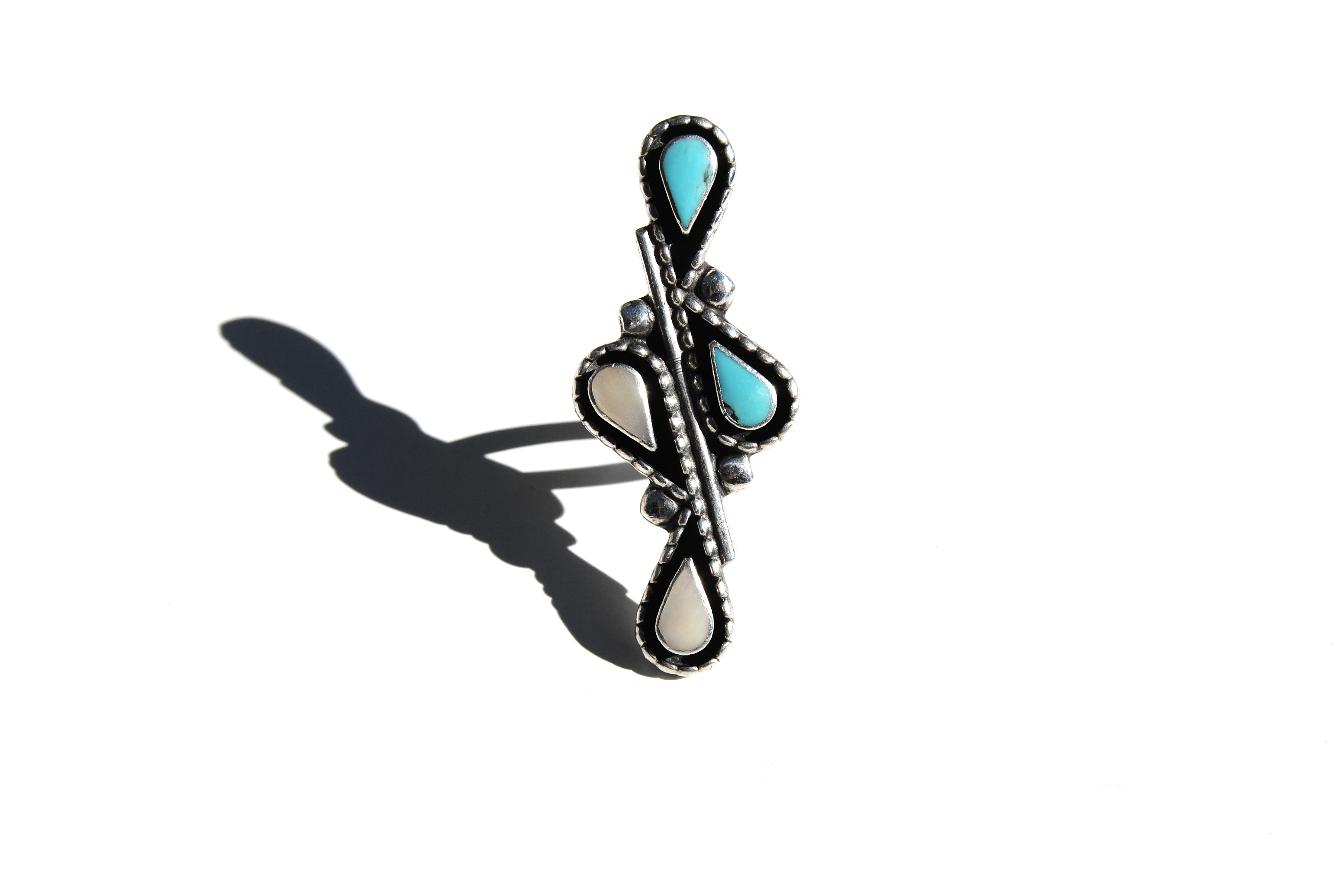 This vintage piece features drops of turquoise and mother of pearl encased in thick .925 sterling silver. Size 6.5.
