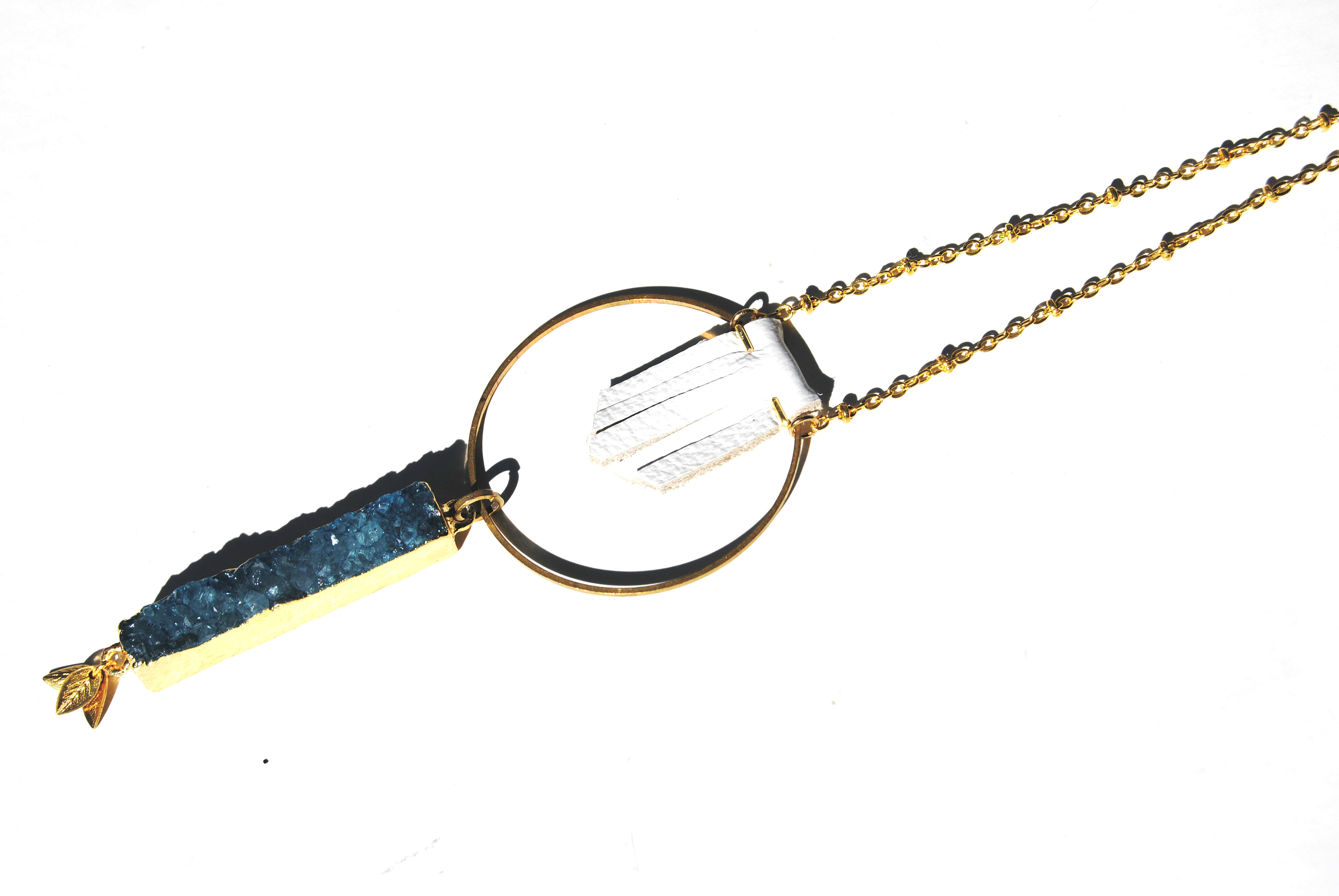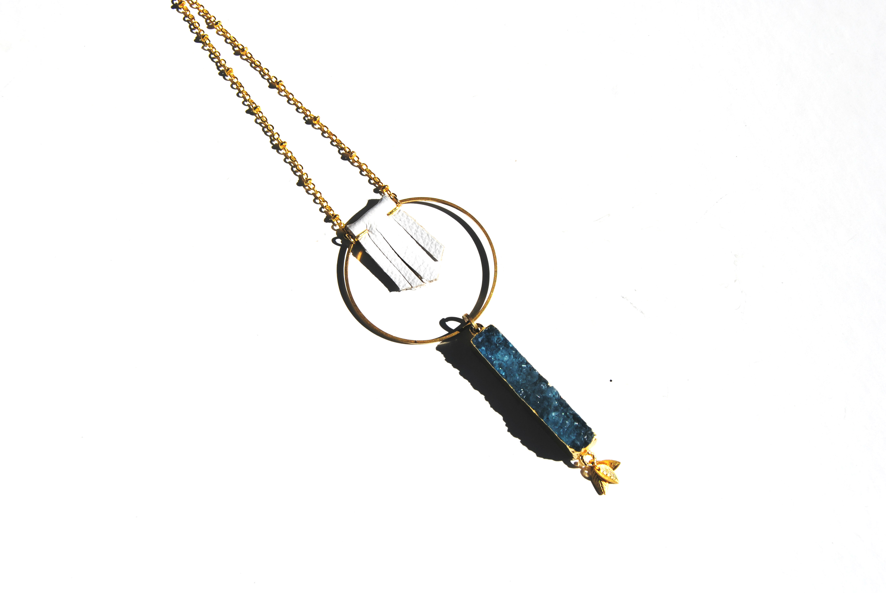 A beautiful blue druzy rectangle hangs on a raw brass ring. Features upcycled white leather fringe, brass mini leaf charms, and a gold plated chain with a lobster clasp closure. Chain measures 23 inches long. Full pendant measures 4 inches long. Druzy measures 1.5 inches long.