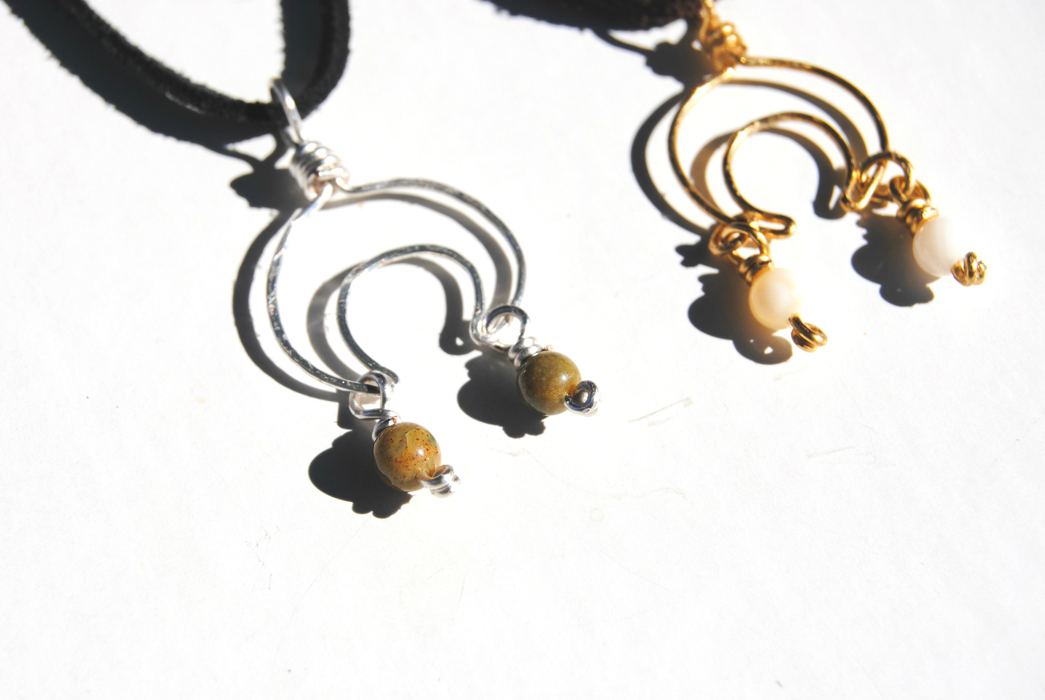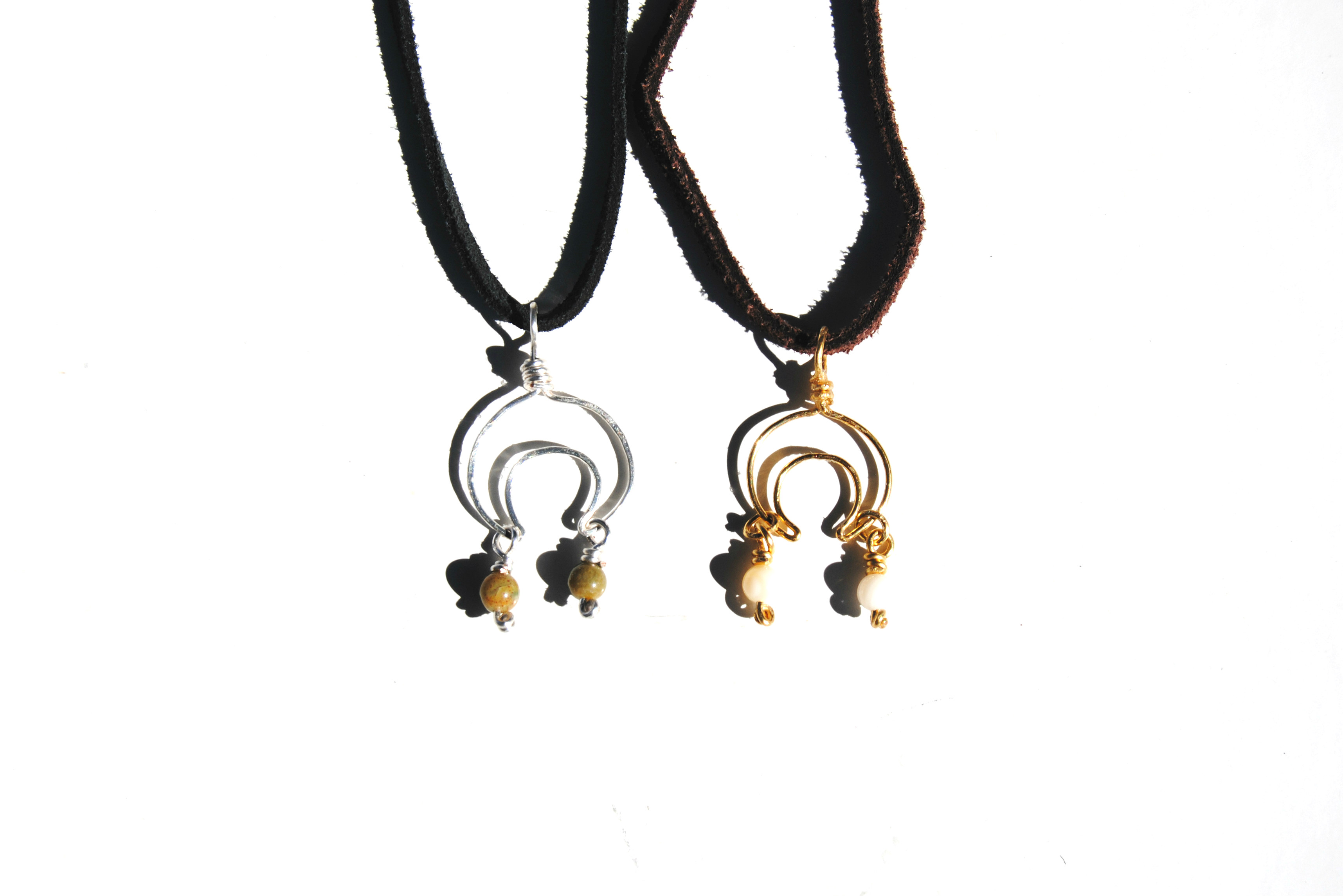 These necklaces feature an upside down crescent moon and two mini natural stone beads. Pendants measure about an inch long.