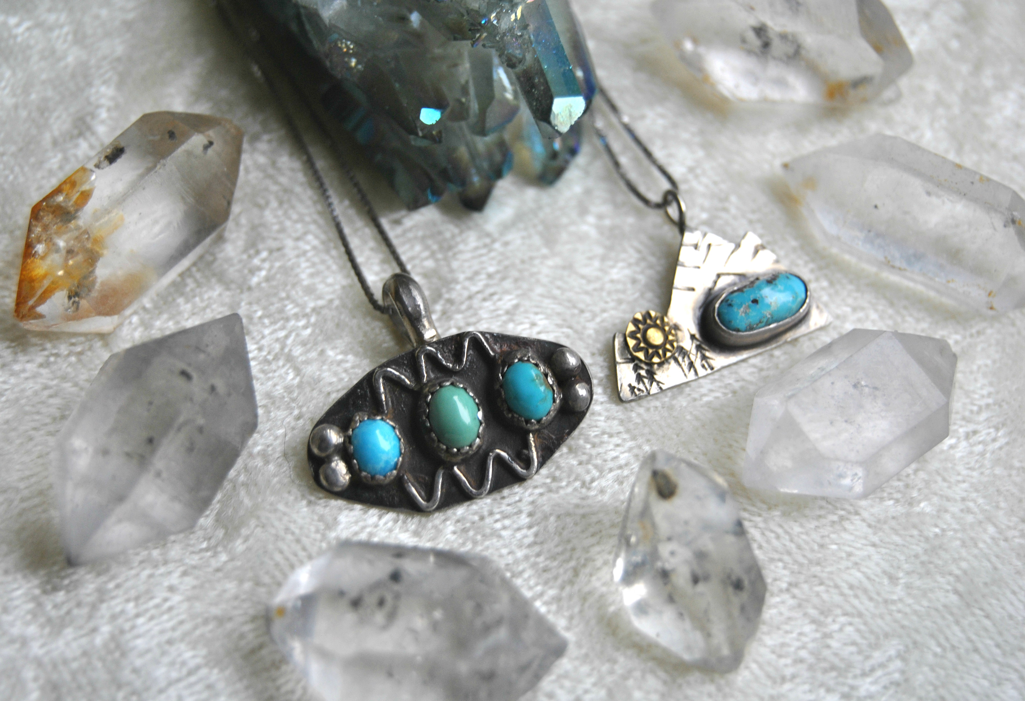 This one of a kind necklace features a natural Kingman turquoise 'lake' and a mini brass sun. It's inspired by a drive taken through the Blue Ridge Parkway almost a year ago. Made entirely of sterling silver on a 16 inch sterling silver snake chain. Measures approximately 1 inch at the widest.