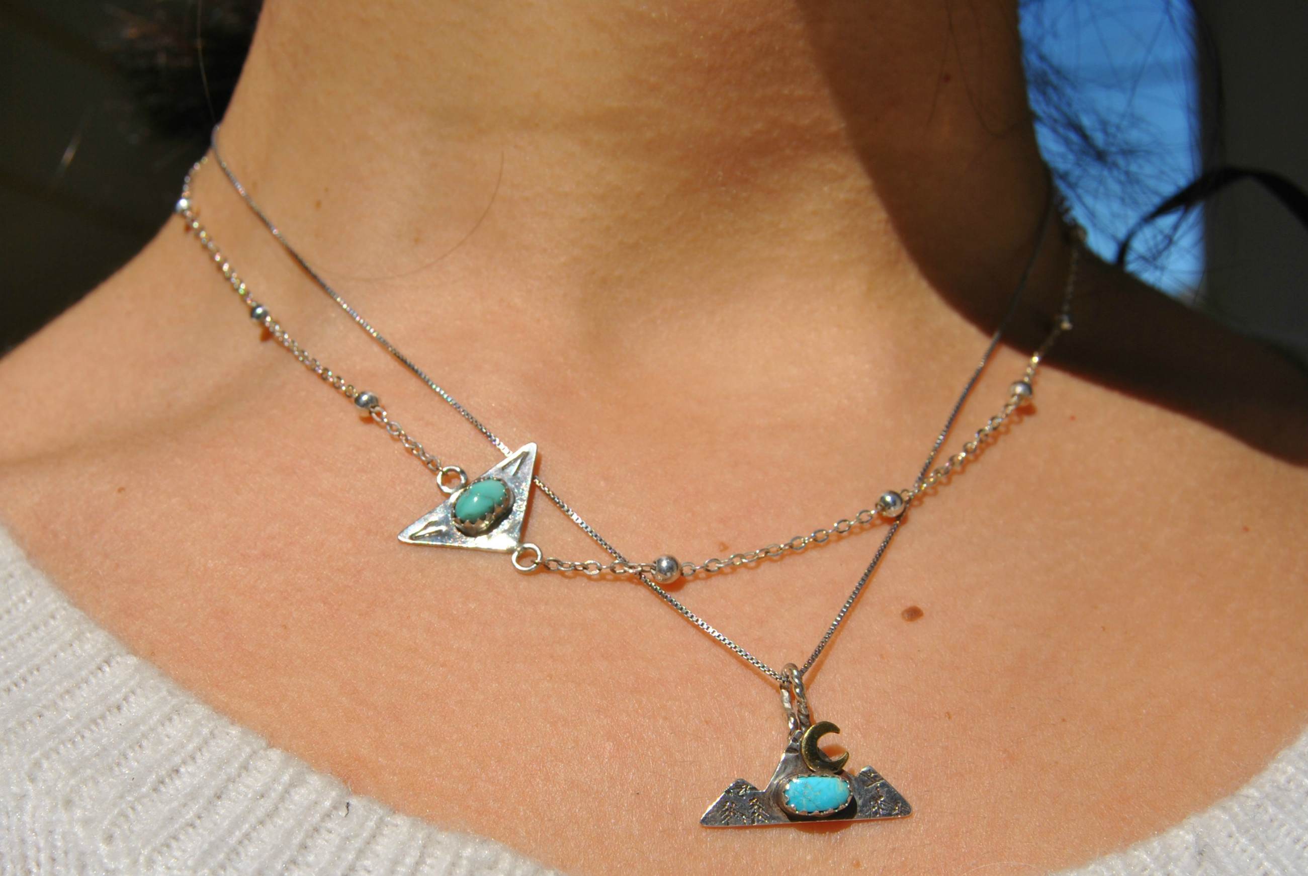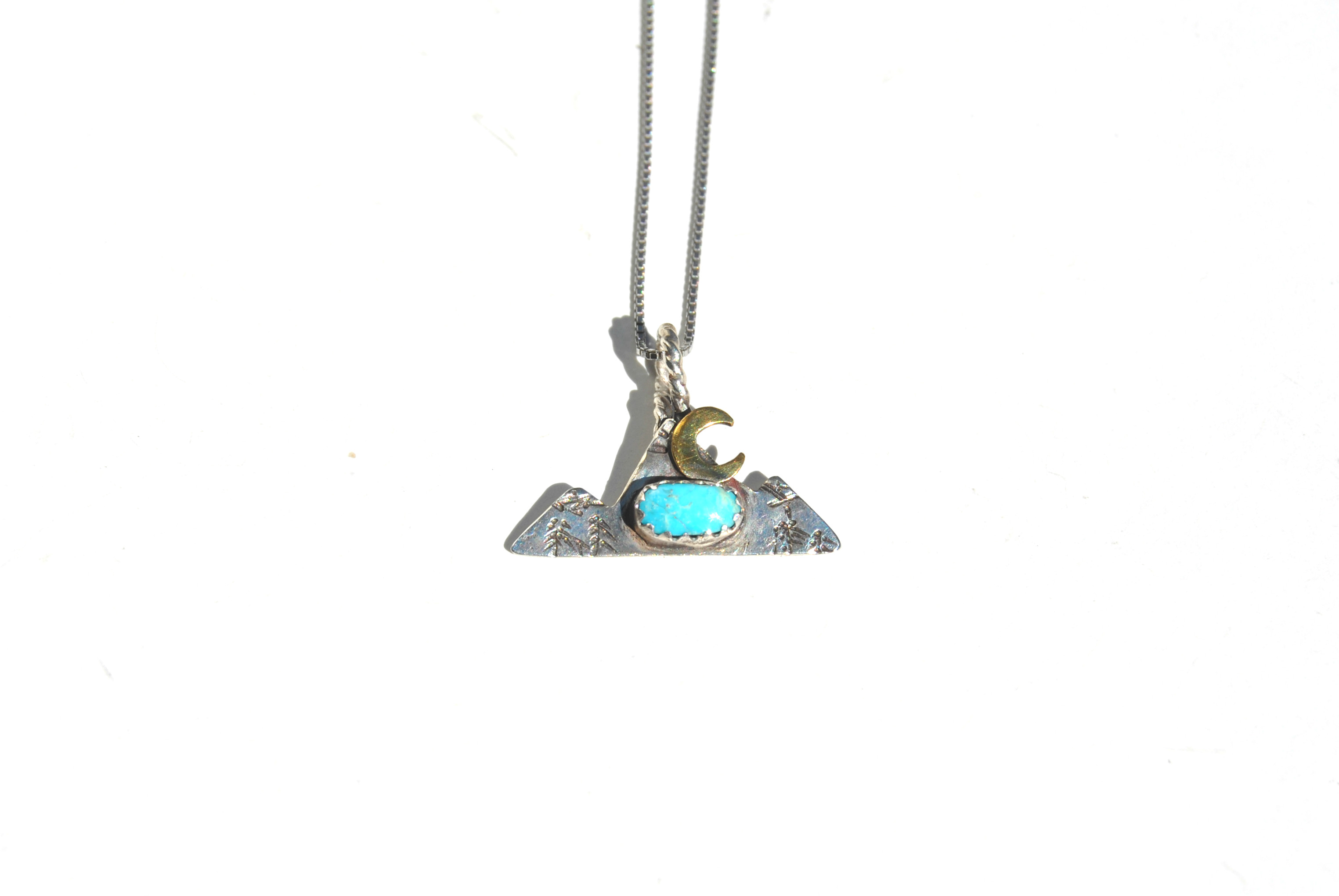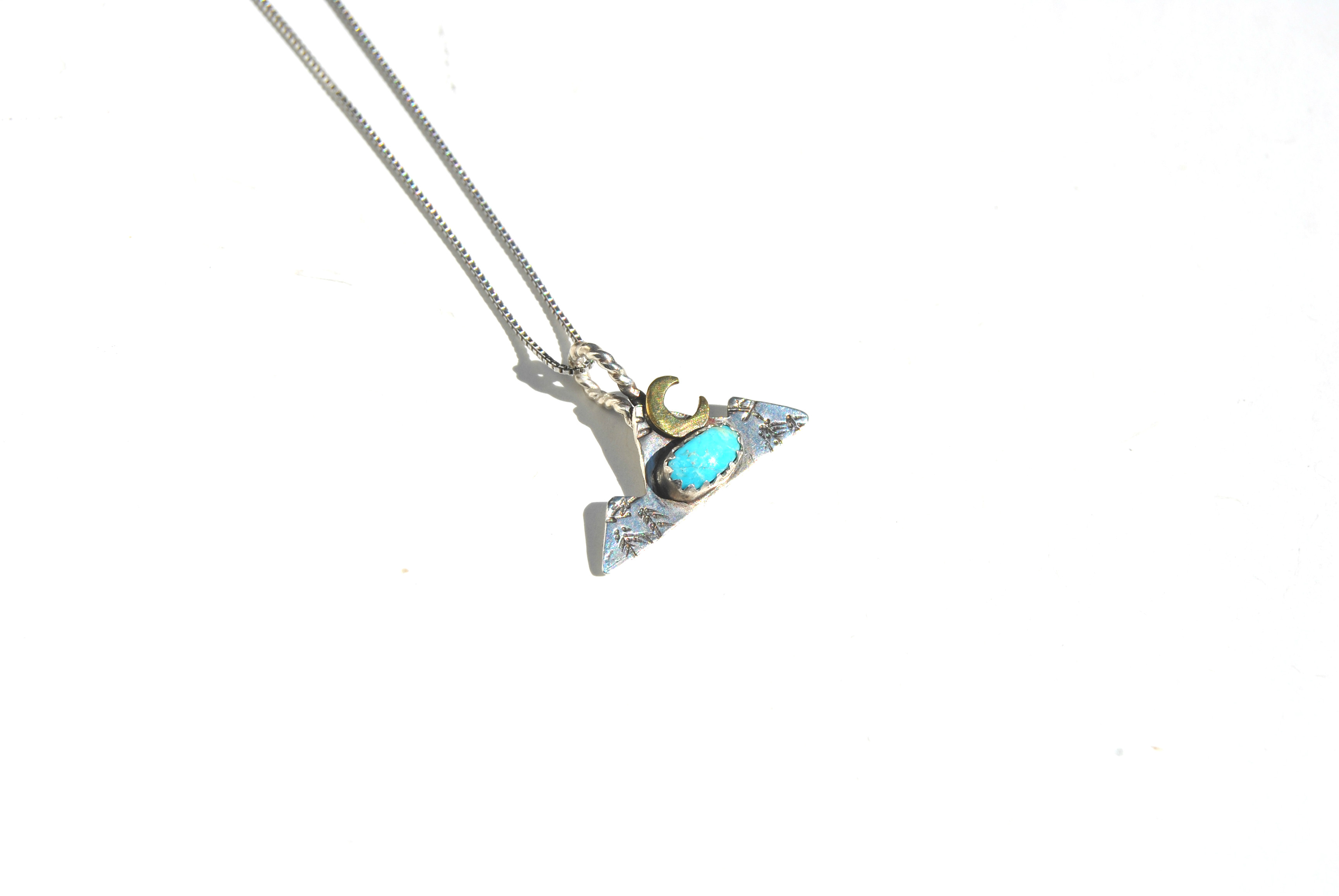 This necklace features a Kingman turquoise 'lake, and a brass mini moon. Made entirely of sterling silver on a 16 inch sterling snake chain. Measures approximately 1 inch at the widest.
