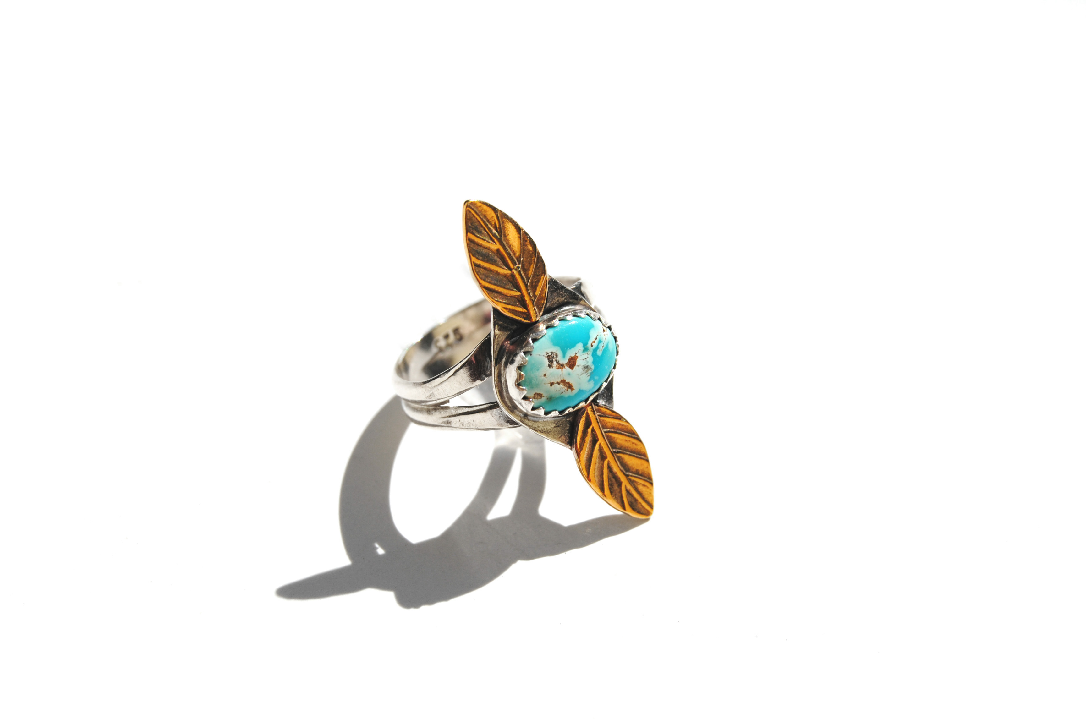 An oval piece of Kingman turquoise is set in between two vintage brass leaf stampings. Features a fine silver bezel, .925 sterling silver backing and band. Size 5.