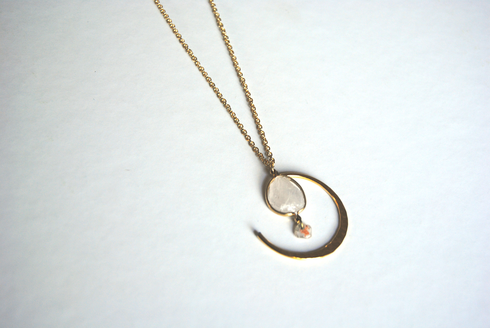 Gold crescent with a framed rose quartz crystal hanging in the center. Features an 18 inch long gold plated chain and lobster clasp closure. Crescent measures about 2.5 inches in length