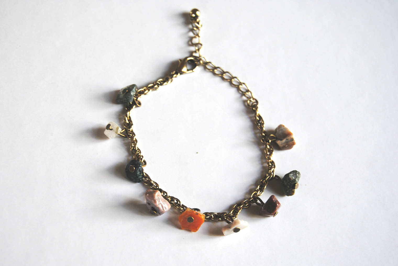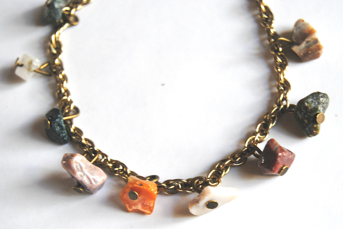 Nine natural, multicolored ocean jasper charms hang on a bronze toned bracelet.