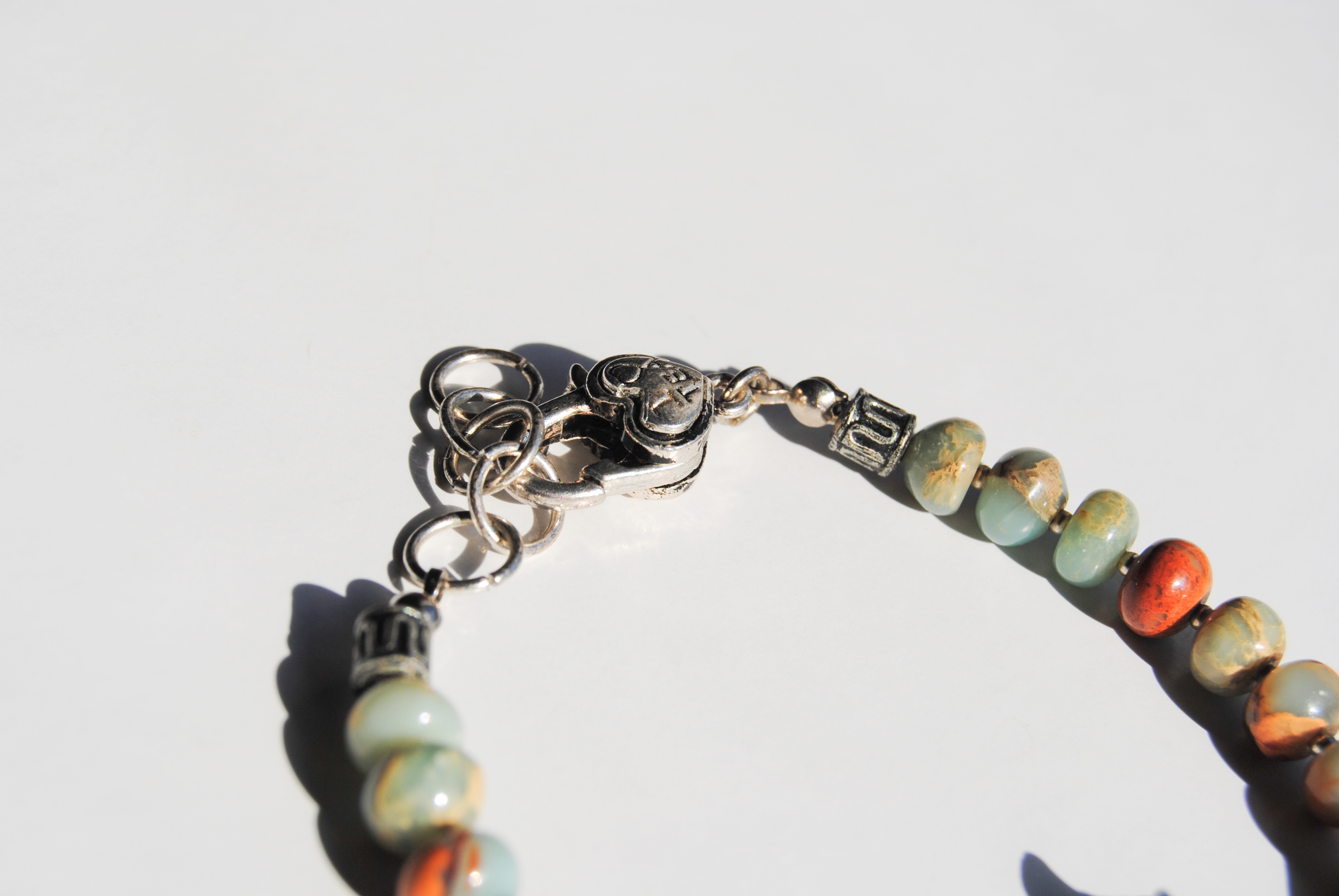 Featuring a silver hamsa charm and snake skin jasper beads, along with silver bead accents and a lobster clasp closure that reads "I <3 tea".