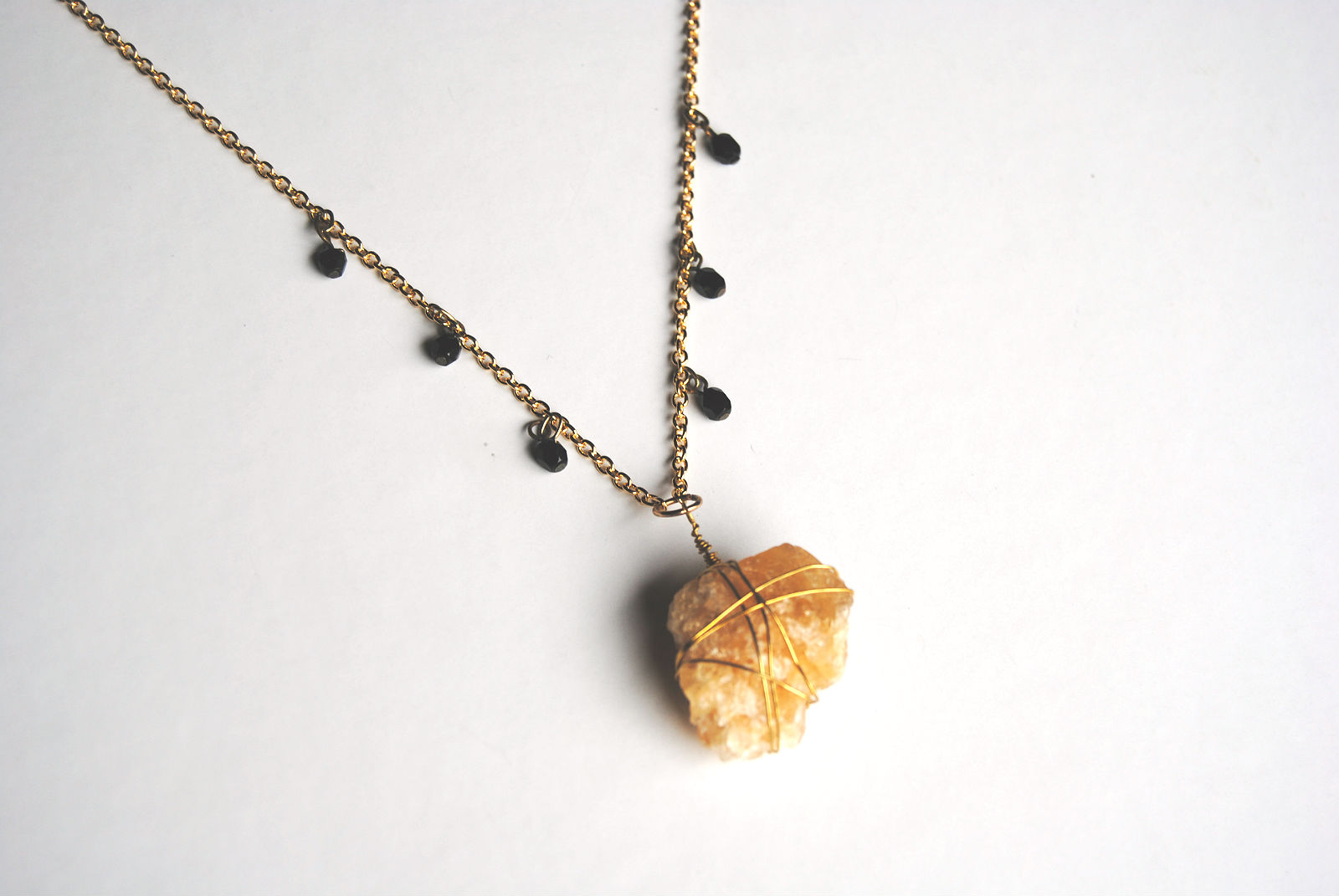 This gold wire-wrapped, rough cut, citrine quartz crystal measures approximately an inch in length and about 0.5 of an inch in width. Features mini black faceted bead accents, a gold plated chain, and lobster clasp closures.