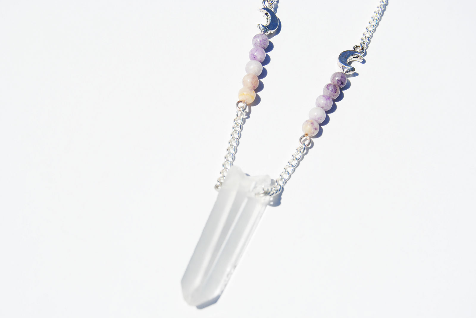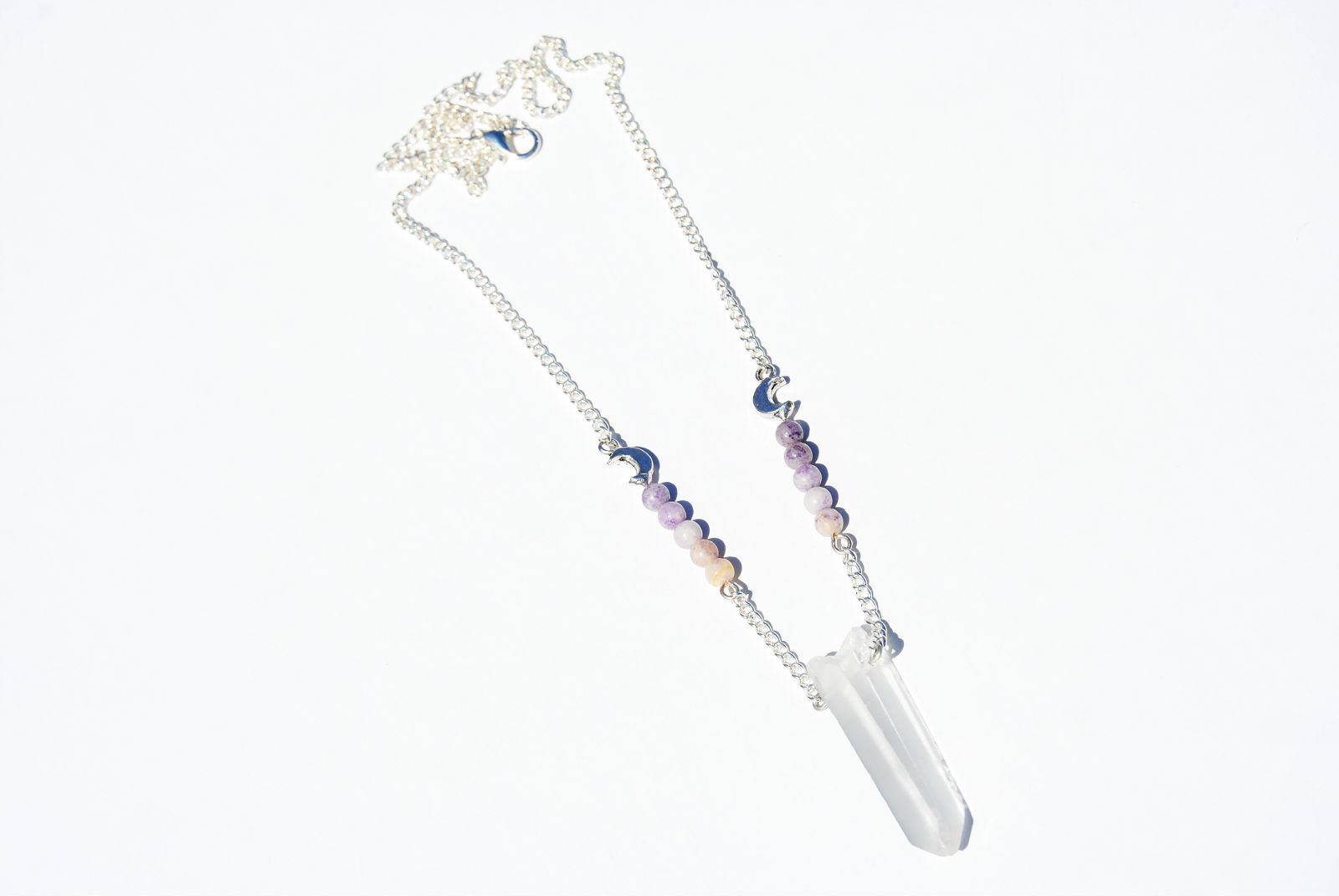 A natural quartz crystal point hangs beneath two columns of dog tooth amethyst beads. Features two mini moon charms, an 18 inch silver plated curb chain and lobster clasp closure.