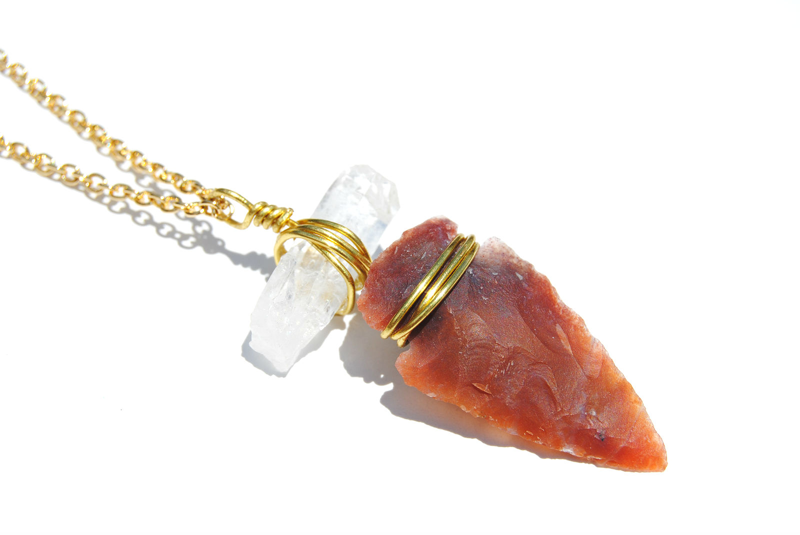 A red agate arrowhead hangs beneath a gold wire wrapped clear quartz crystal. Hangs on a 24 inch gold plated chain with gold plated lobster clasp closures.