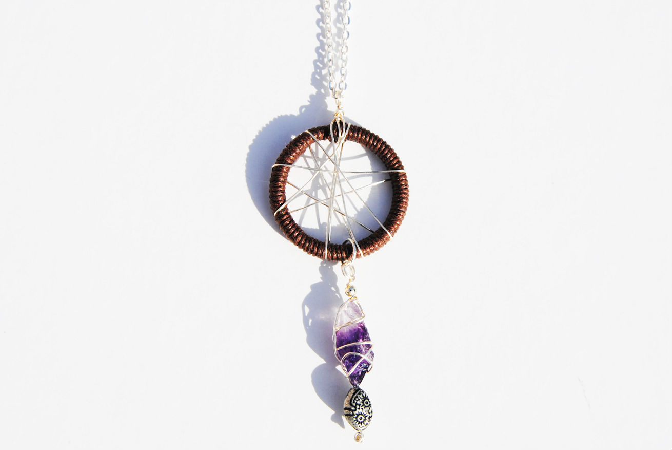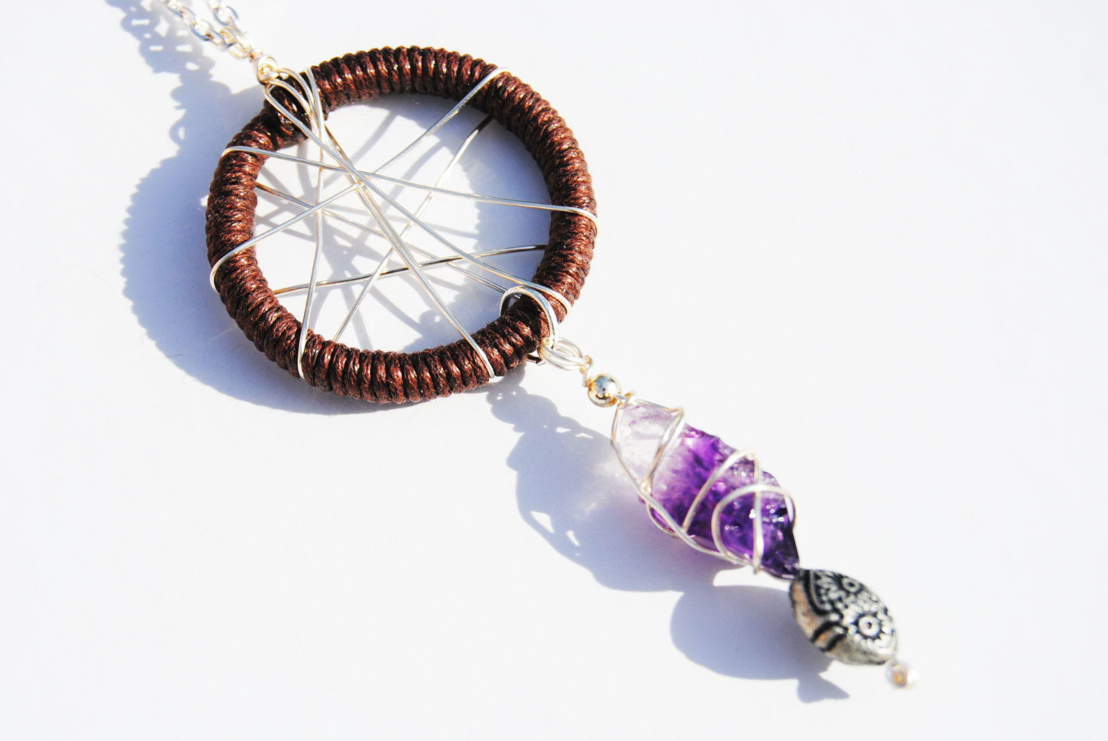 A natural Uruguayan amethyst point hangs beneath a handmade dream catcher. Silver plated chain measures approximately 20 inches in length. Lobster clasp closure.