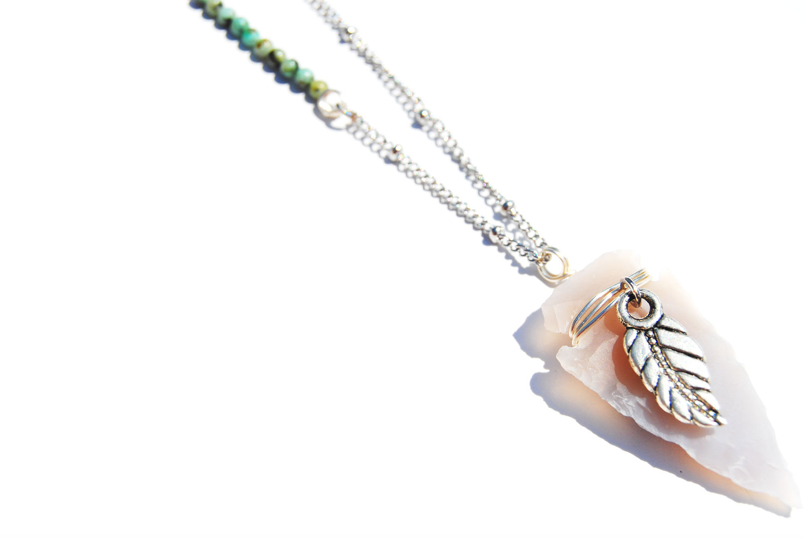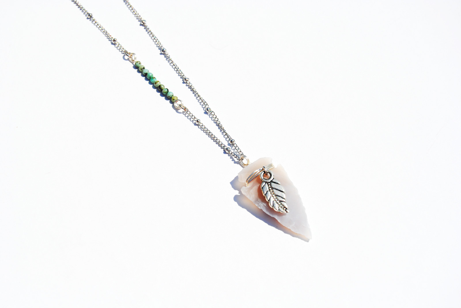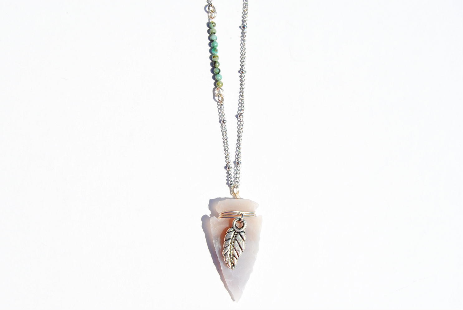 A carefully wire-wrapped, grey toned, Indian agate arrowhead hangs on an 18-22 inch stainless steel knot chain. Features a silver toned leaf charm, turquoise mini bead accent, and lobster clasp closure.