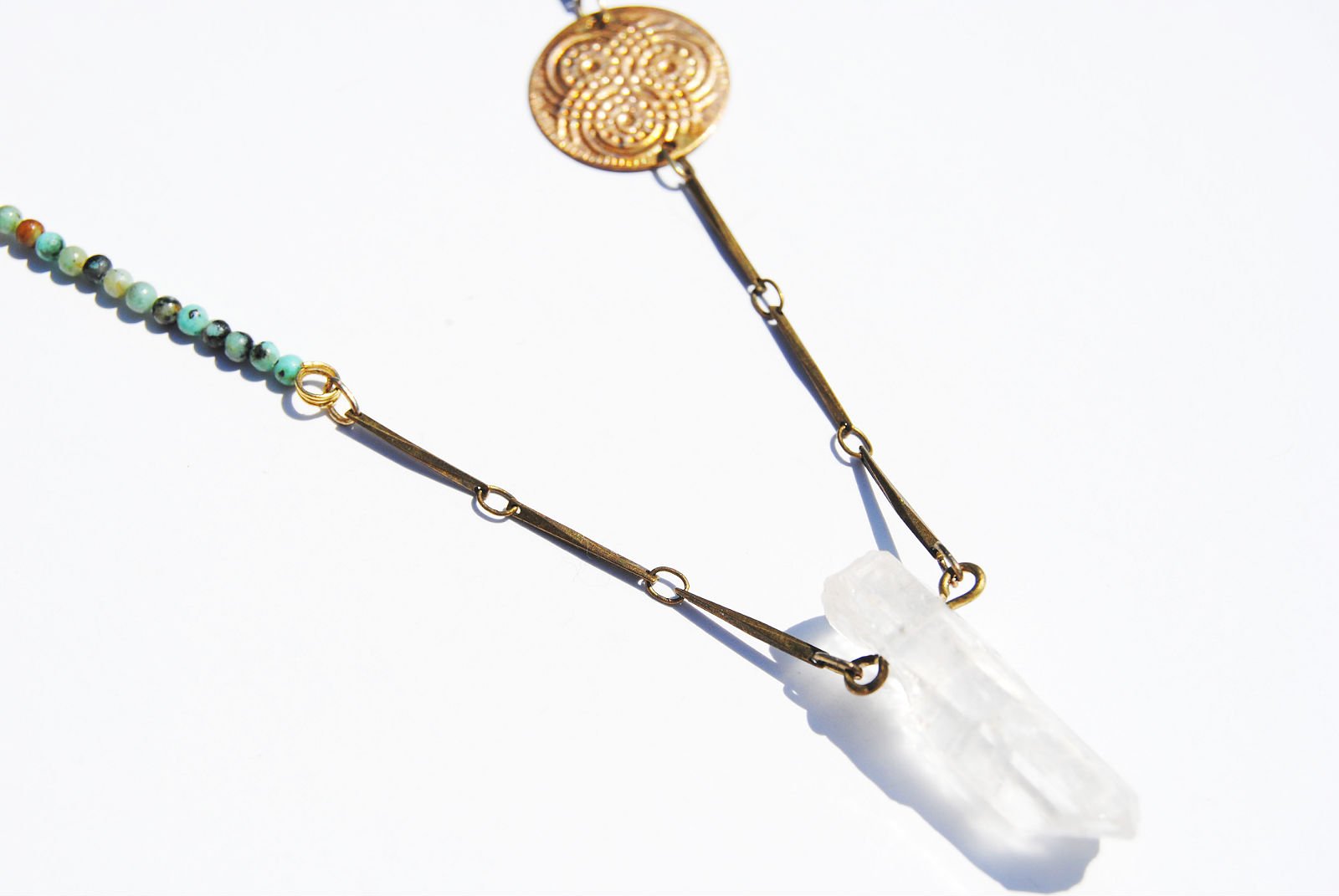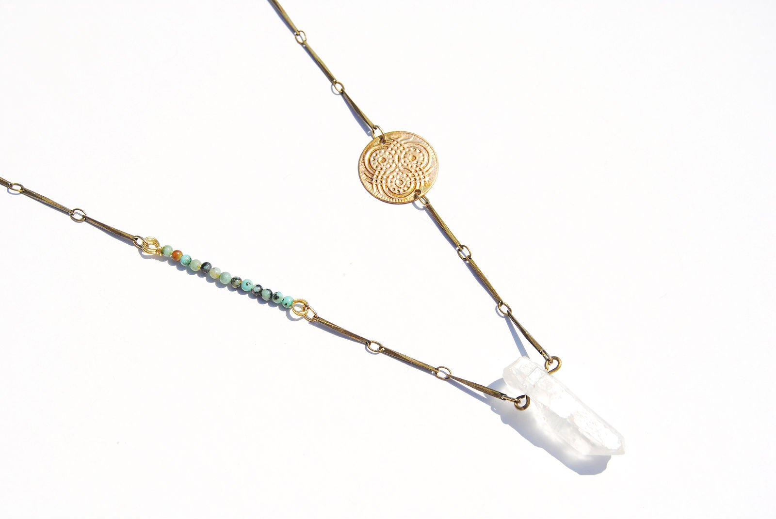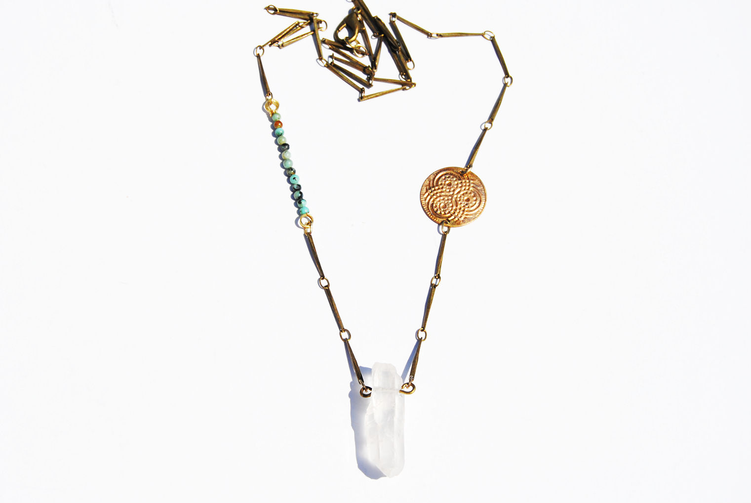 A natural quartz crystal hangs on a 21 inch brass toned flat chain. Features a turquoise mini bead accent and a gold tone flower of life coin charm.