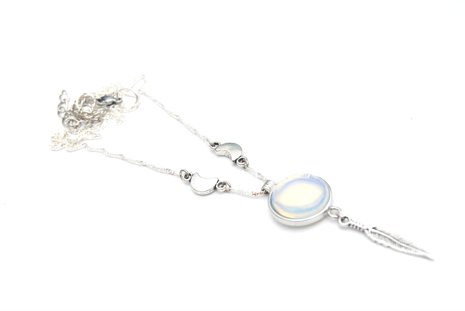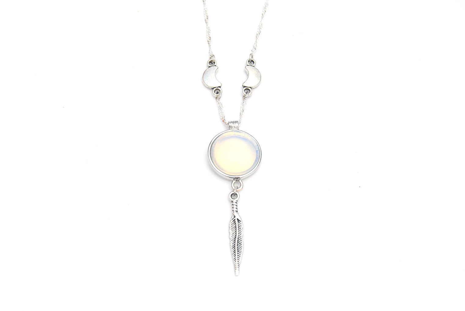 A bezeled opalite glass cab hangs in between two cresent moons and a feather charm. On a silver plated 17-23 inch long snake chain with lobster clasp closure.