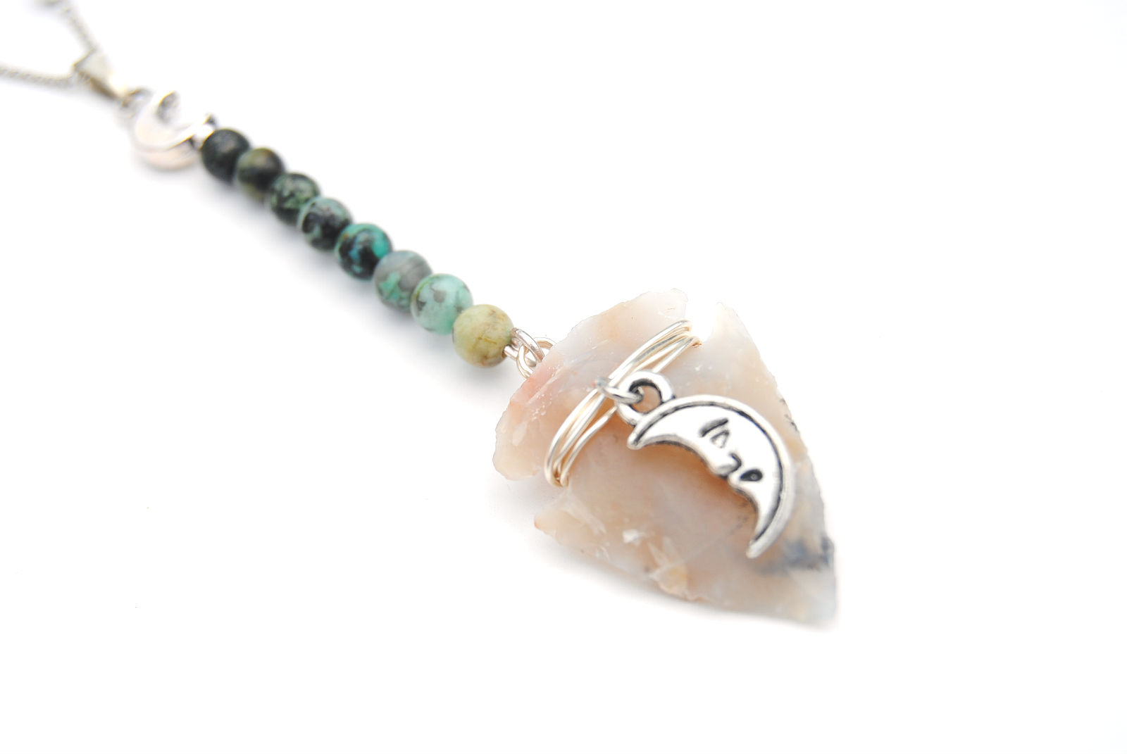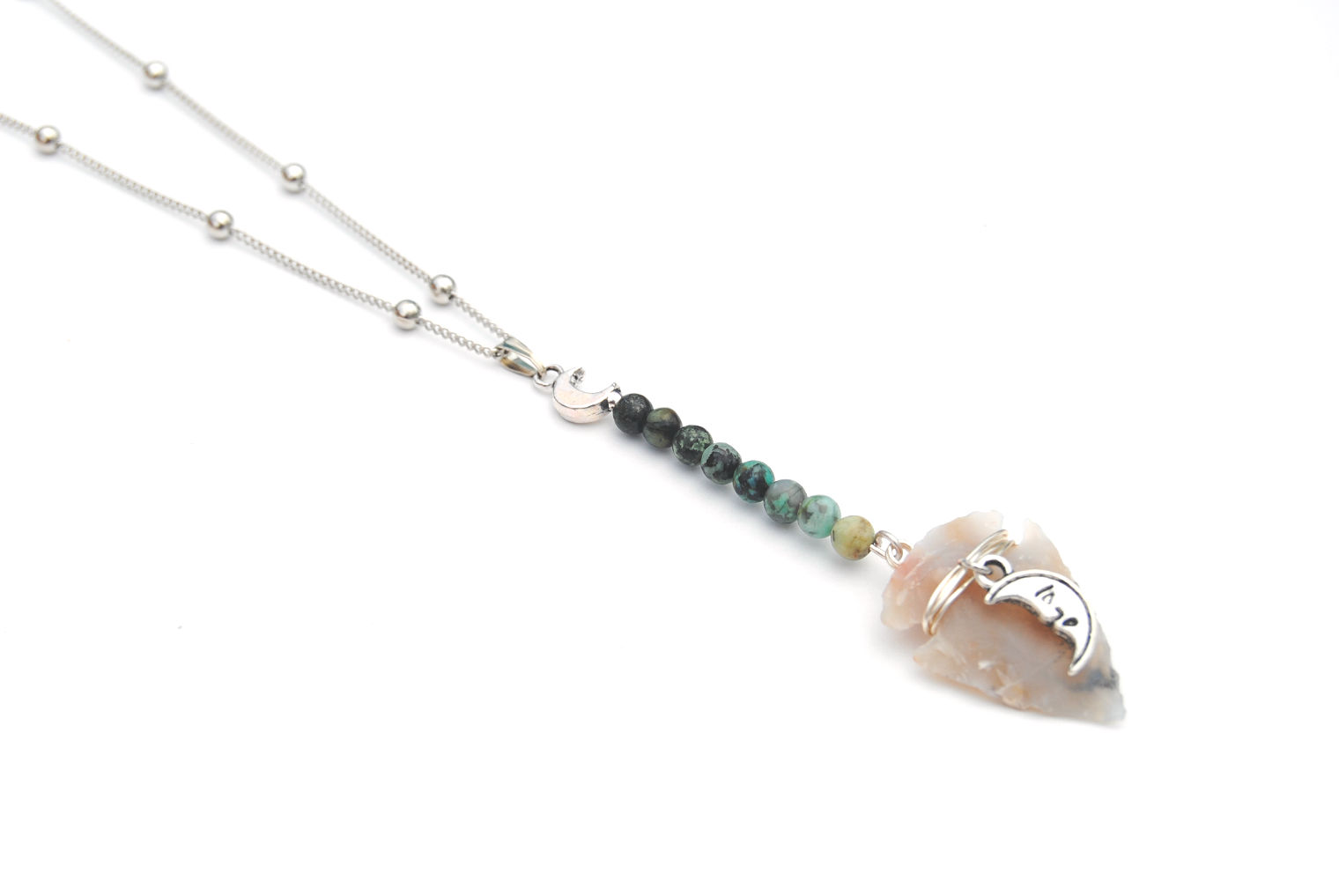 This necklace features a set of eight African turquoise mini beads lined up in a gradient beneath a mini moon charm, along with a 1 inch grey Indian agate arrowhead and silver moon. Hangs on a silver plated 21-24 inch chain and has lobster clasp closure.