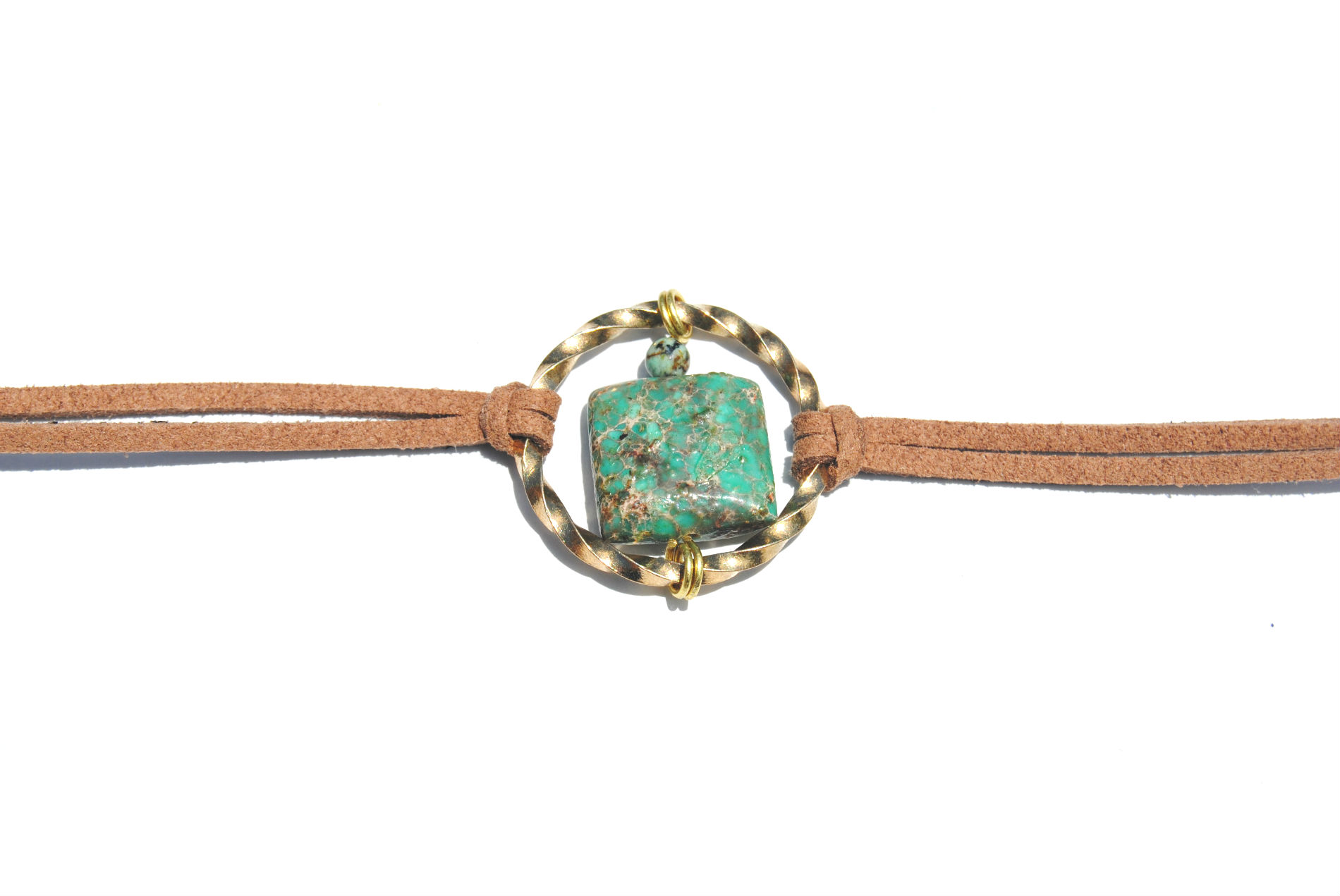 A turquoise sea sediment jasper square sits inside of a 1 inch diameter vintage golden circle. Features one African turquoise mini bead, a faux brown leather cord, and gold plated lobster clasp closure. Measures 8.25-10 inches in length.