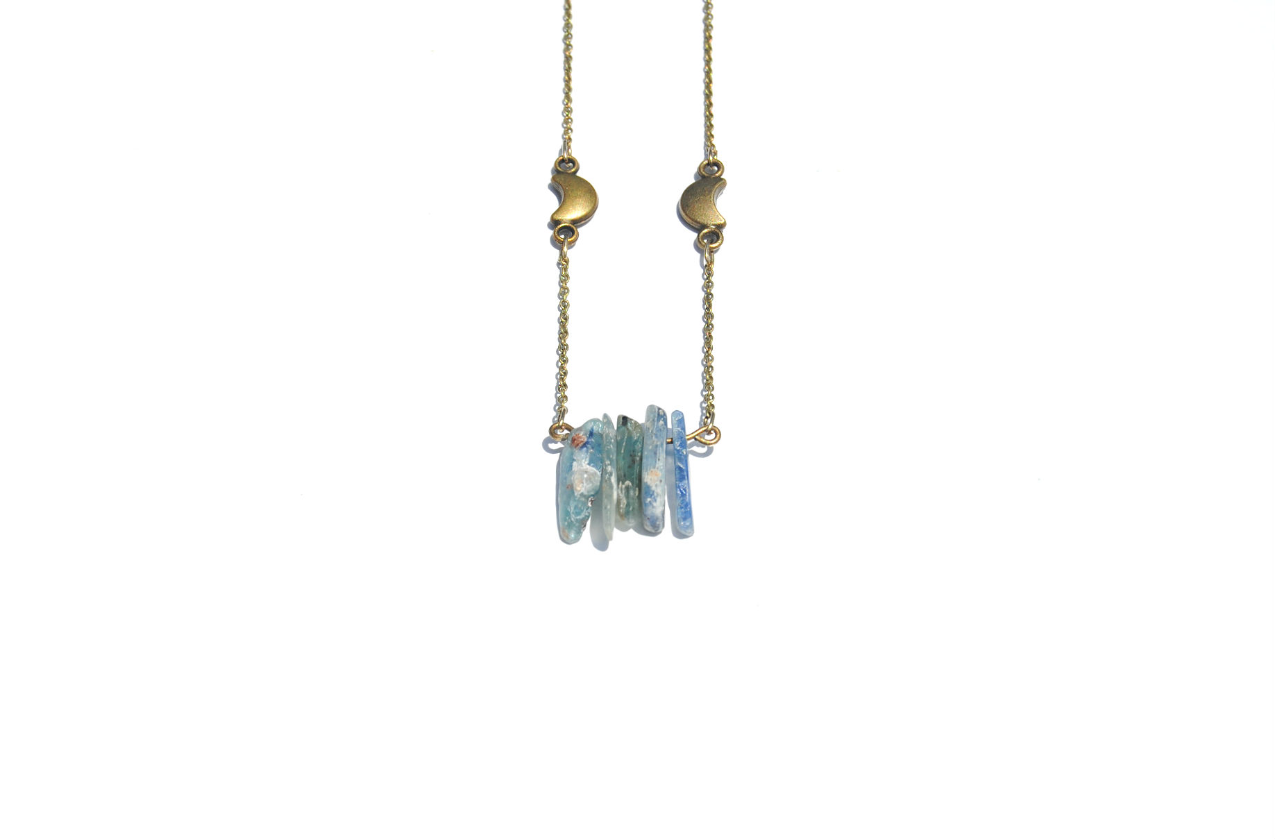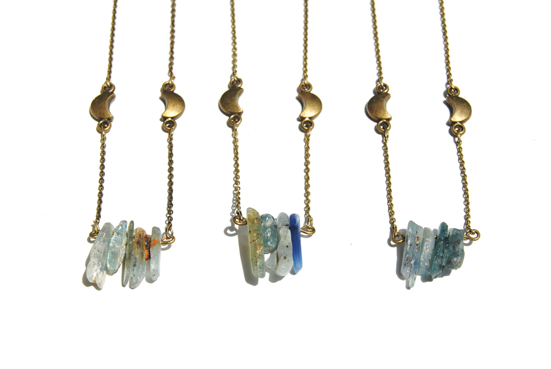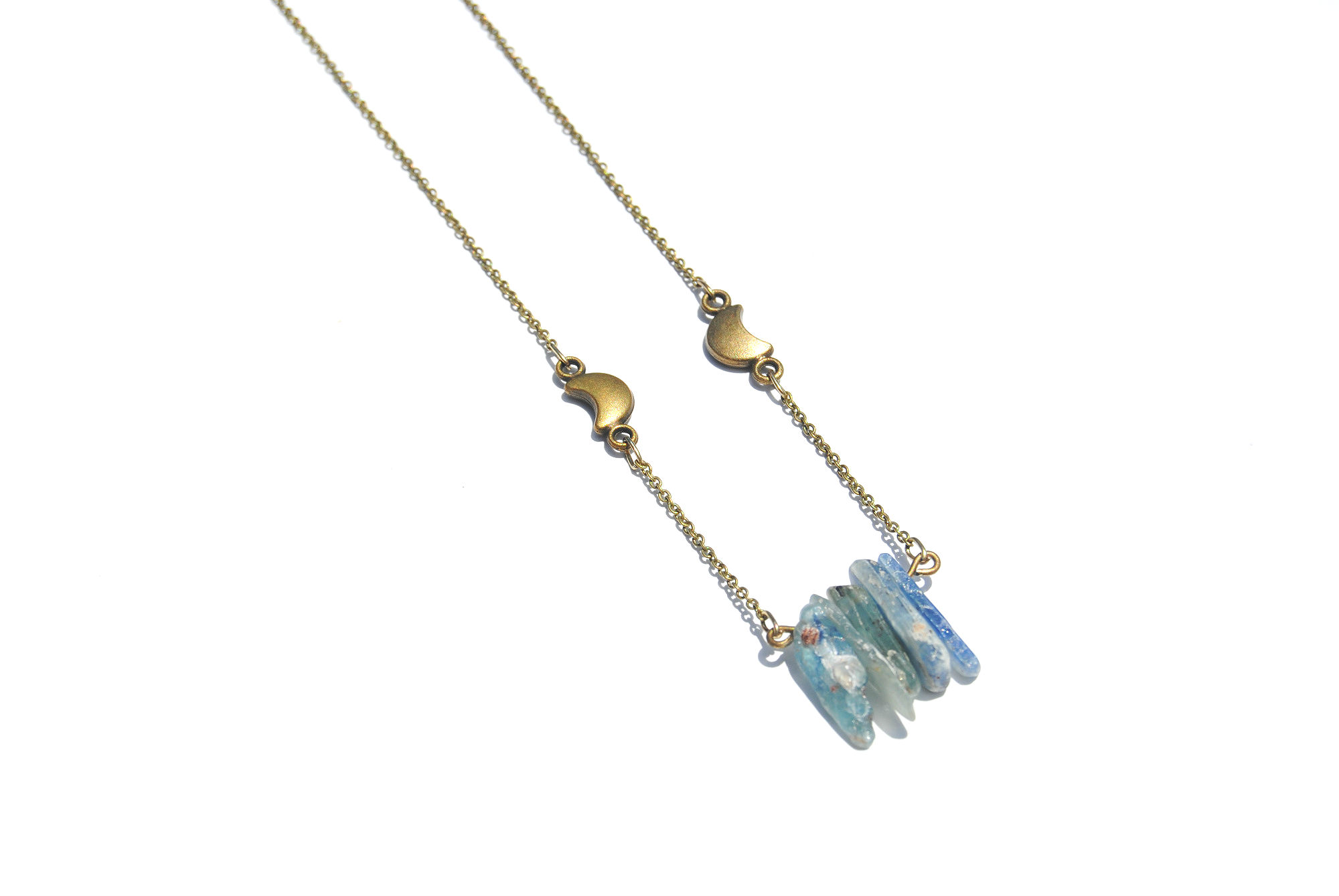 Natural blue kyanite beads hang on a 16-17 inch brass chain. Features two mini moon charms and lobster clasp closure. Kyanite crystals pendant measures 0.75 inches long.