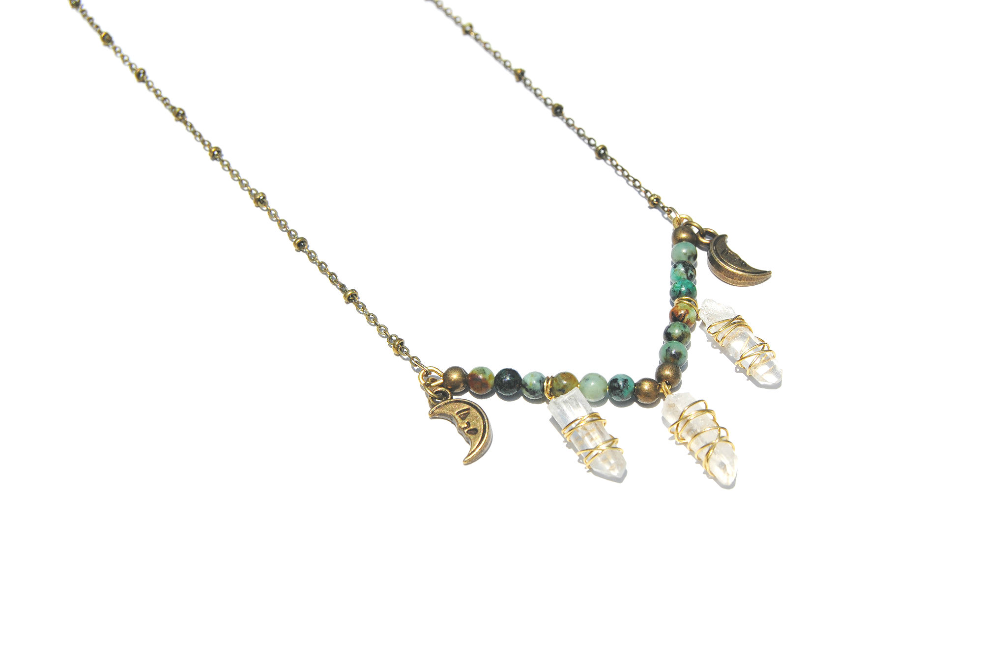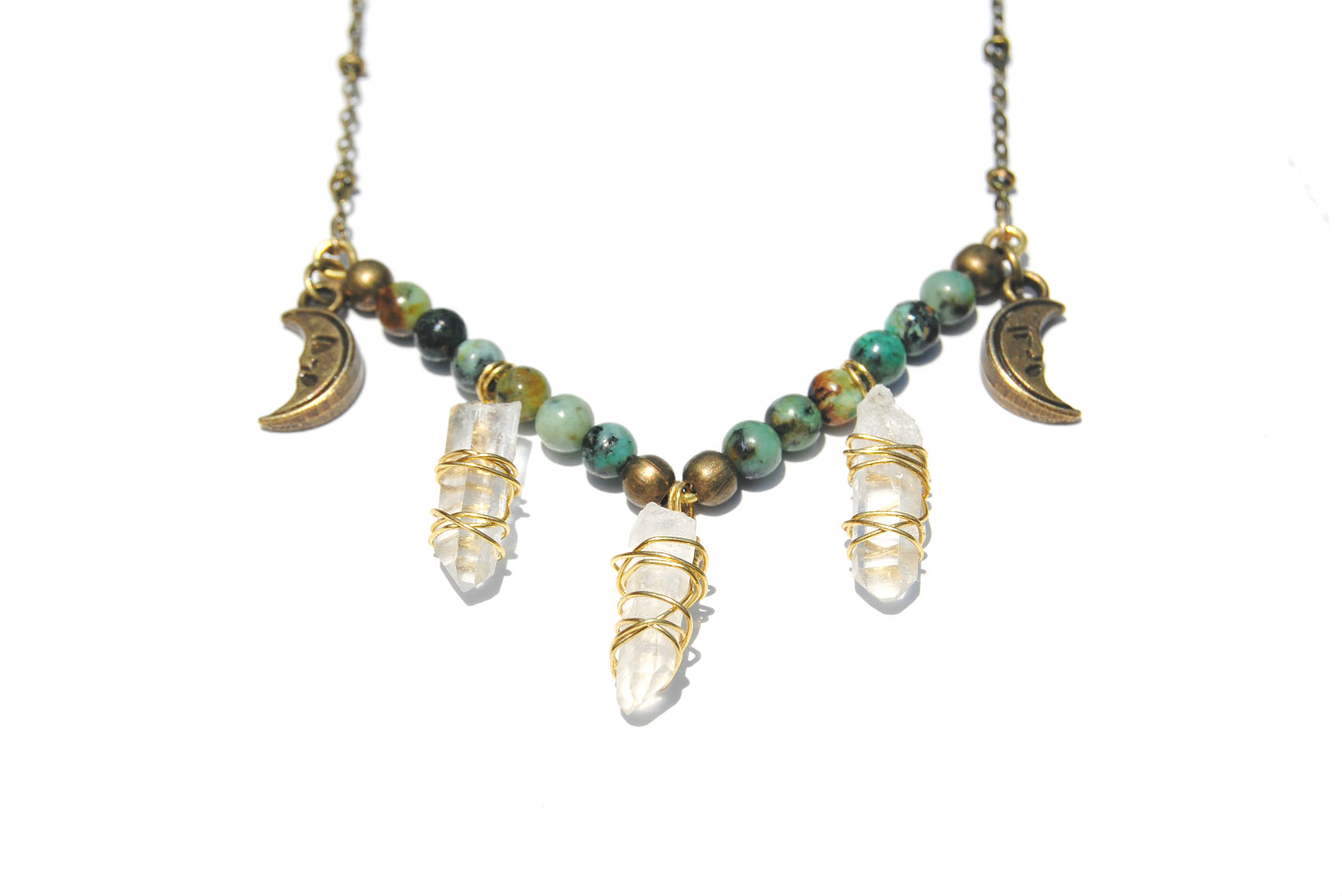 Three natural mini quartz crystal points are wire-wrapped and hung between African turquoise beads. Features two mini moon charms, a 24 inch long bronze toned copper chain, and a lobster clasp closure.